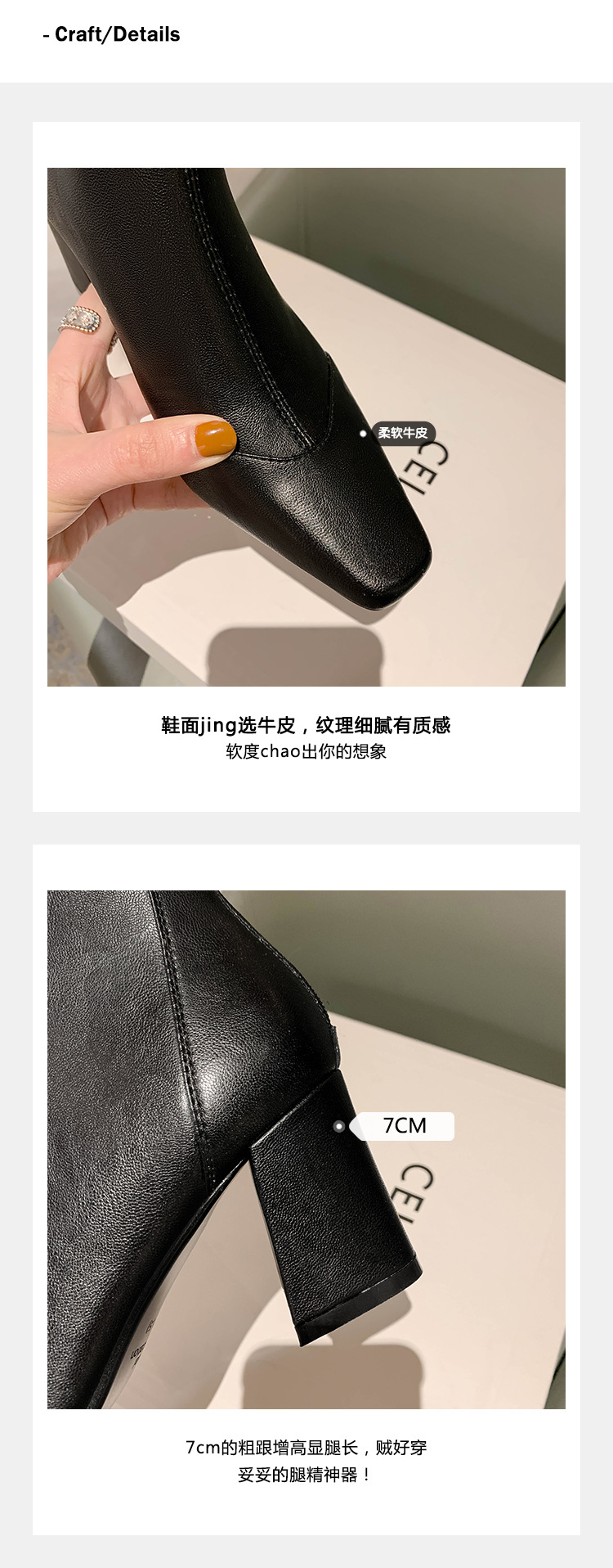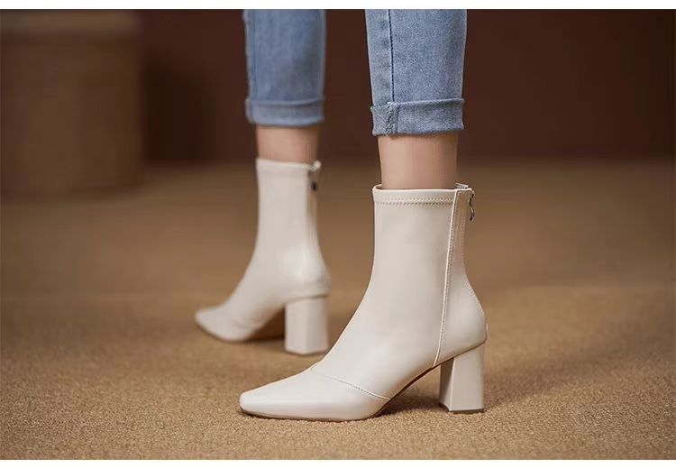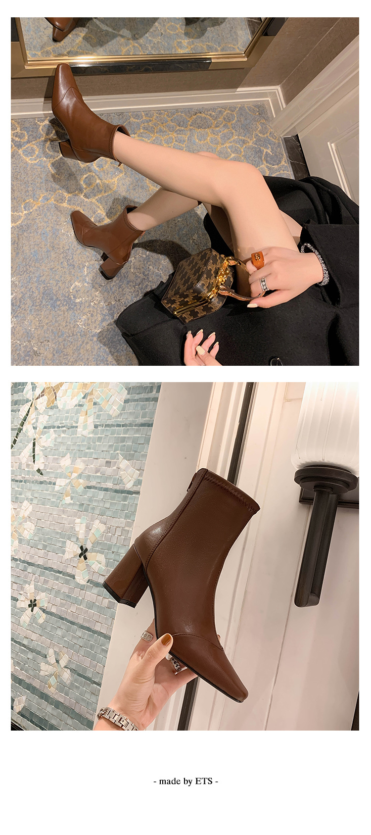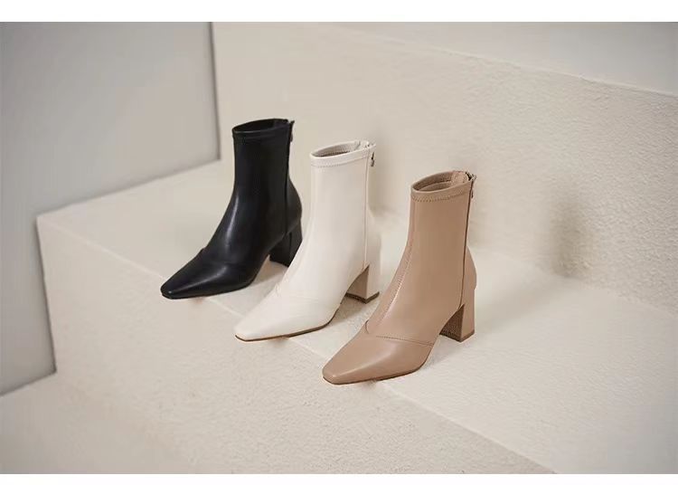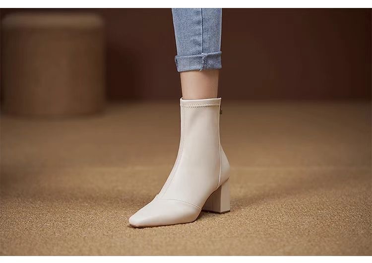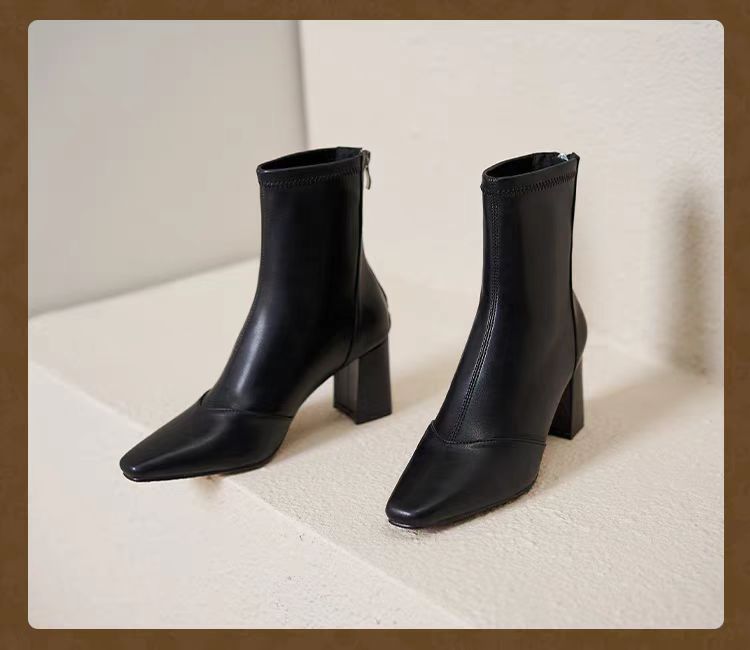 2024 봄과 가을 새로운 여성 부츠 프랑스 뾰족한 발목 부츠 여성용 하이힐 두꺼운 힐 소프트 가죽 리어 지퍼 기모 스키니 부츠스토어 가기