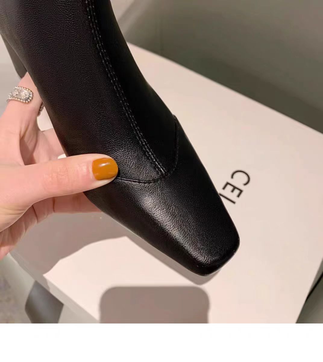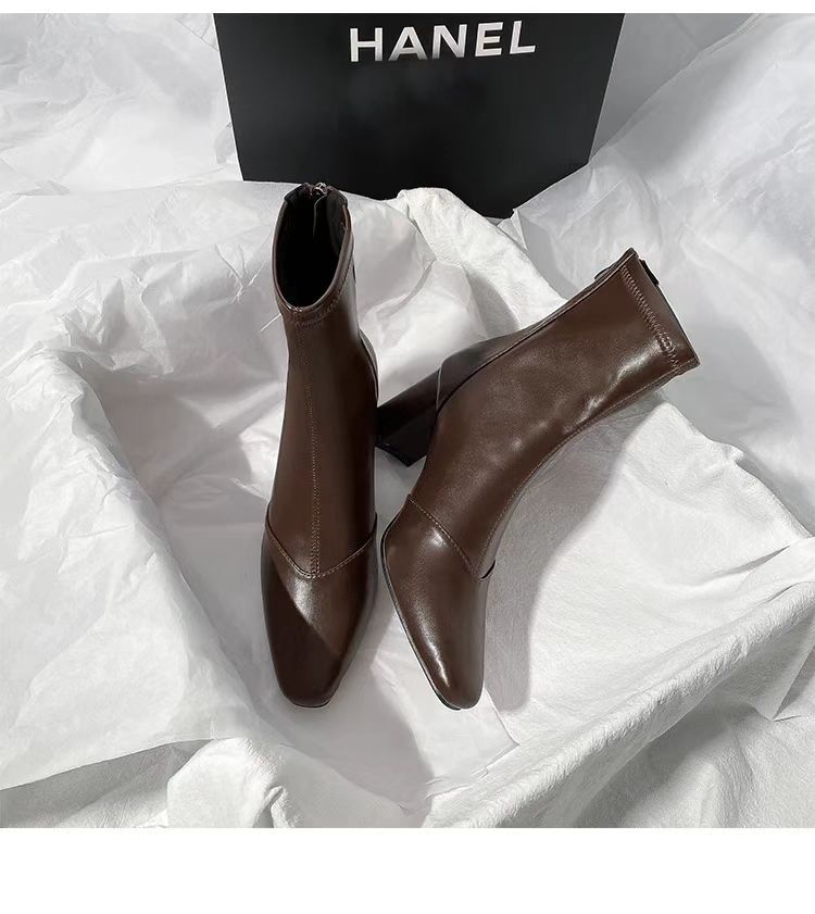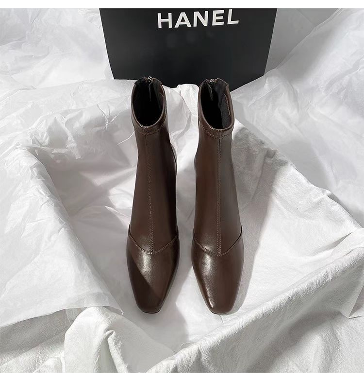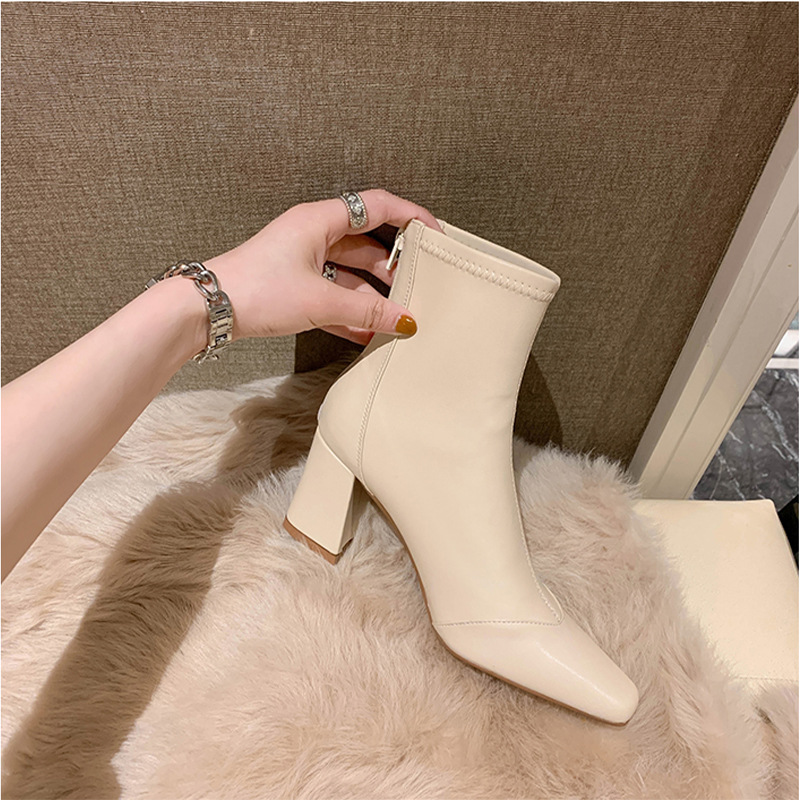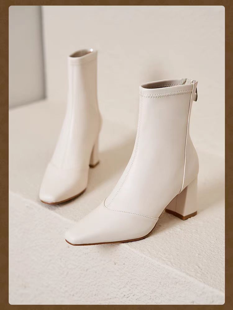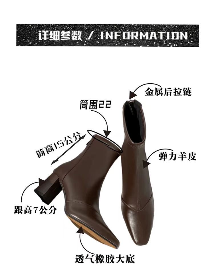 2024 봄과 가을 새로운 여성 부츠 프랑스 뾰족한 발목 부츠 여성용 하이힐 두꺼운 힐 소프트 가죽 리어 지퍼 기모 스키니 부츠스토어 가기