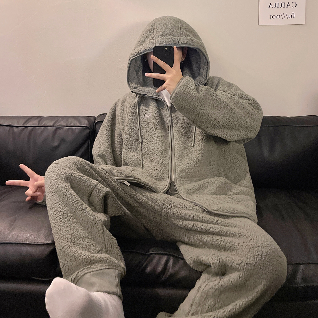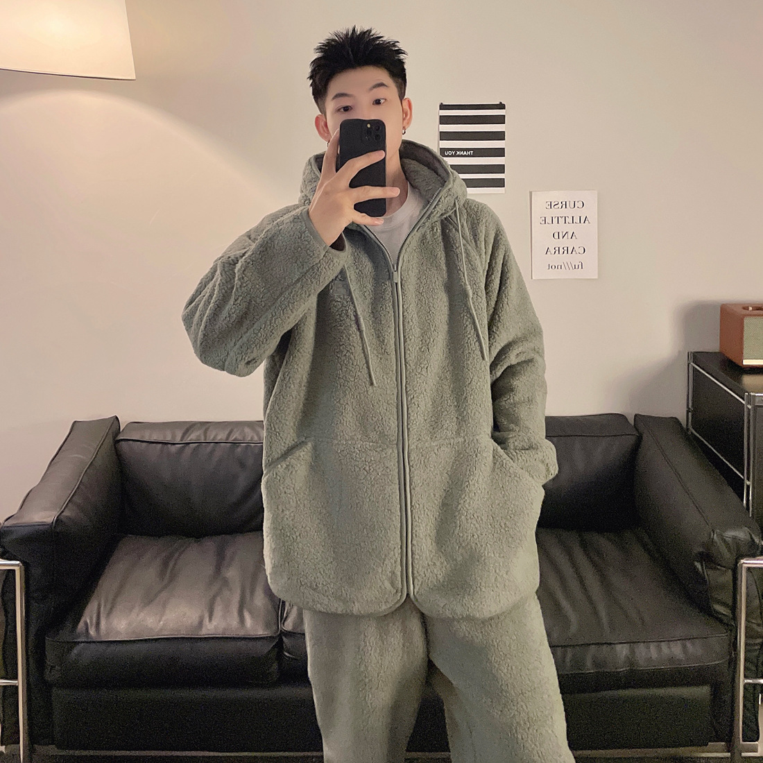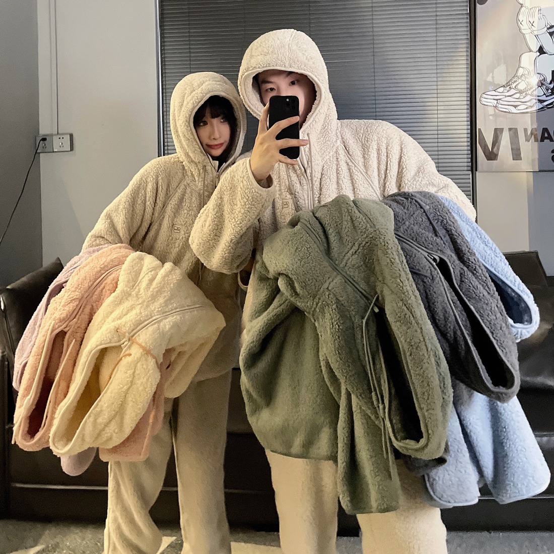 남자를위한 양가죽 후드 파자마 세트 겨울 두꺼운 기모 커플 여성용 따뜻한 옷 플러스 사이즈 홈 옷스토어 가기