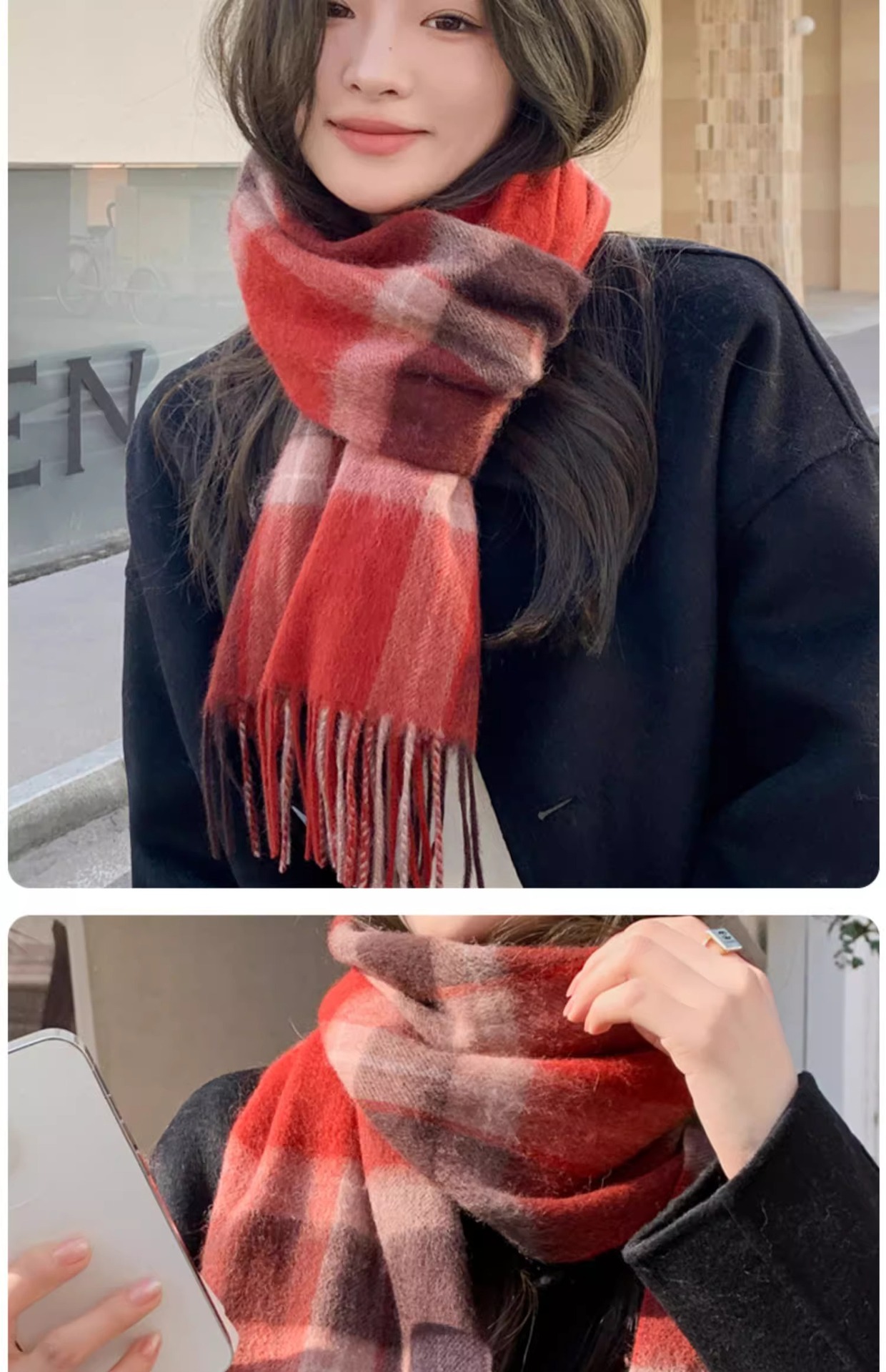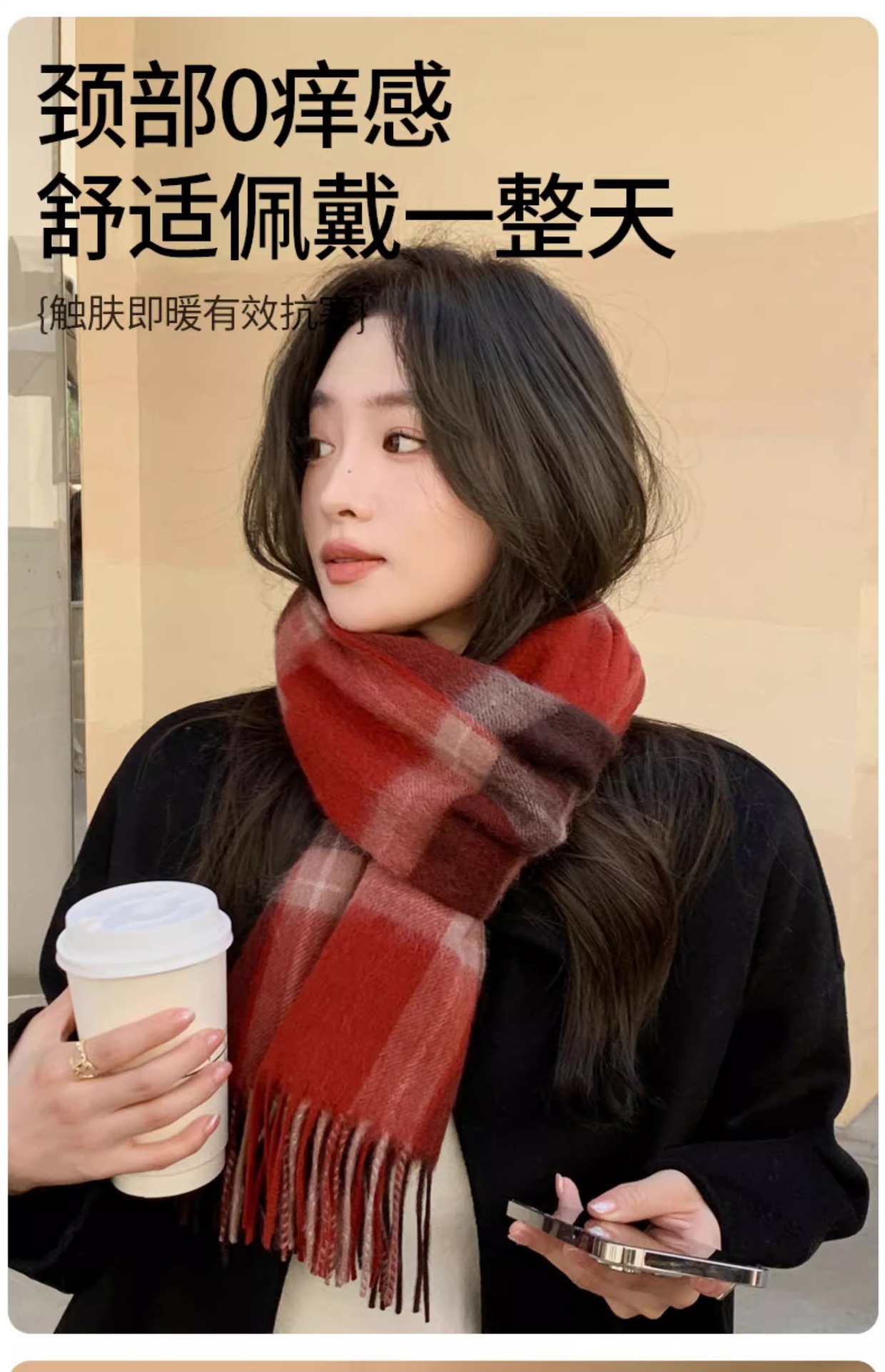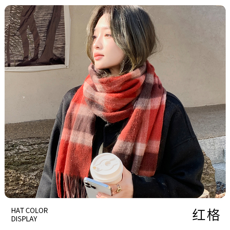 Maillard 컬러 레트로 울 스카프 여자 겨울 2024 새로운 격자 무늬 캐시미어 스카프 다크 브라운 고급 감각스토어 가기