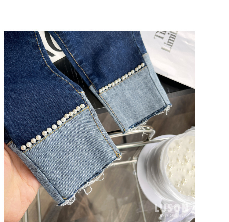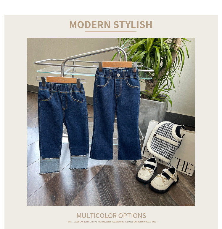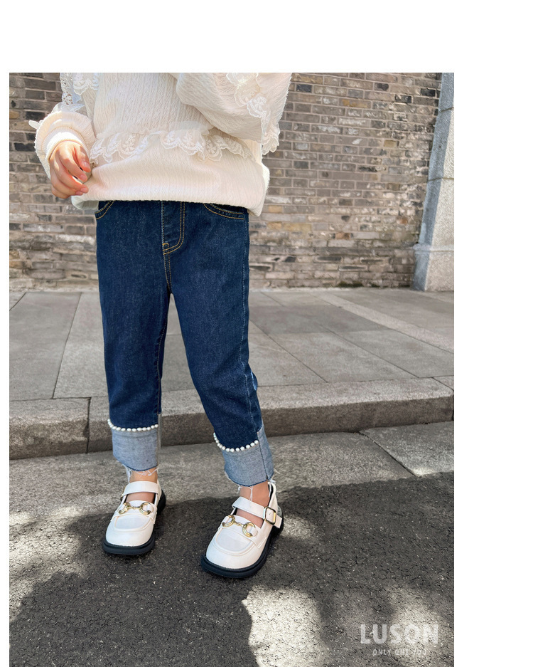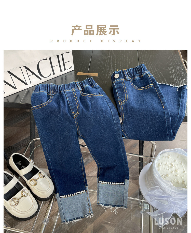 여자 청바지 봄과 가을 2024 새로운 스타일 스키니 바지 한국 스타일 어린이 여성 아기 발 진주 발목 길이 유행 바지스토어 가기