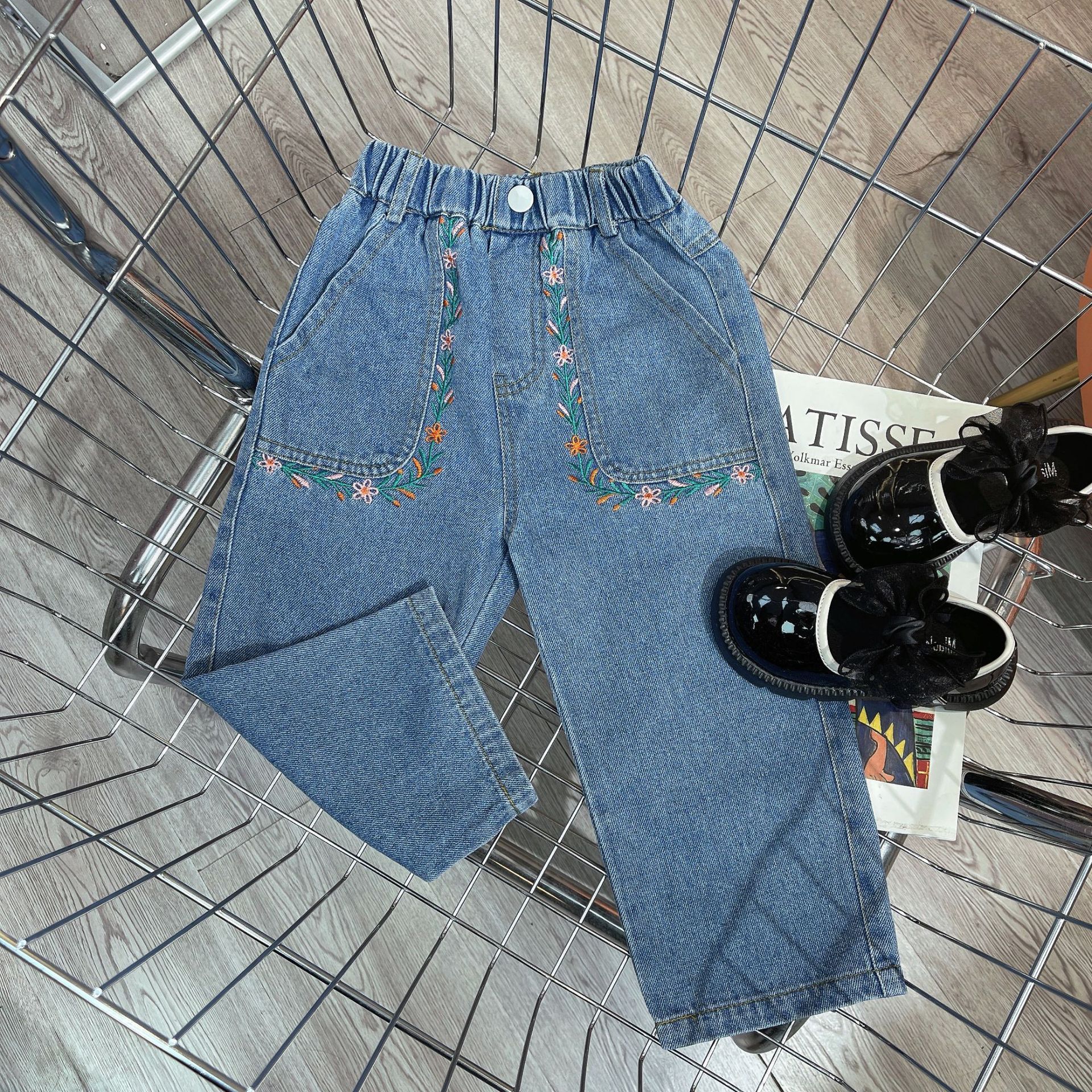 가을 2024 새로운 소녀의 꽃 자수 빈티지 스트레치 청바지 어린이 스타일리스트 스트레이트 와이드 다리 바지스토어 가기