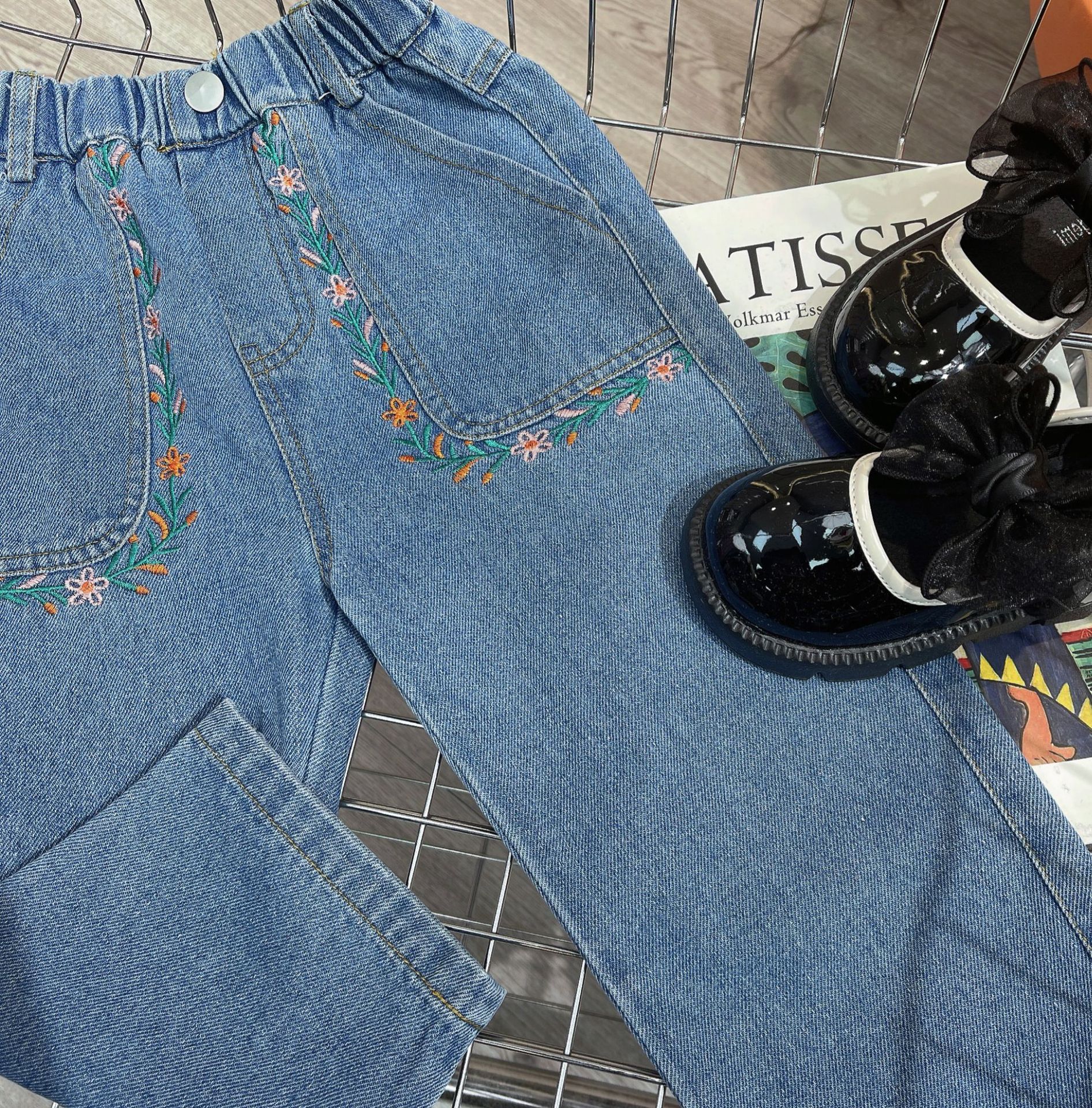 가을 2024 새로운 소녀의 꽃 자수 빈티지 스트레치 청바지 어린이 스타일리스트 스트레이트 와이드 다리 바지