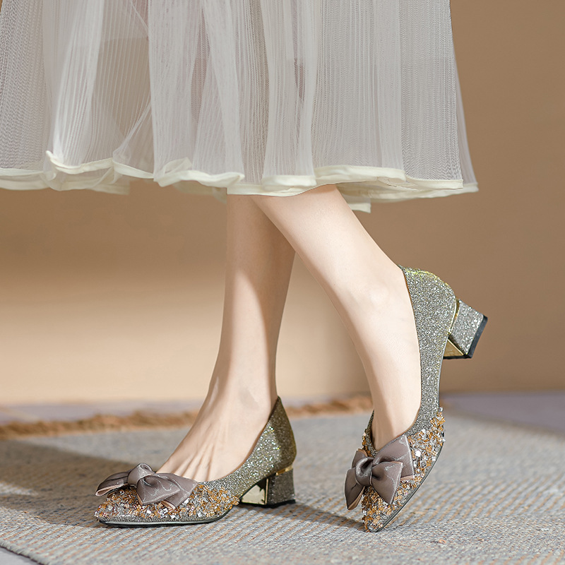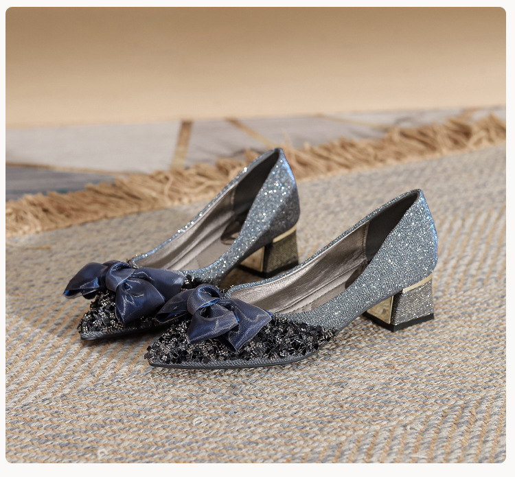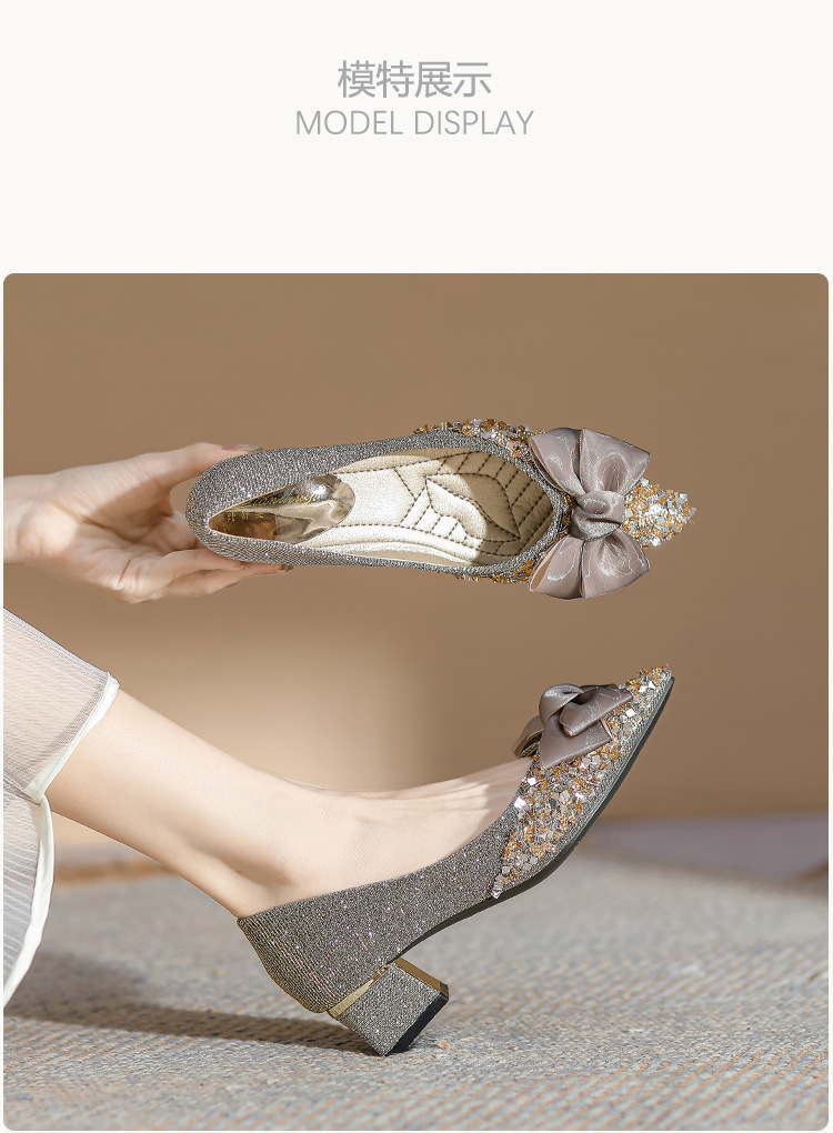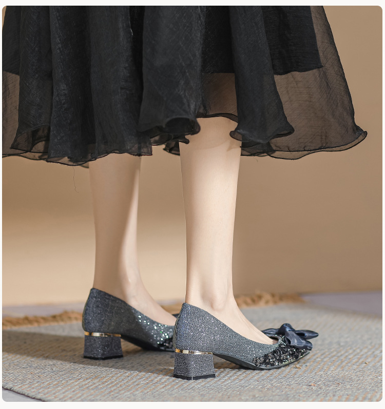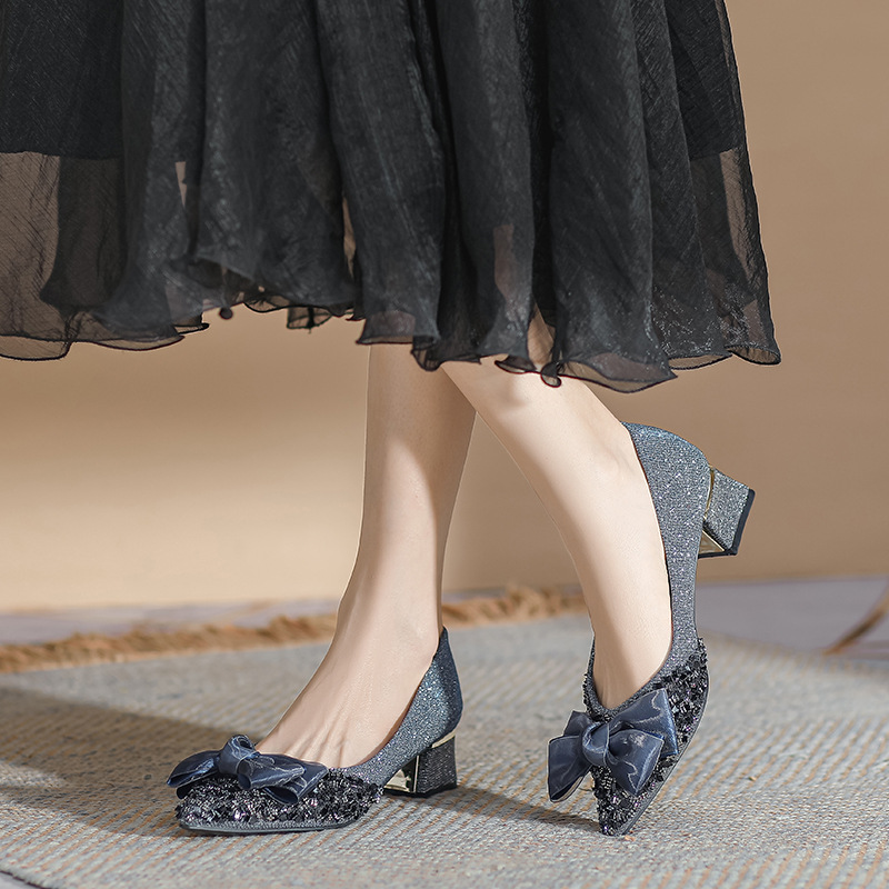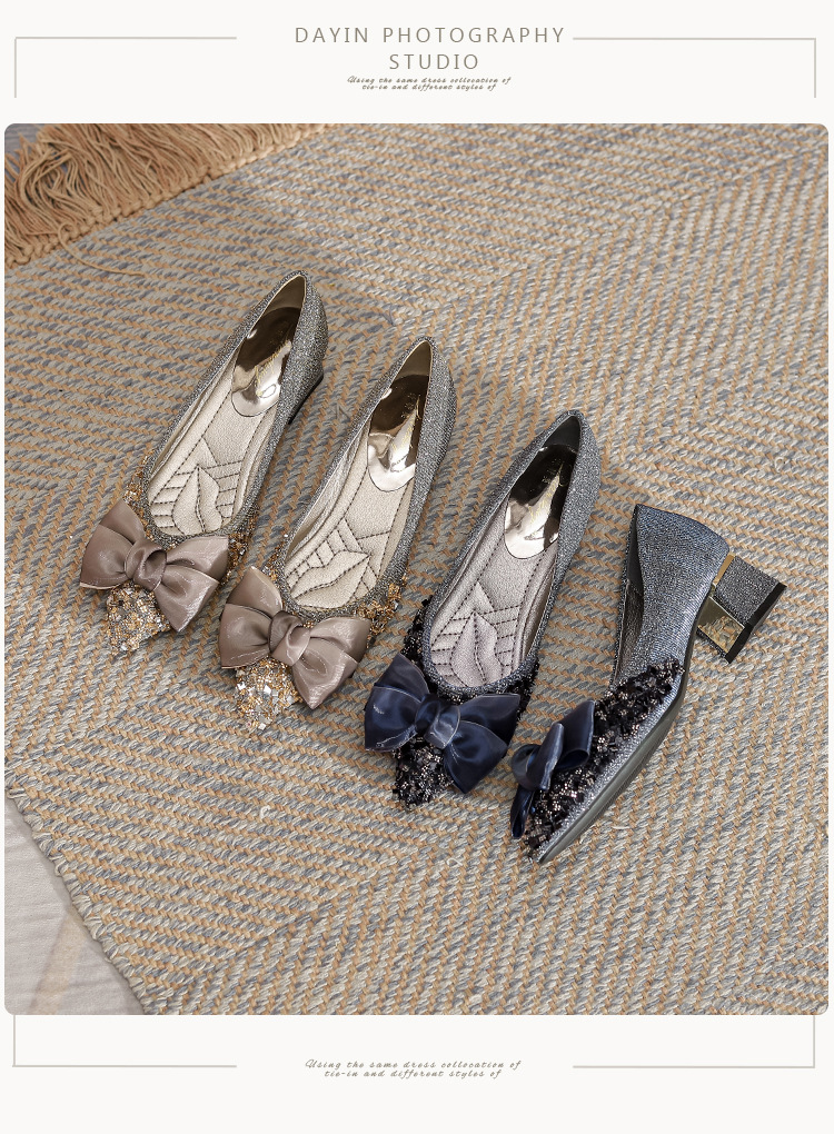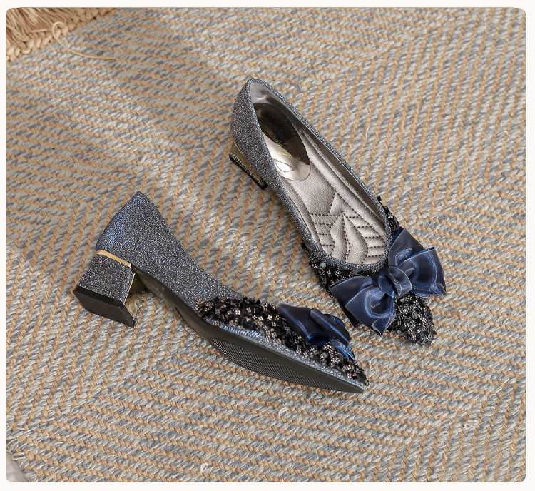 2024 포인팅 싱글 레이어 신발 로우 입 보우 펌프 새로운 스타일 우아한 로우 힐 소프트 하단 샤넬 스타일 마일 라드 여성 신발스토어 가기