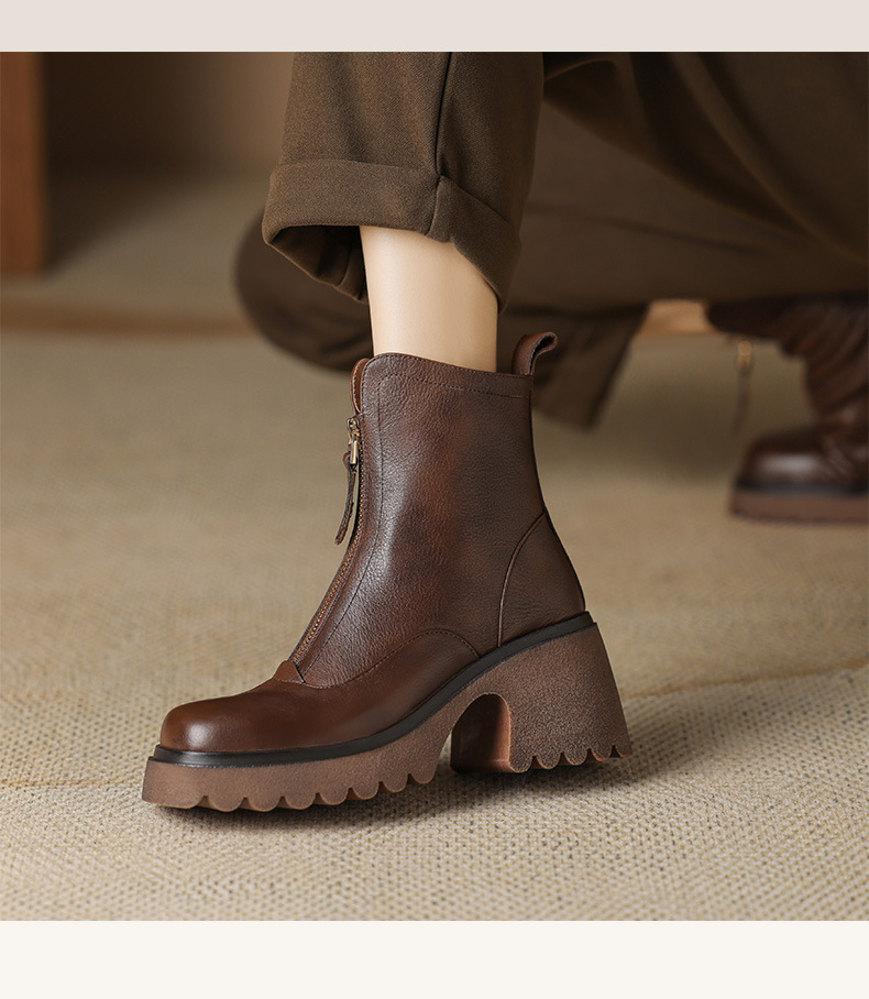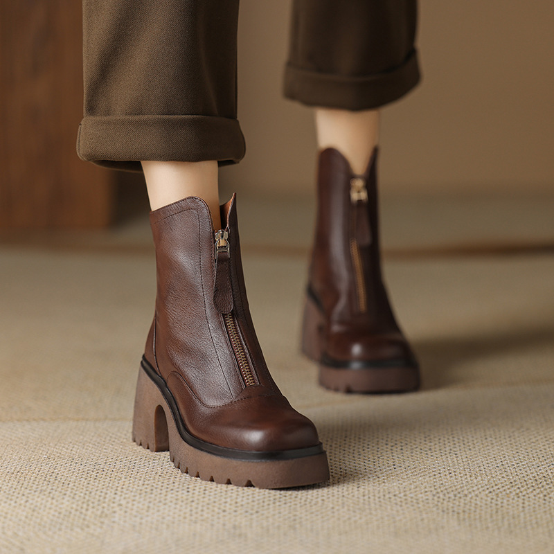 영국 스타일 정품 가죽 마틴 부츠 여성 전면 지퍼 가을과 겨울 새로운 빈티지 라운드 발가락 두꺼운 하이힐 두꺼운 하단 짧은 부츠