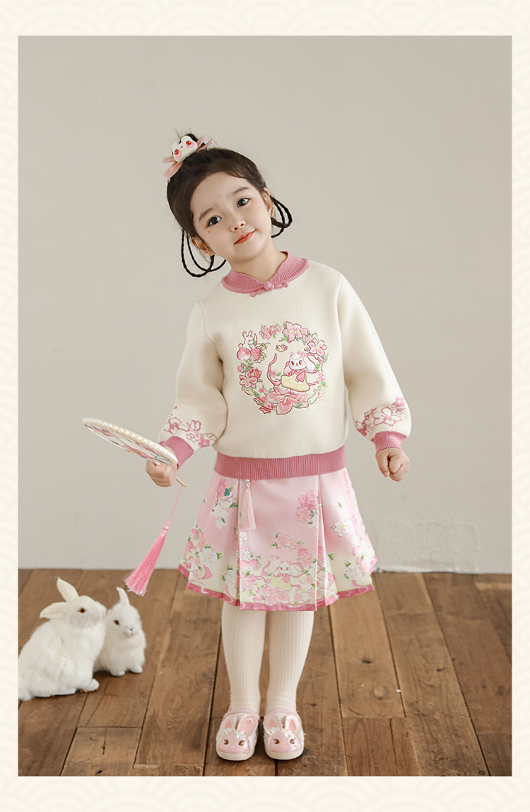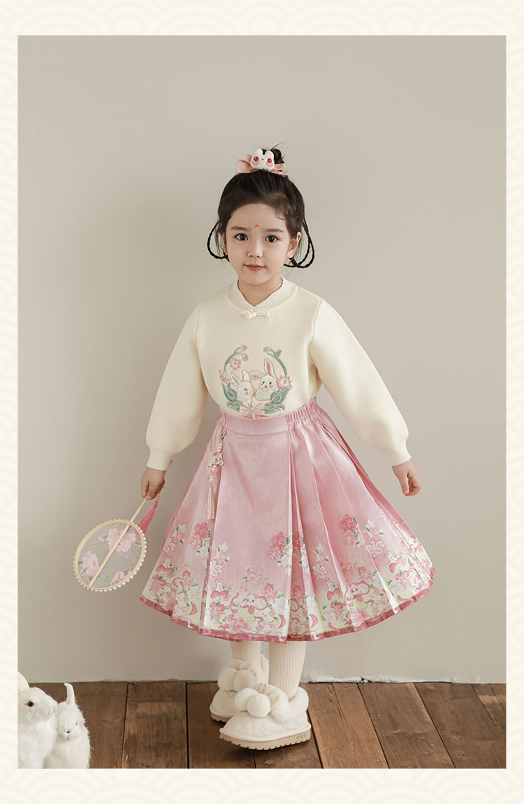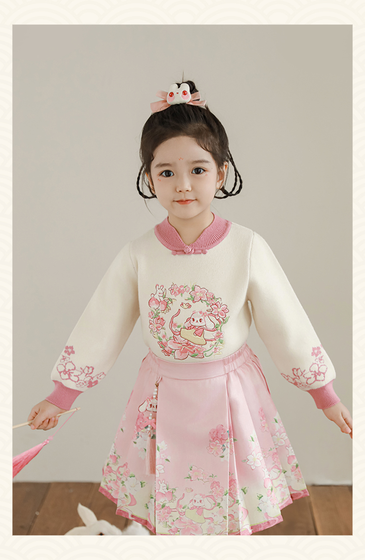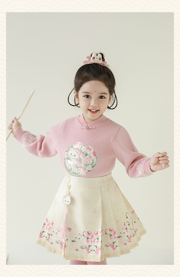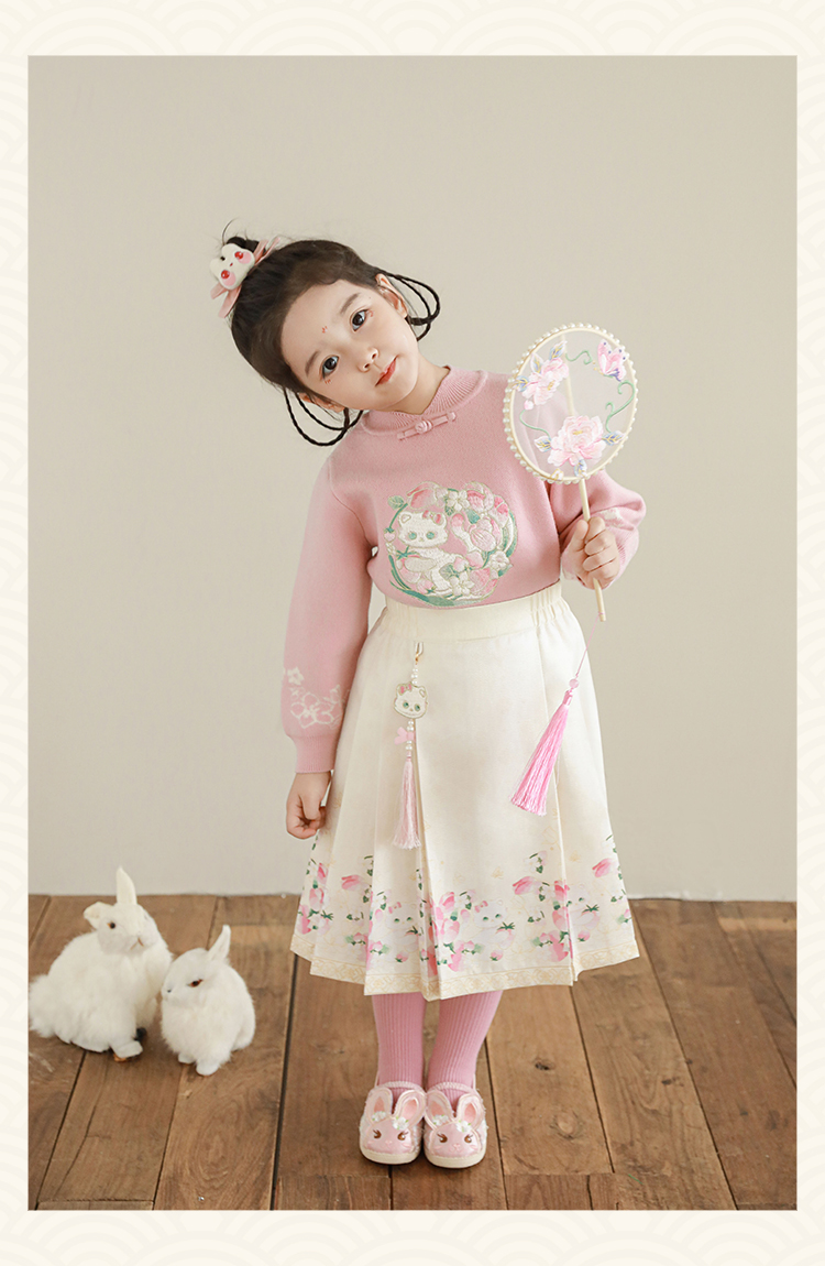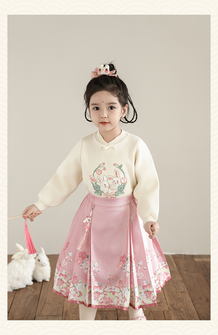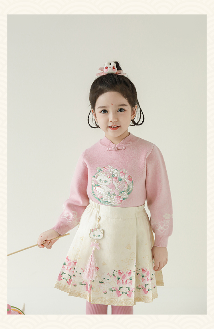 Wuri Bub 더블 11 여자 중국 세트 겨울 어린이 청삼 수직 칼라 스웨터 길고 짧은 국가 스타일 말 얼굴 오버스커트