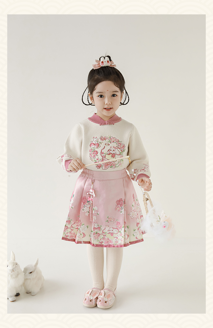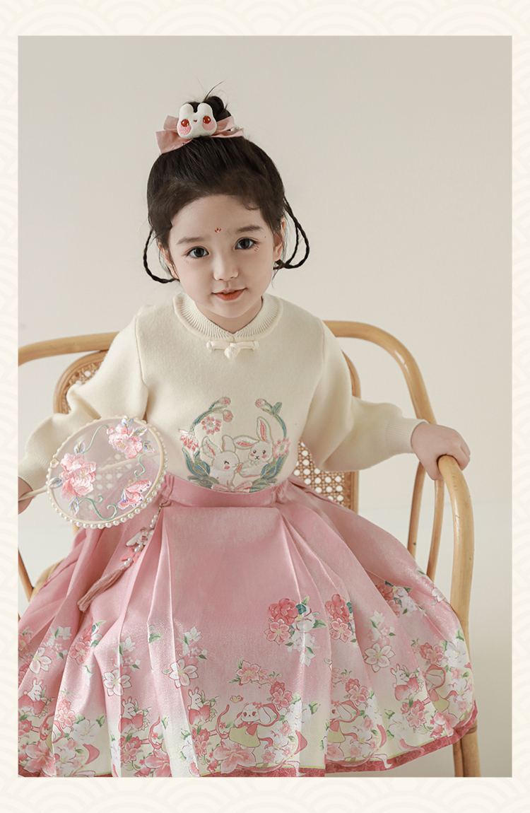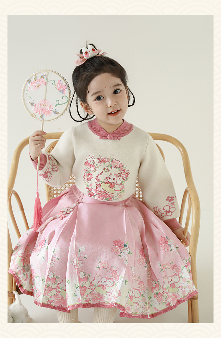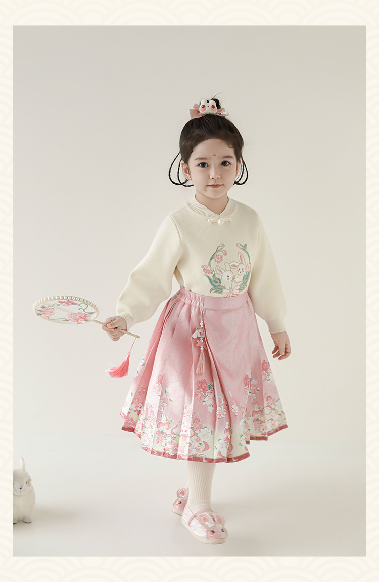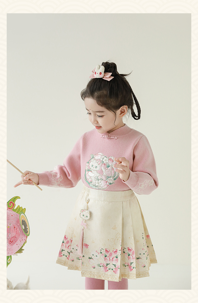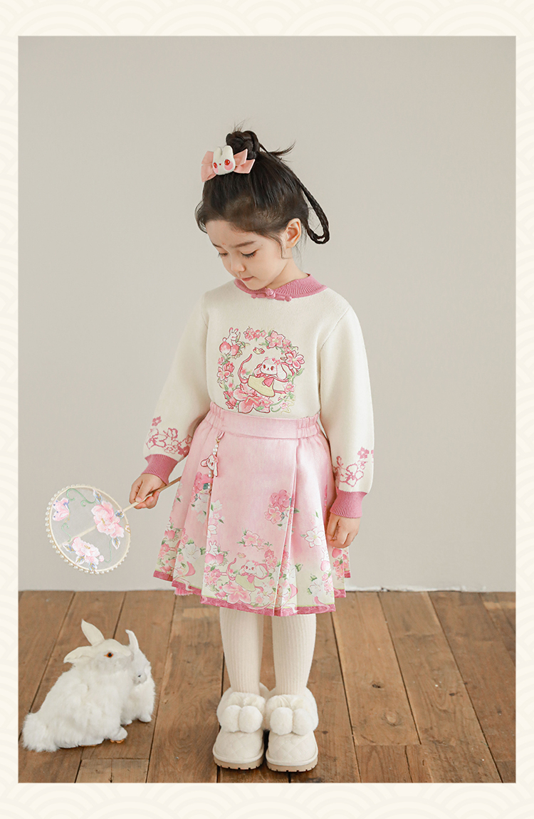 Wuri Bub 더블 11 여자 중국 세트 겨울 어린이 청삼 수직 칼라 스웨터 길고 짧은 국가 스타일 말 얼굴 오버스커트