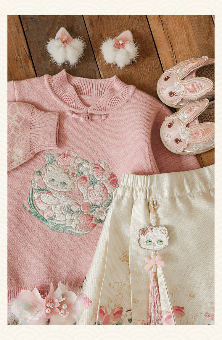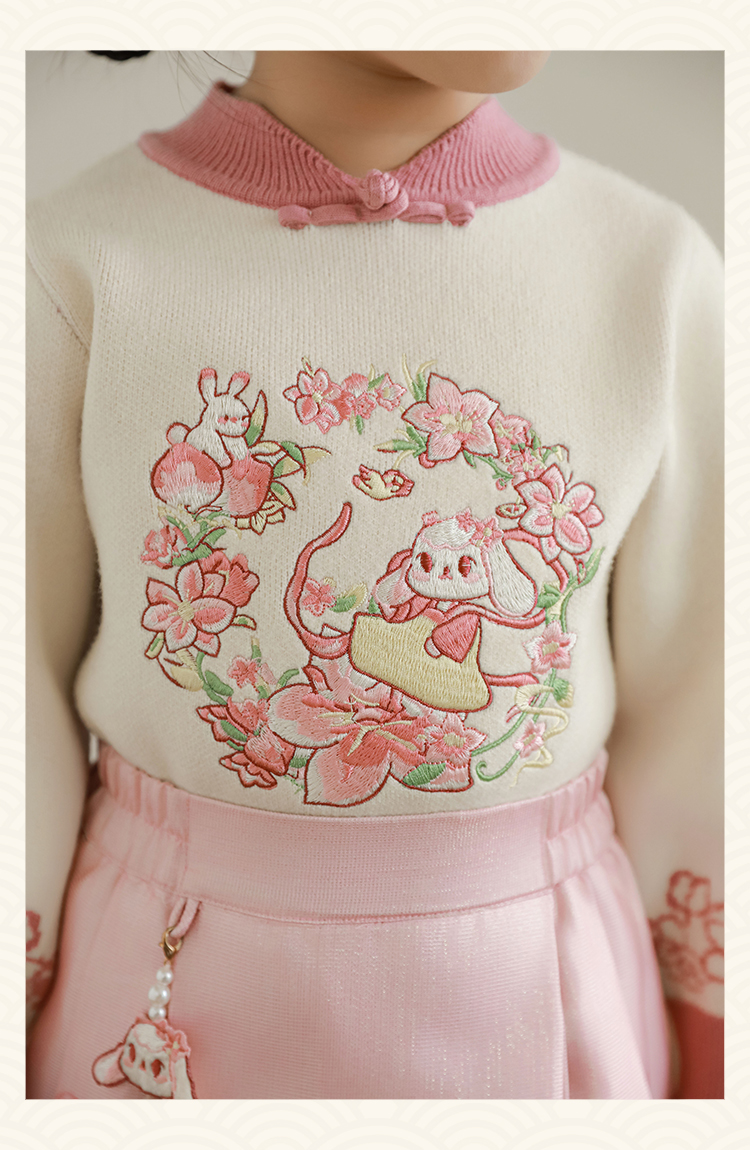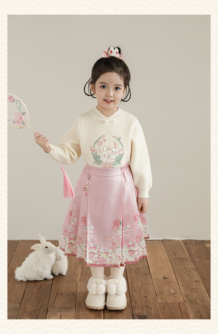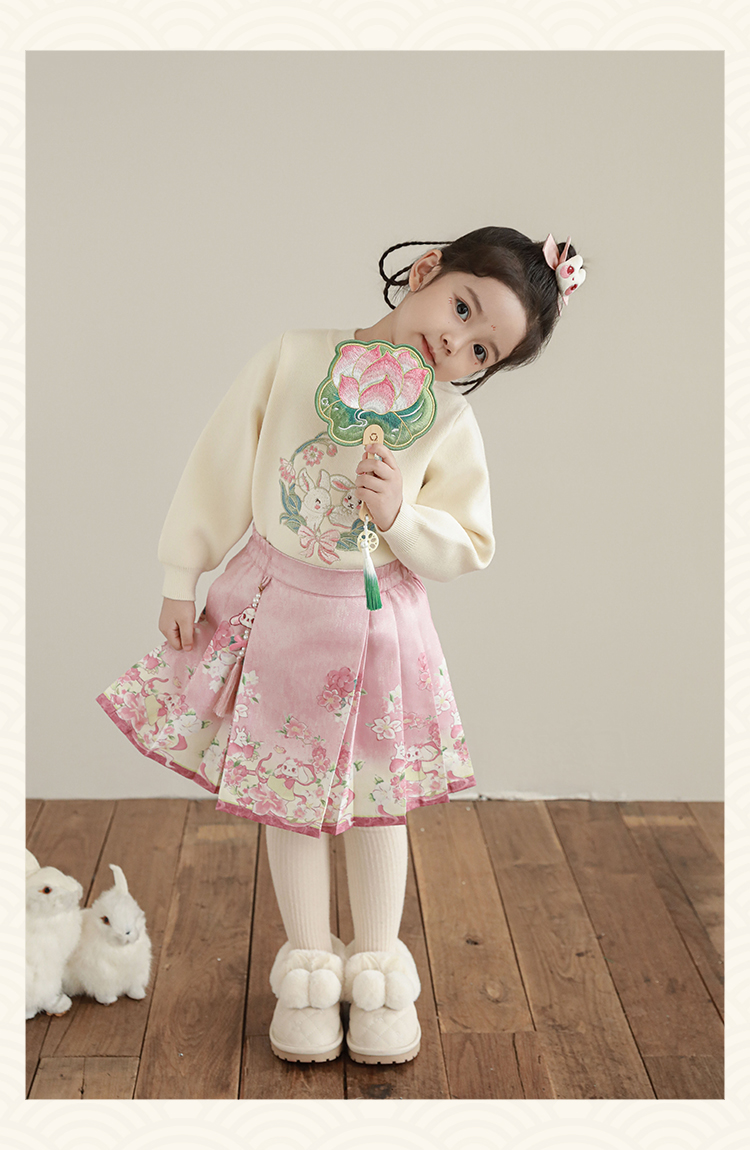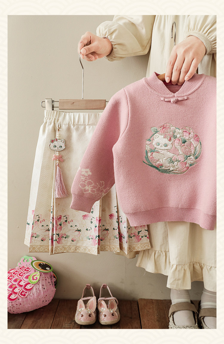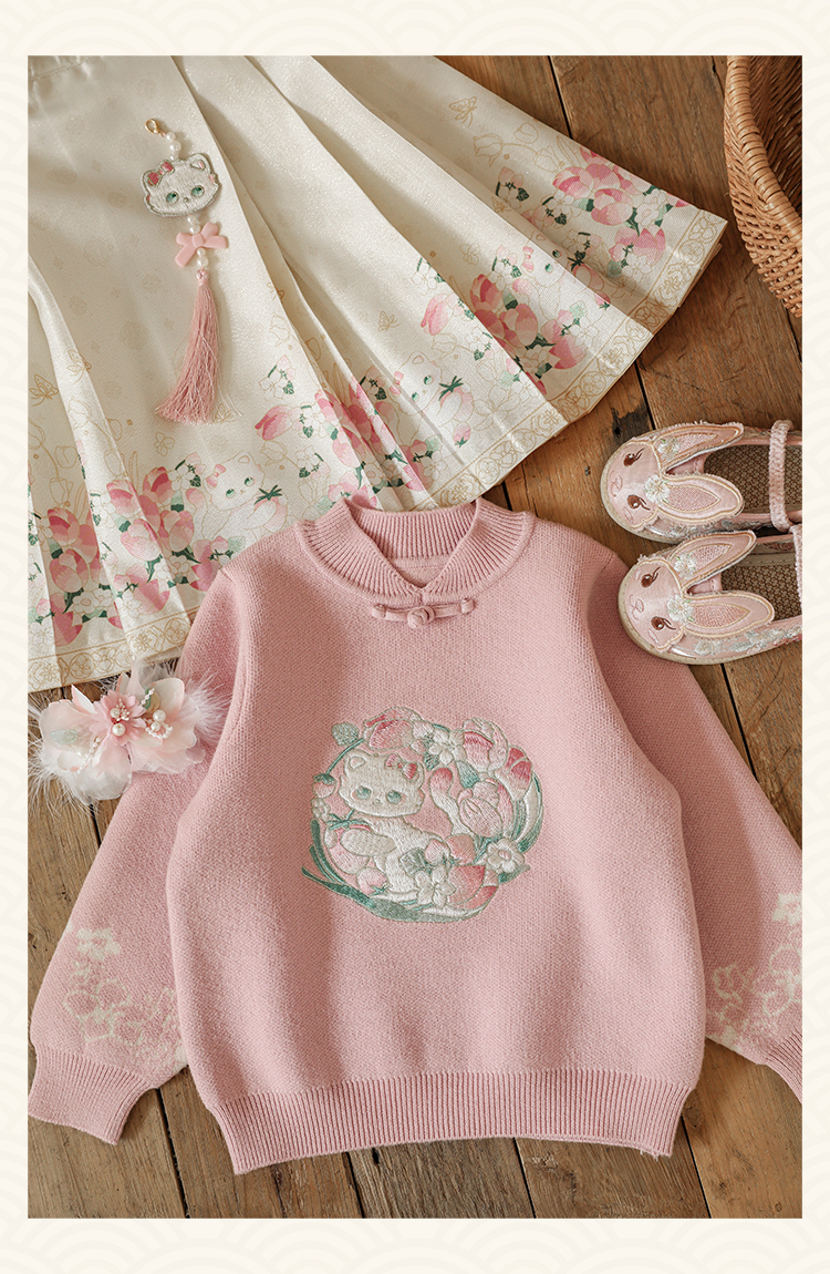 Wuri Bub 더블 11 여자 중국 세트 겨울 어린이 청삼 수직 칼라 스웨터 길고 짧은 국가 스타일 말 얼굴 오버스커트