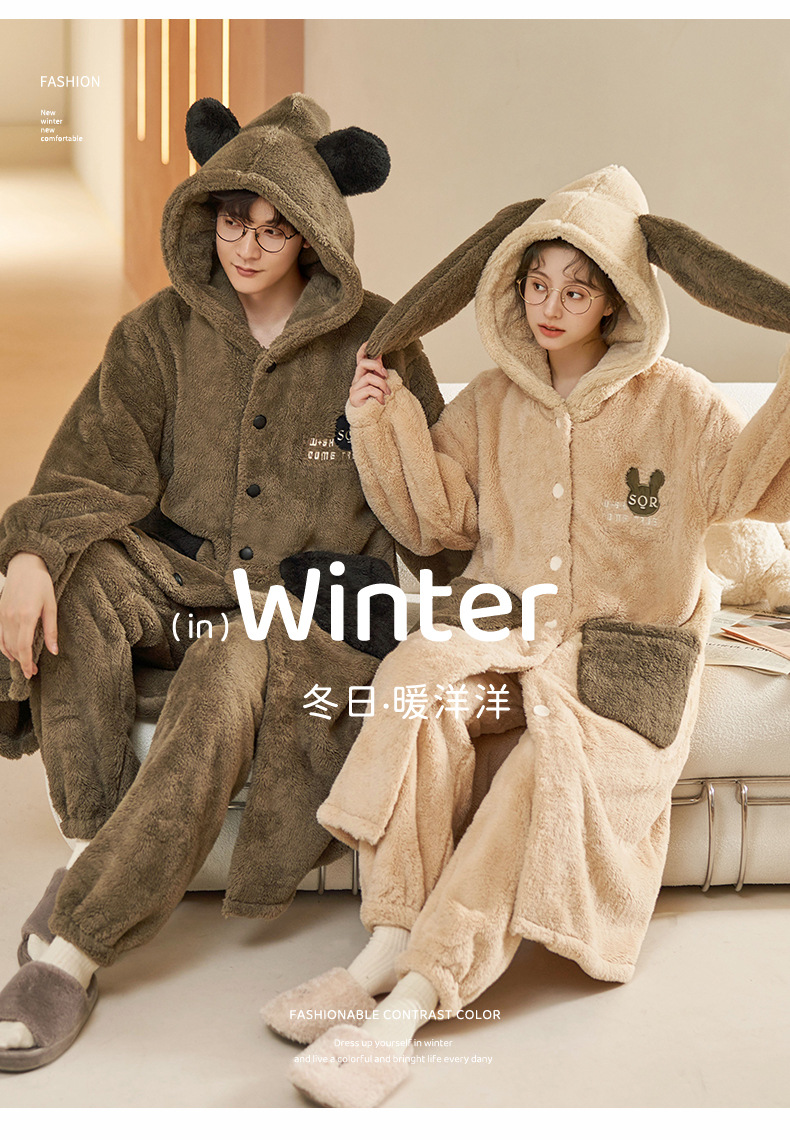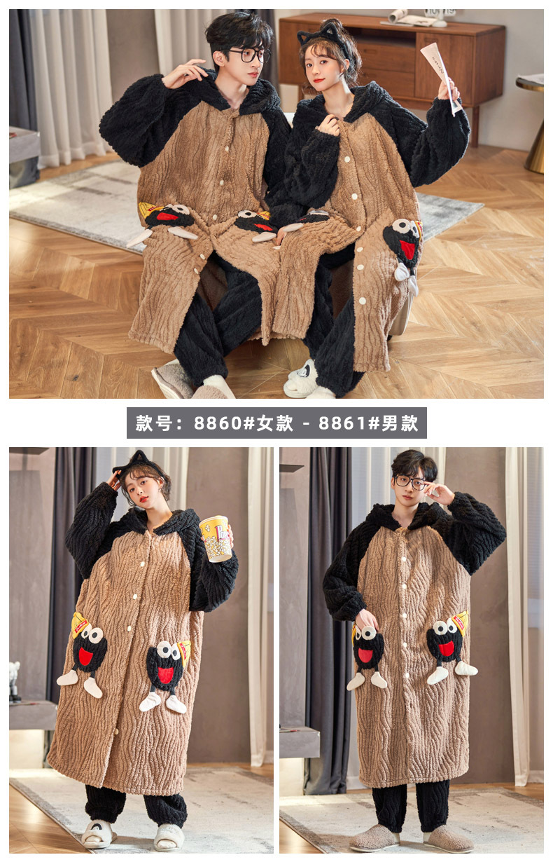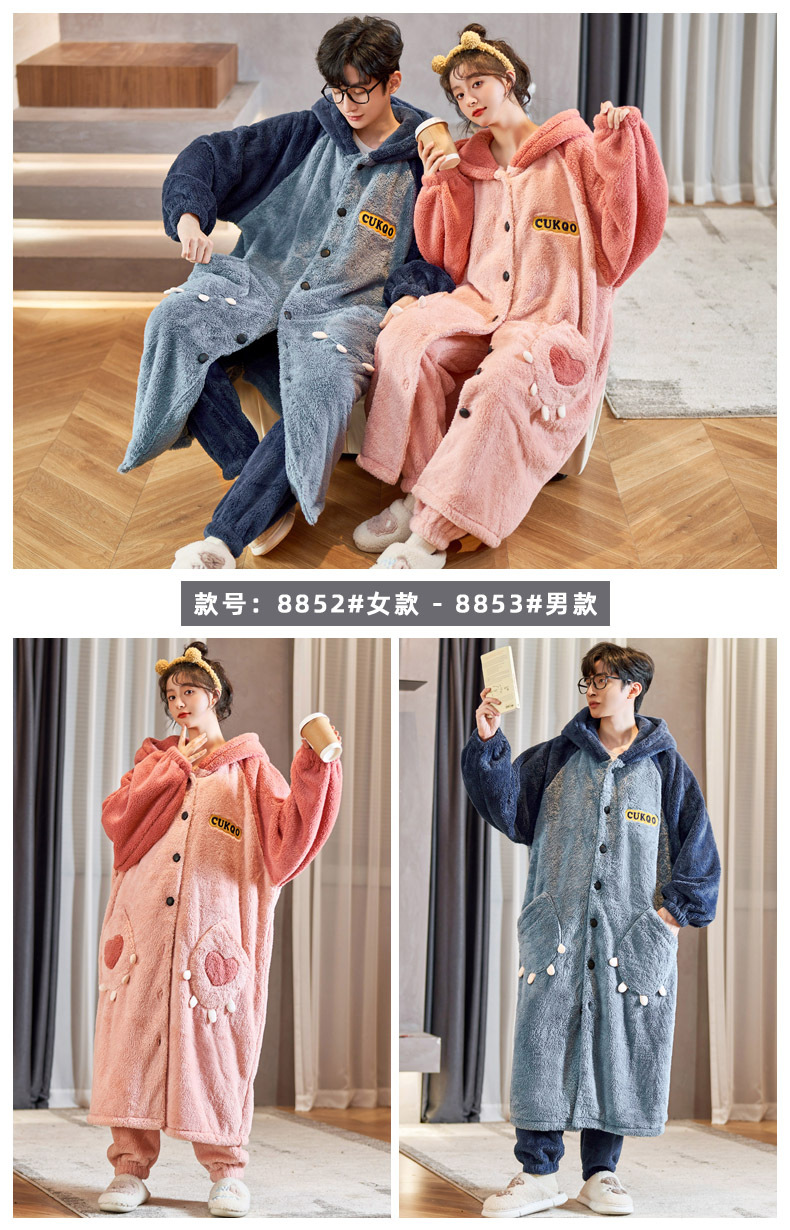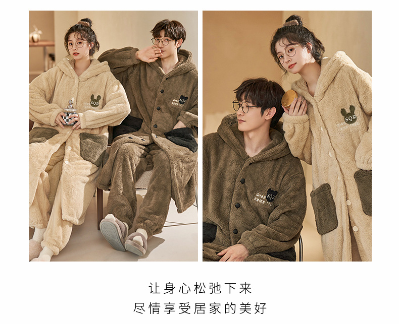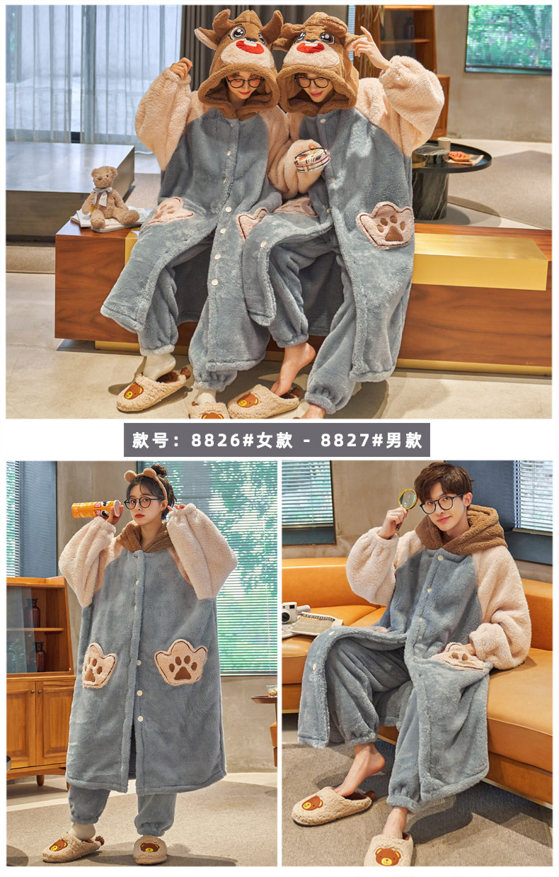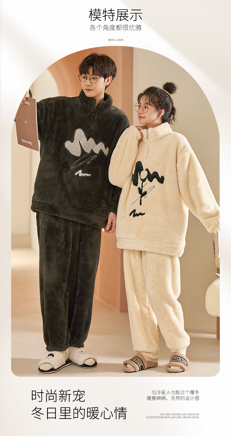커플 잠옷 겨울용 코랄 벨벳 두꺼운 가을 겨울 남녀용 플러스 벨벳 세트 대학 스타일 겨울 잠옷스토어 가기