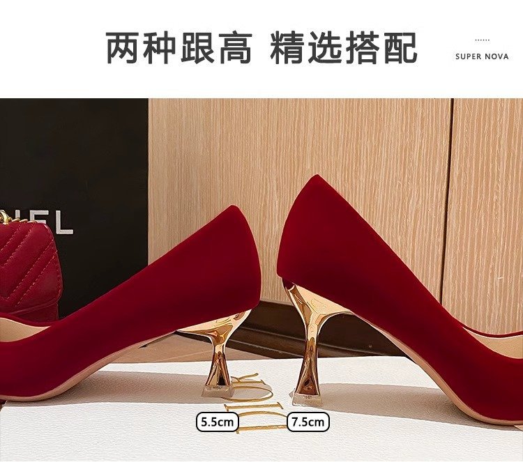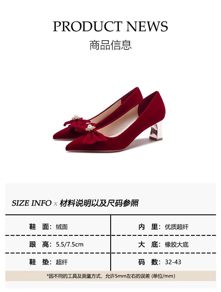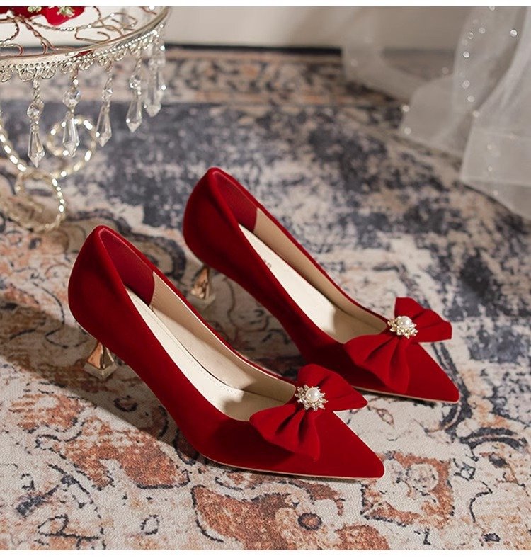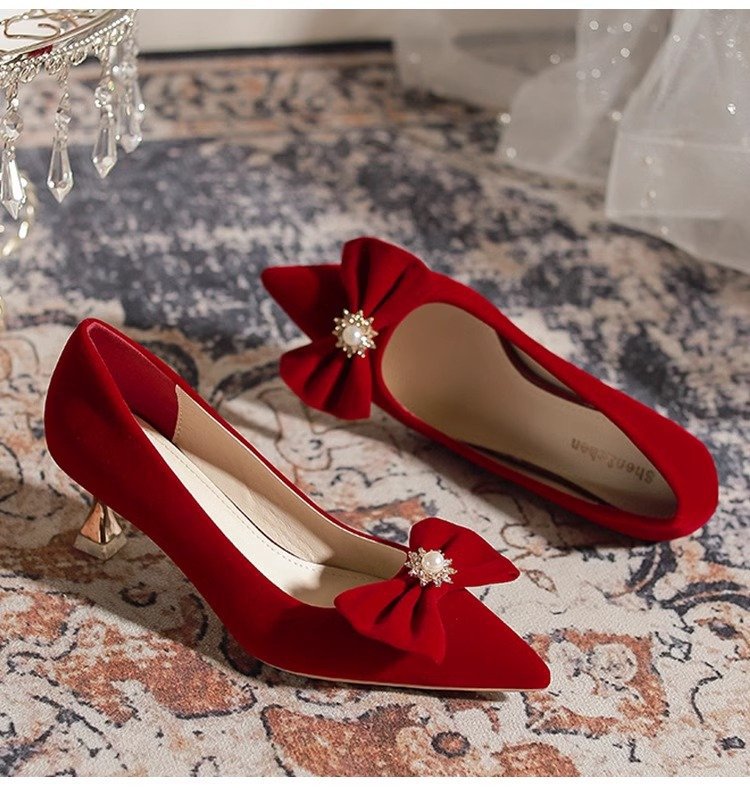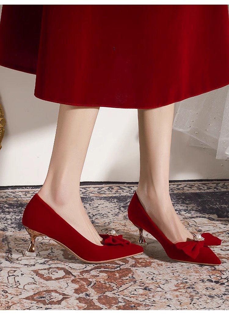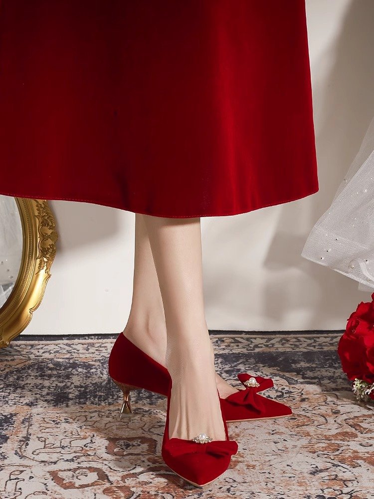 가을 2024 새로운 빈티지 레드 싱글 레이어 신발 여성용 스틸레토 힐 신발 활 자수 모 원피스 신부 신발스토어 가기