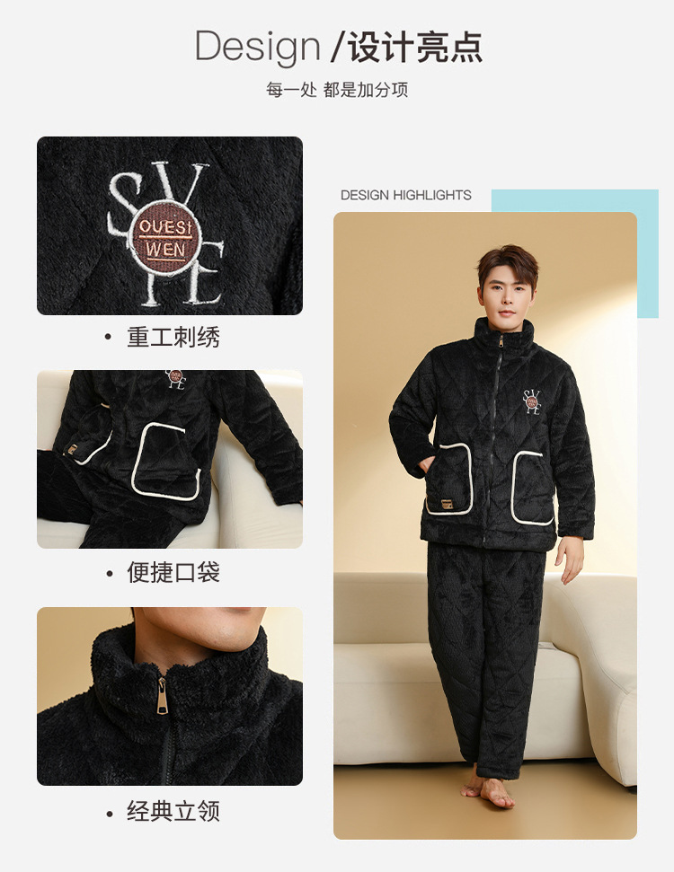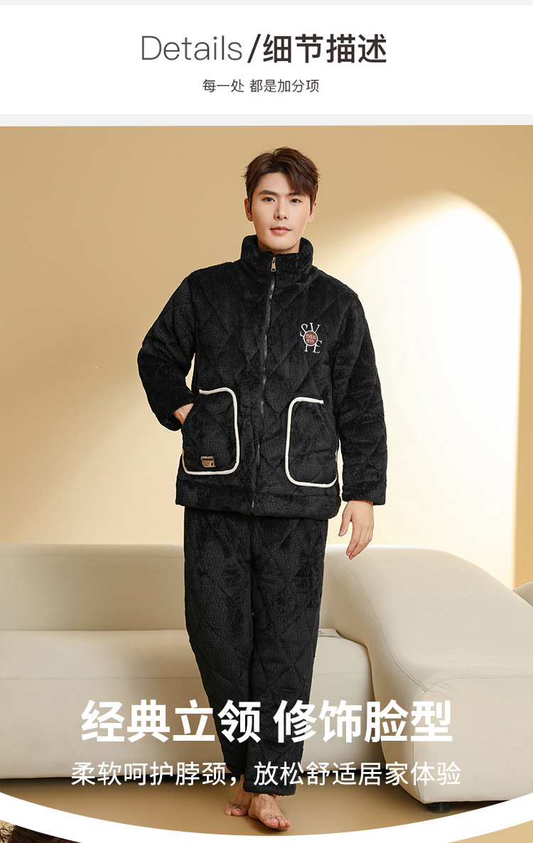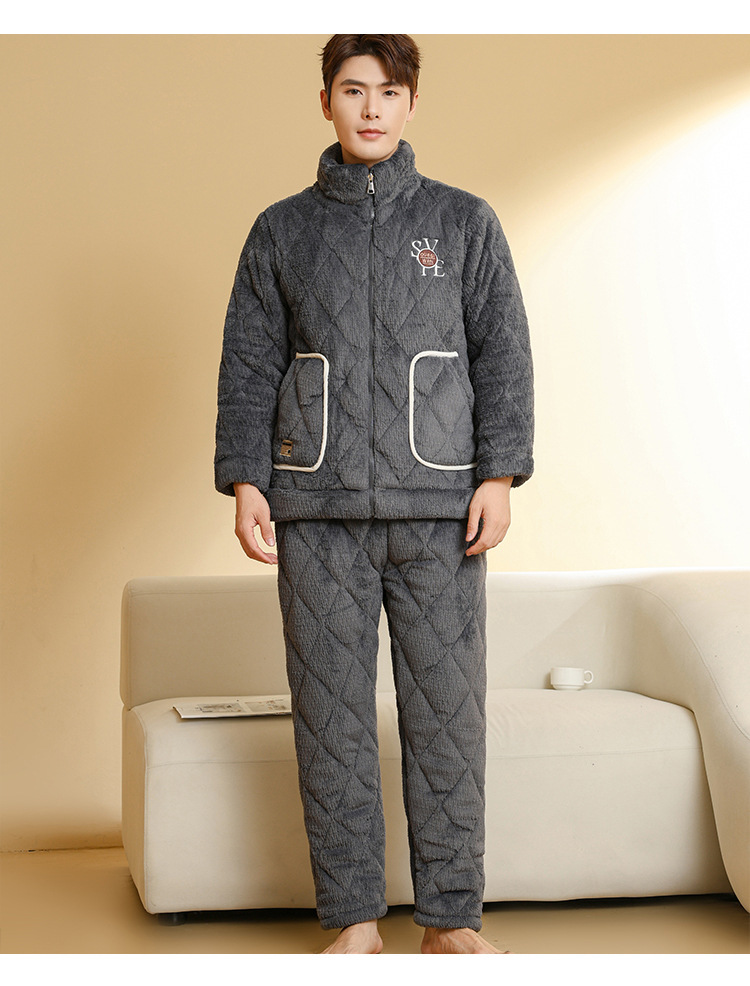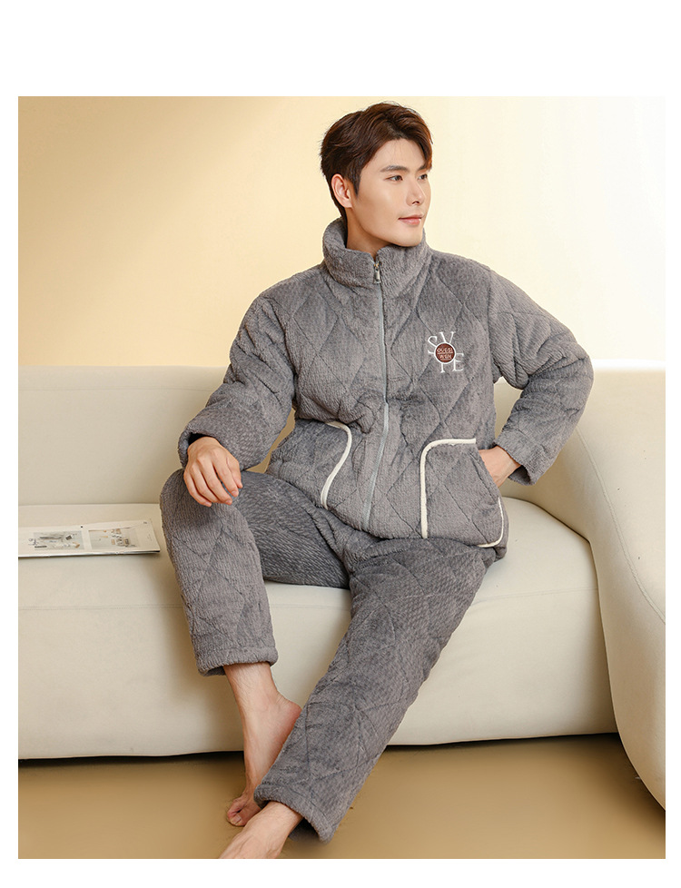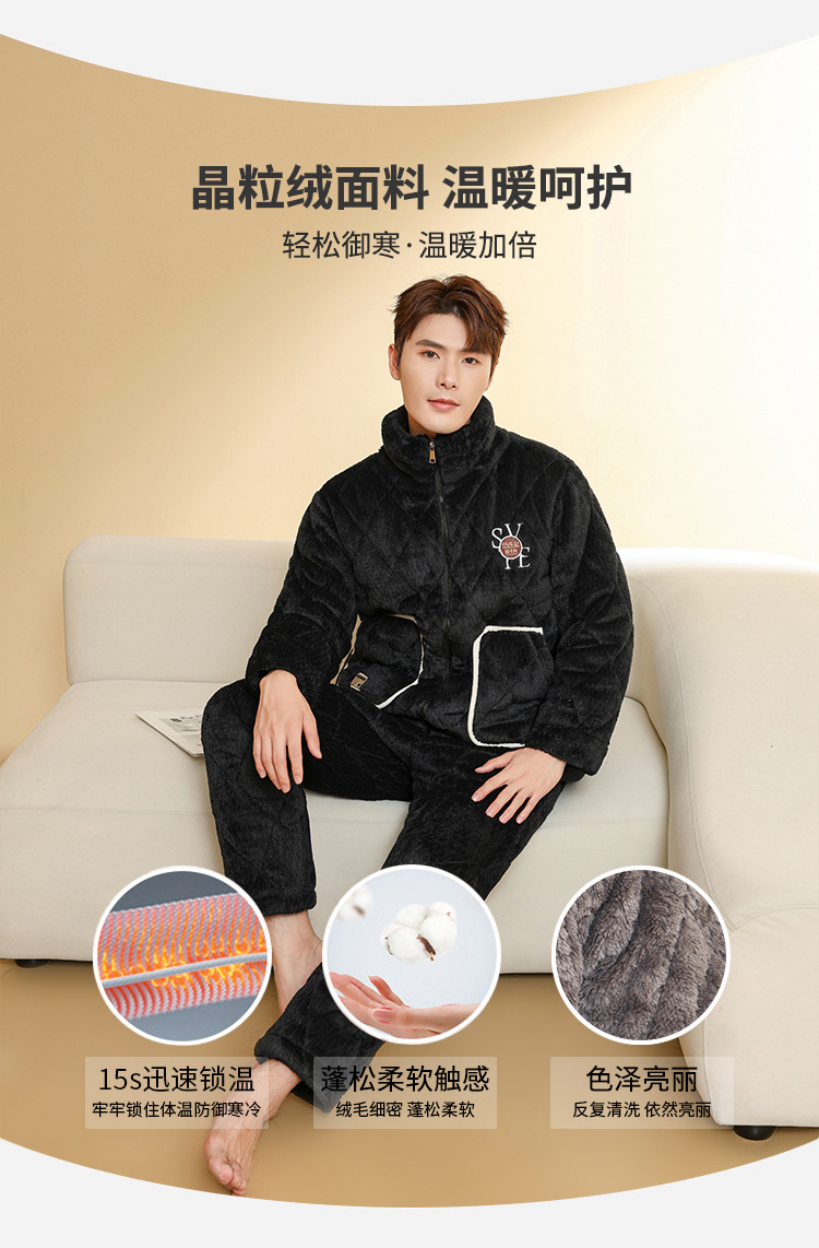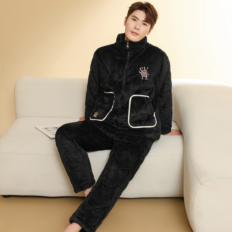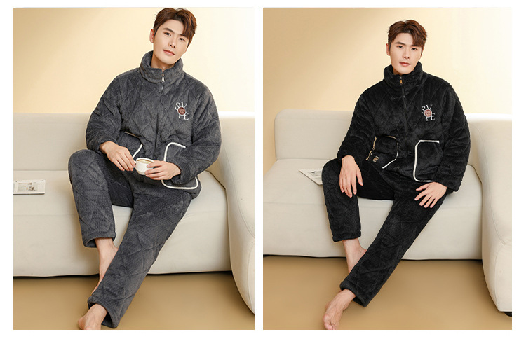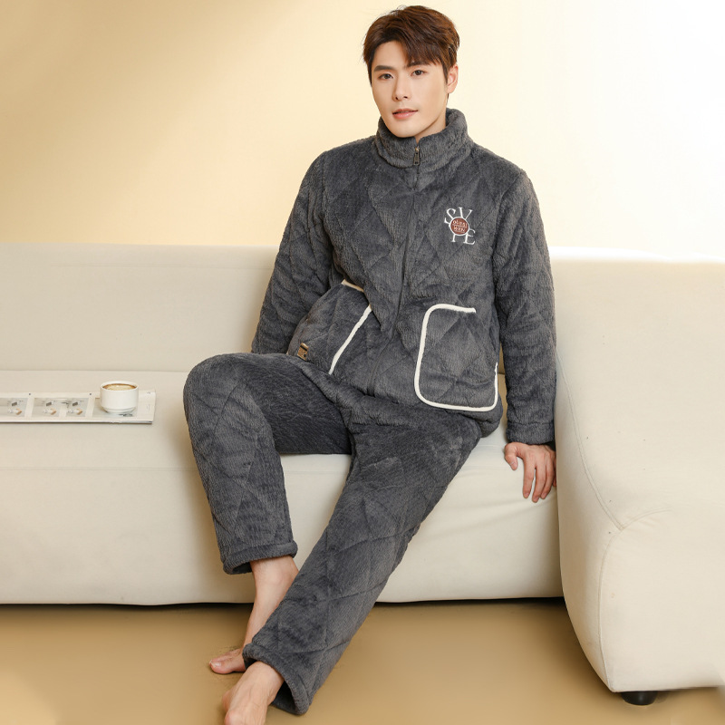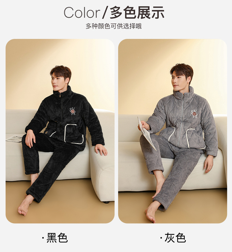 Ba Manzi 남자 잠옷 가을과 겨울 새로운 두꺼운 곡물 벨벳 지퍼 세트 순수 컬러 밴드 포켓 홈 옷
