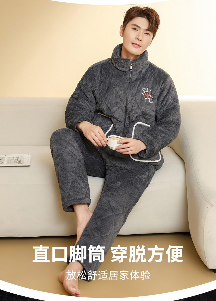 Ba Manzi 남자 잠옷 가을과 겨울 새로운 두꺼운 곡물 벨벳 지퍼 세트 순수 컬러 밴드 포켓 홈 옷스토어 가기