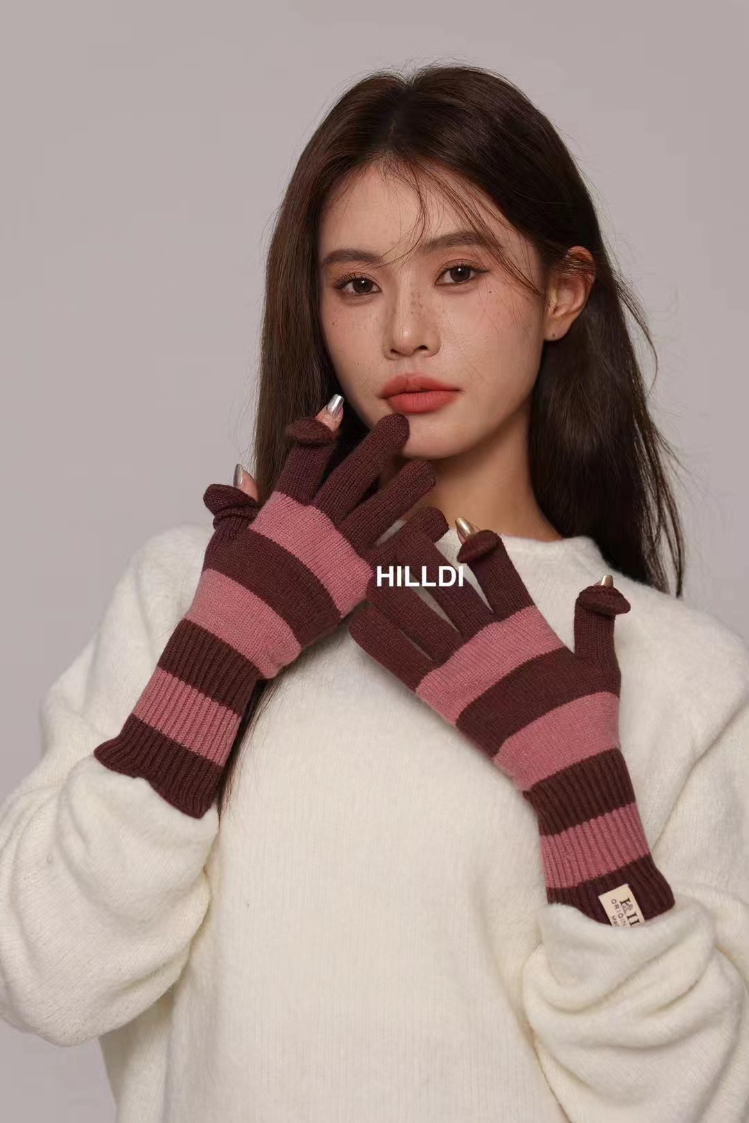 장갑 여성의 겨울 한국식 패션 스트라이프 콘트라스트 컬러 니트 터치 스크린 장갑 야외 따뜻한 승마 올매치 트렌디스토어 가기