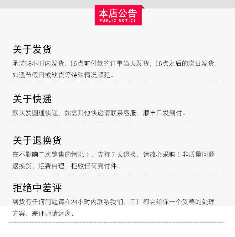 跨境爆款不支持退货退款,质量问题换货,介意者慎拍!页面部分是网图,大货以实物图为准,实拍图请联系客服索取,客户不得自身运营问题,不符合网图退款退货,另外破损请签收内三个工作日售后处理,过时不处理。