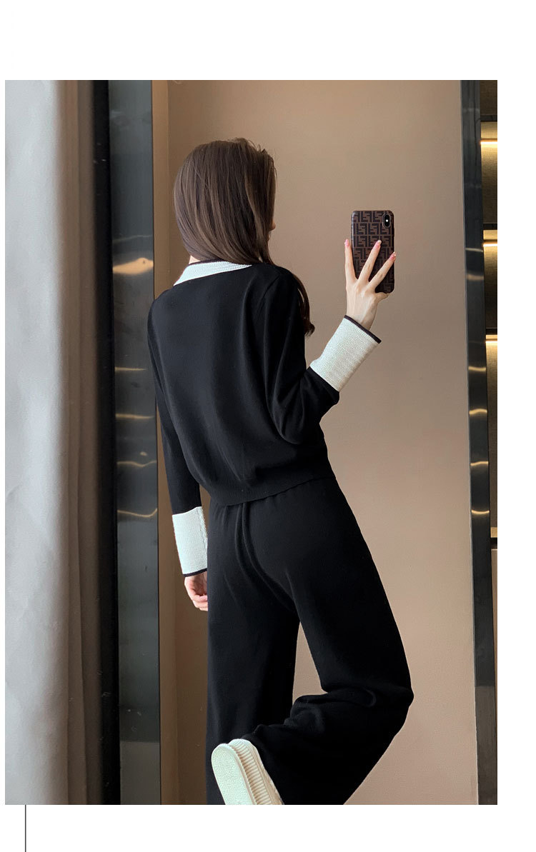 이른 가을 새로운 대비 니트 카디건 여성용 루즈 V 넥 재킷 투피스 하이 허리 와이드 레그 크롭 팬츠스토어 가기