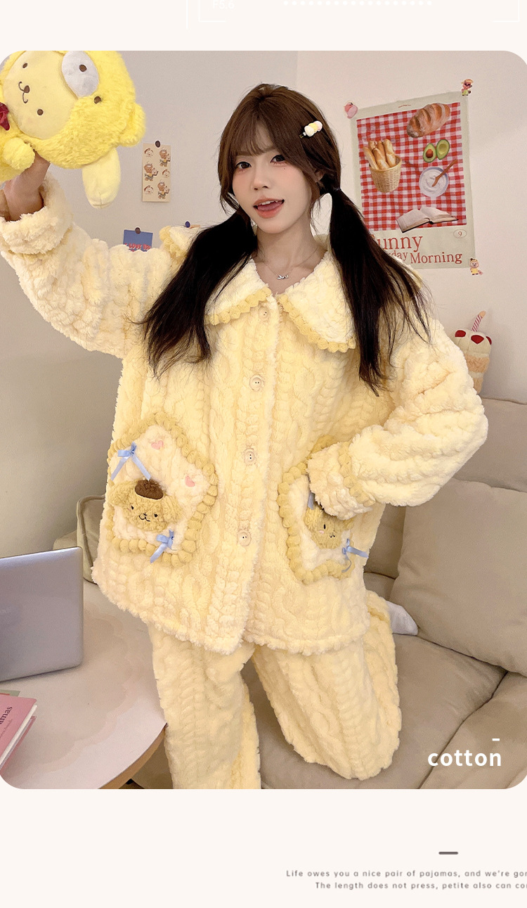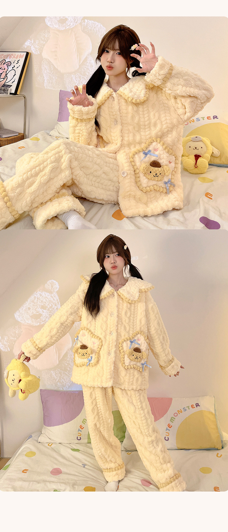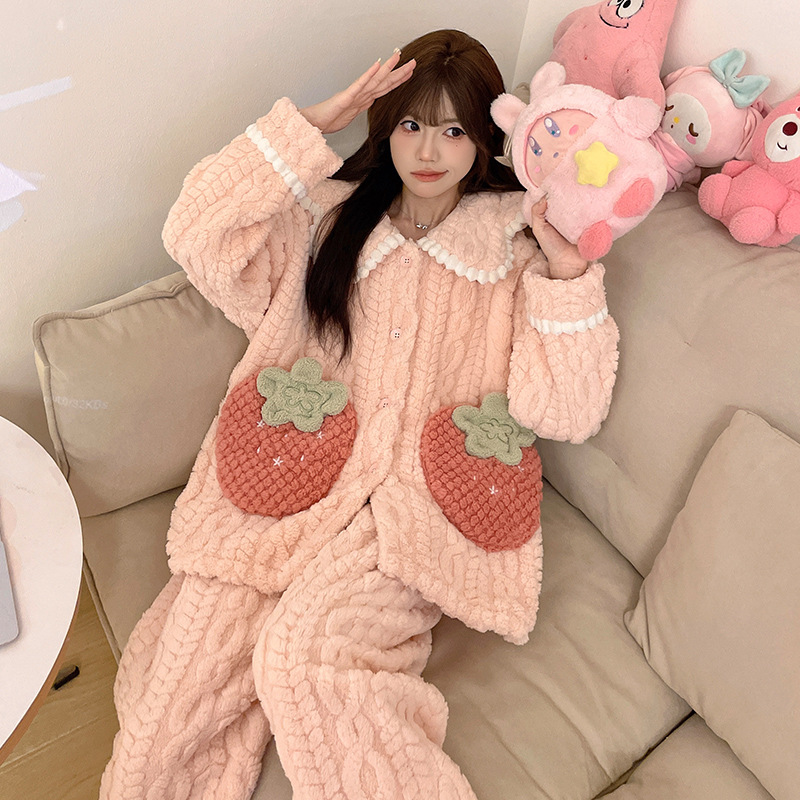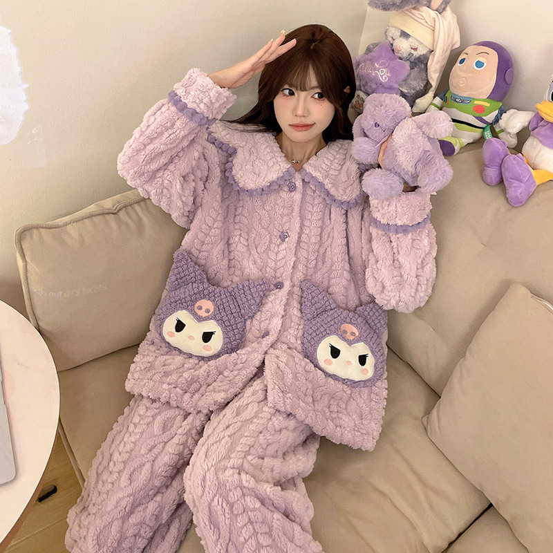 2024 새로운 잠옷 여성 산호 양털 가을과 겨울 기모 두꺼운 만화 달콤한 겨울 플란넬 홈 의류