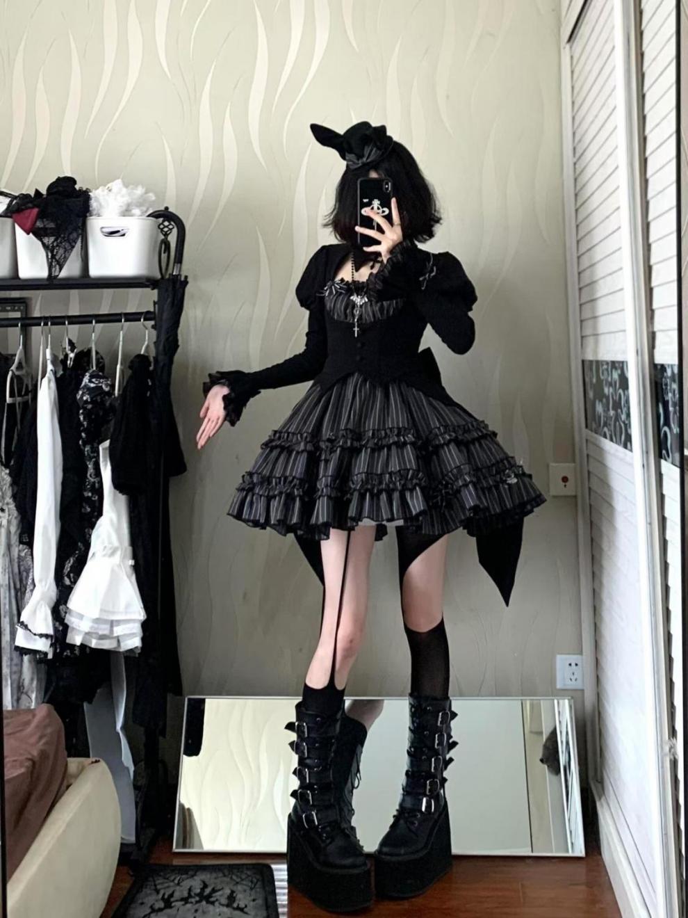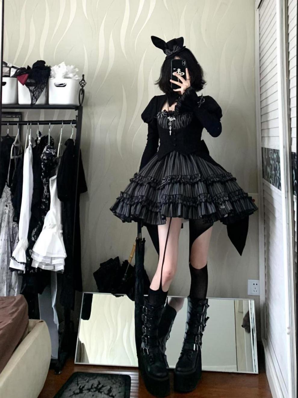 가을 마녀 다크 윈드 할로윈 로리타 가짜 2 피스 스티칭 혼 슬리브 탑 스트라이프 스커트 세트스토어 가기