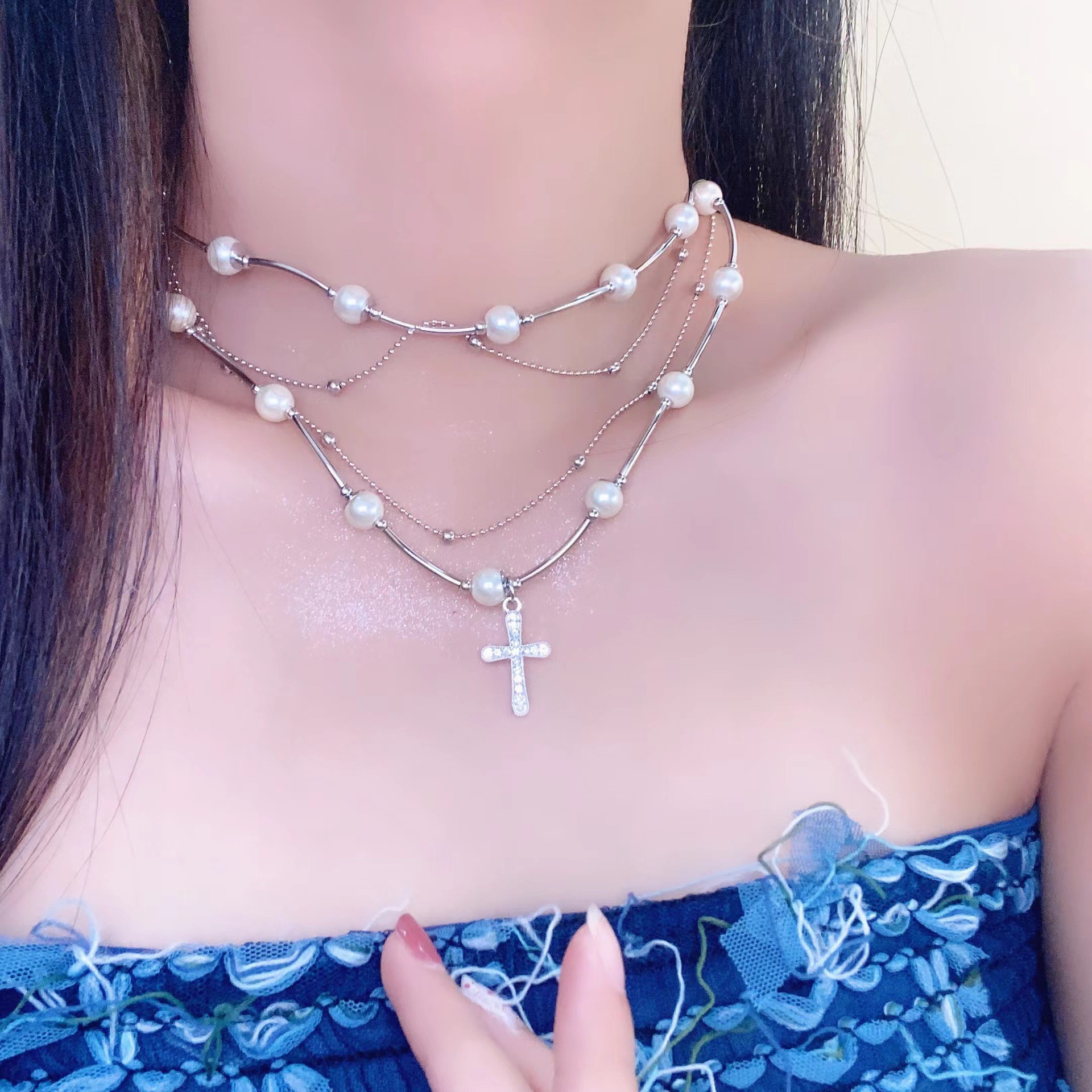 • 다층 다이아몬드 크로스 진주 목걸이 X4137