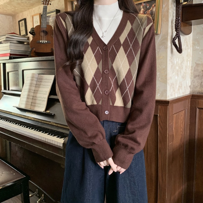 미국 복고풍 학술 스타일 다이아몬드 V 넥 니트 카디건 여성 가을 디자인 감각 컬러 매칭 스웨터 코트 도매