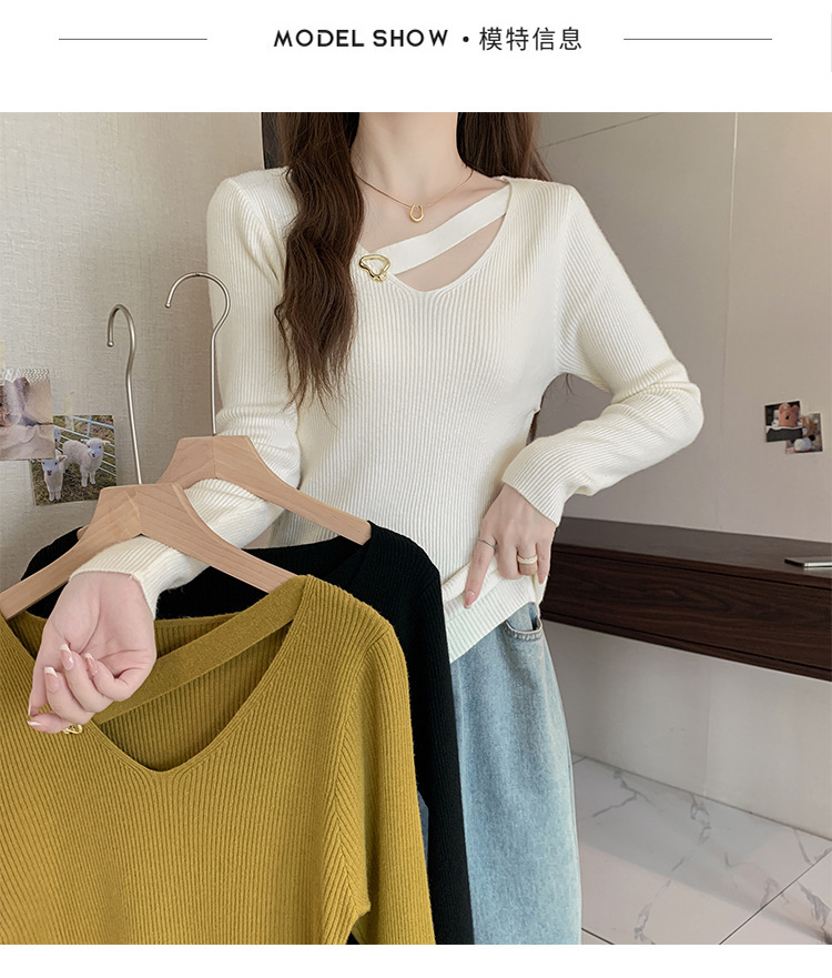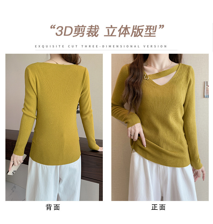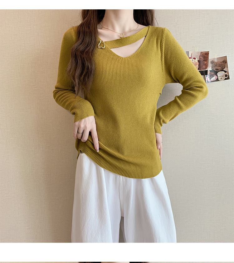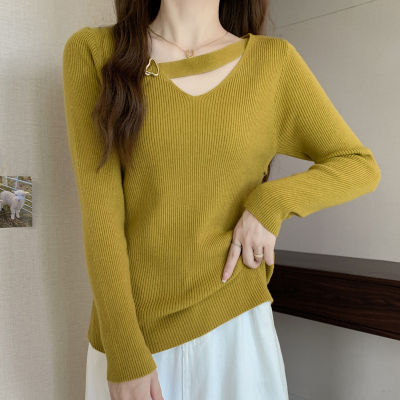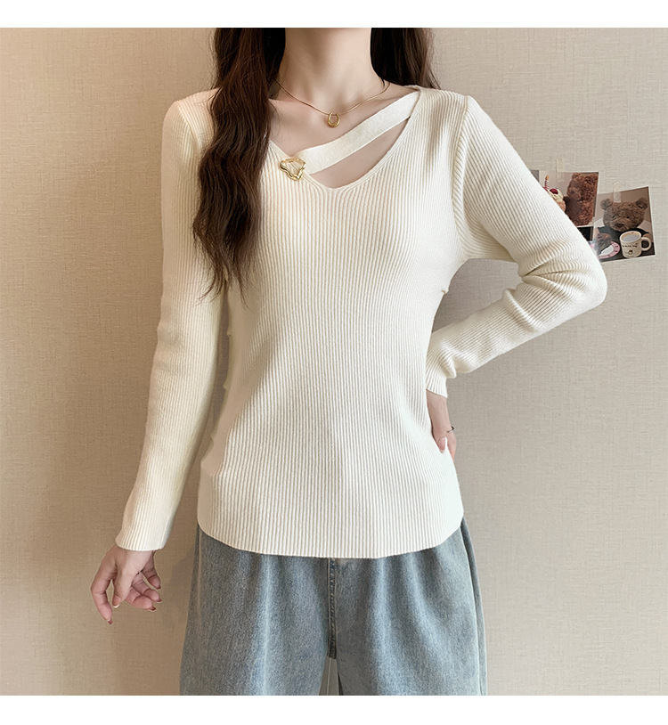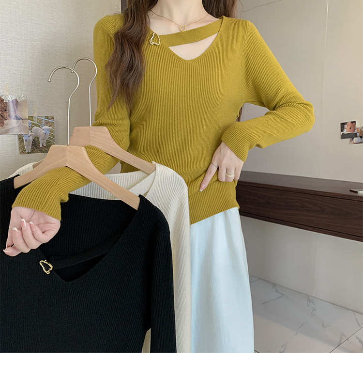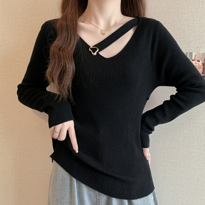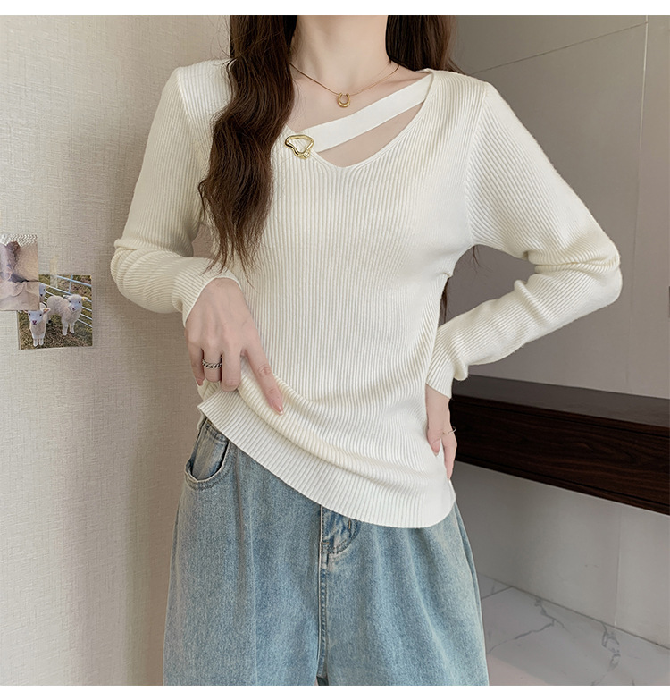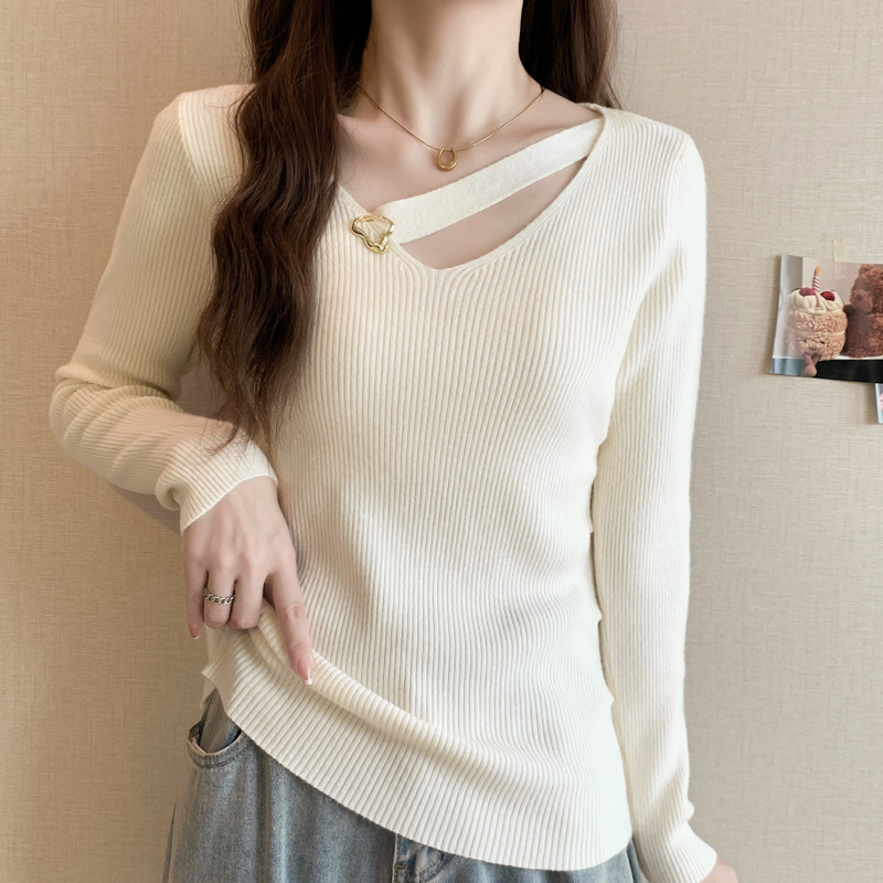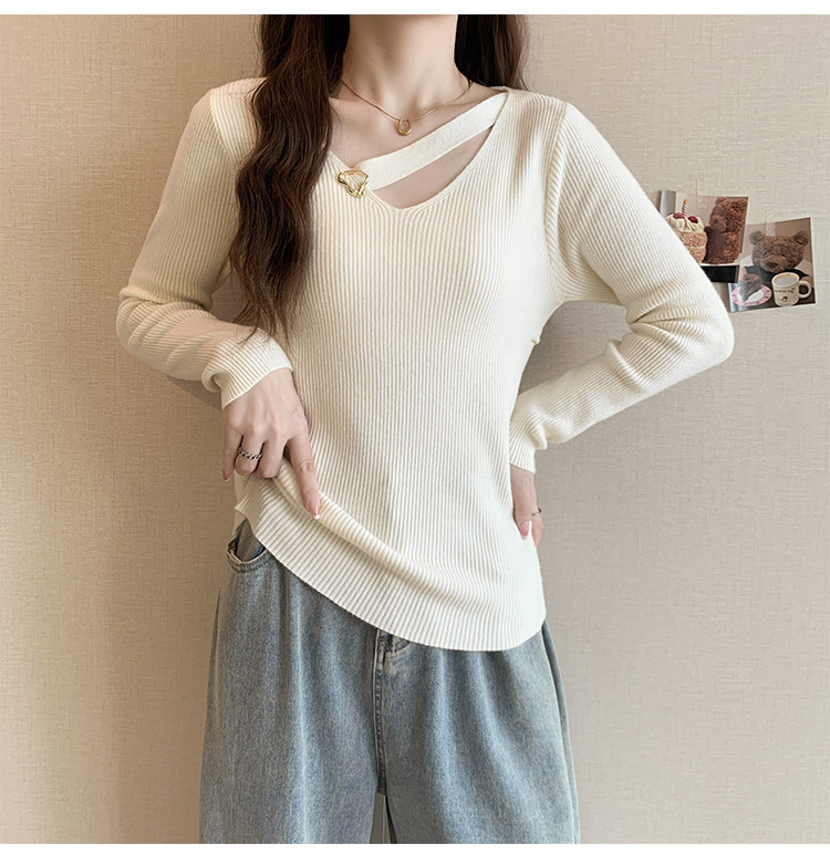 중공 디자인 센스 긴 소매베이스 셔츠 여성용 내복 가을 새 Collarbone 케어 기계 니트 V-Neck 스웨터 외부 착용