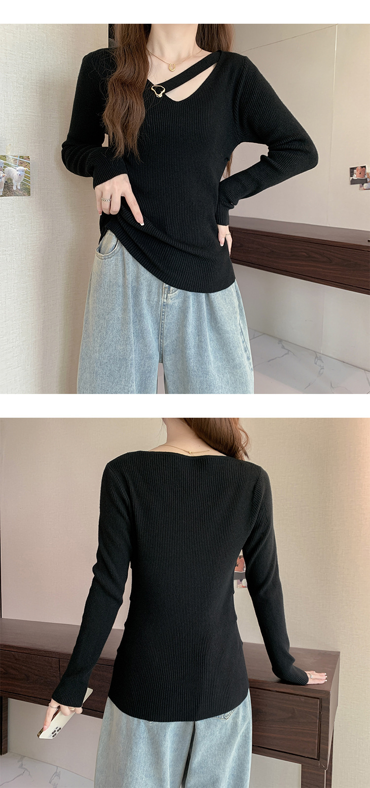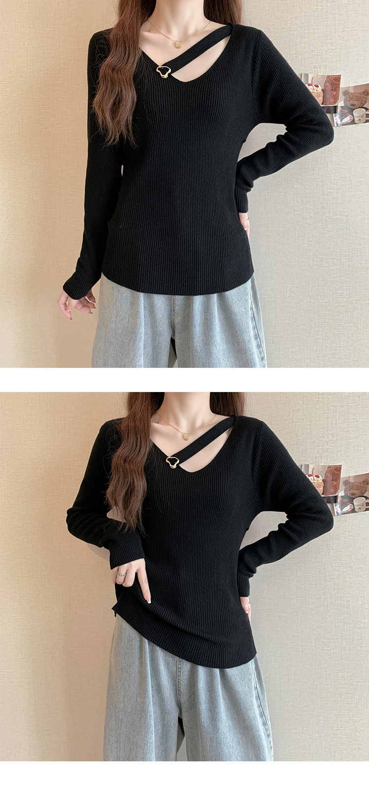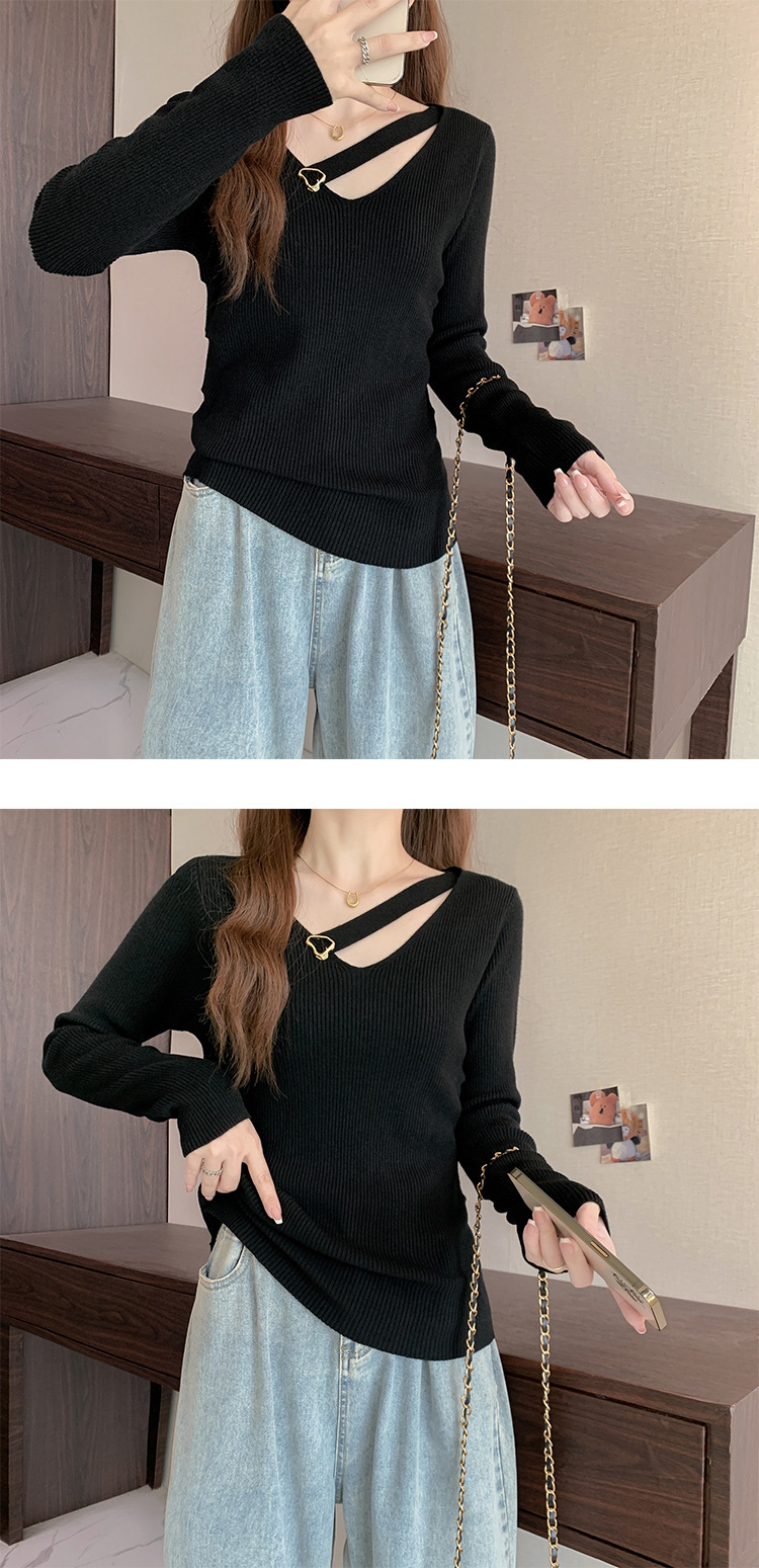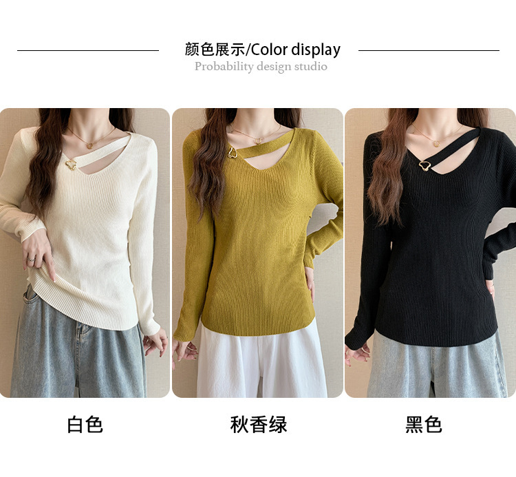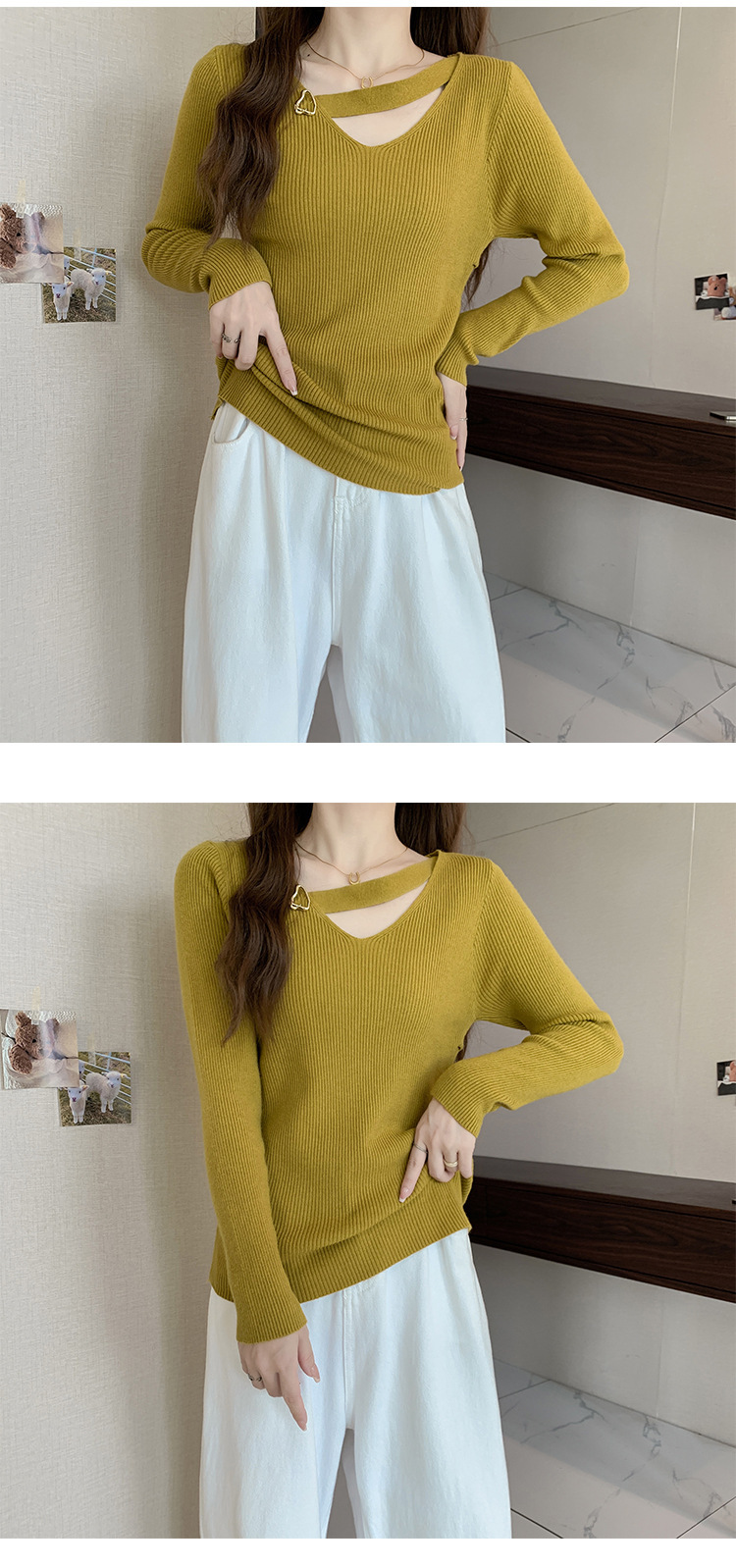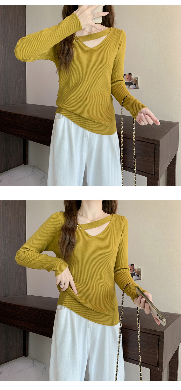 중공 디자인 센스 긴 소매베이스 셔츠 여성용 내복 가을 새 Collarbone 케어 기계 니트 V-Neck 스웨터 외부 착용