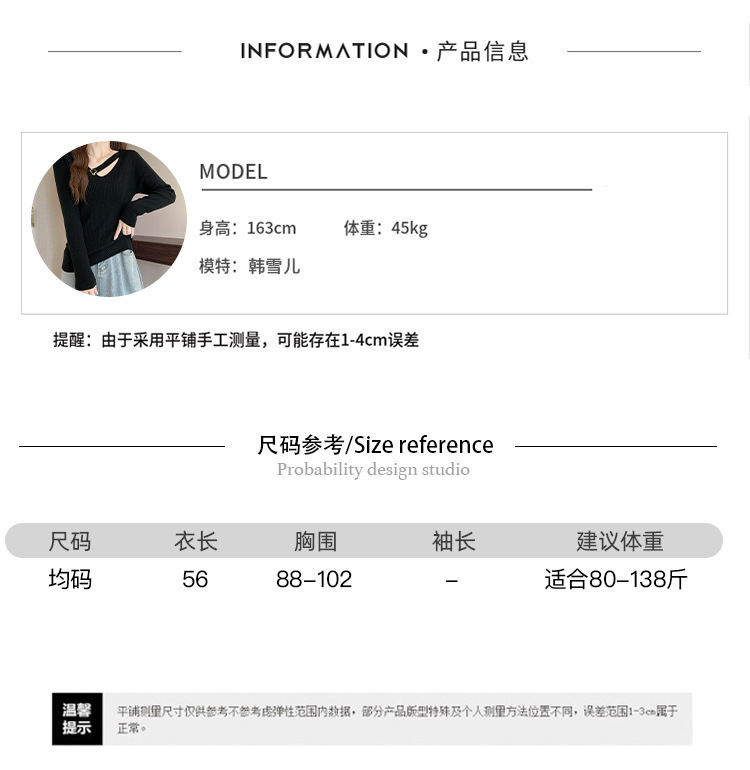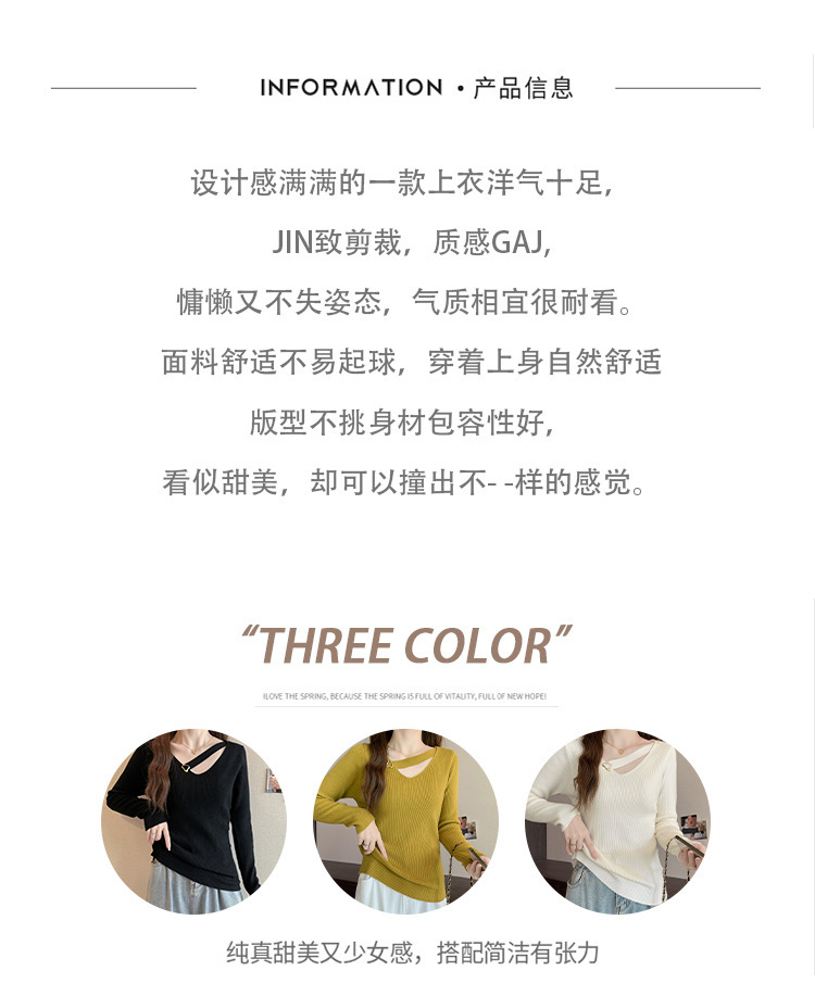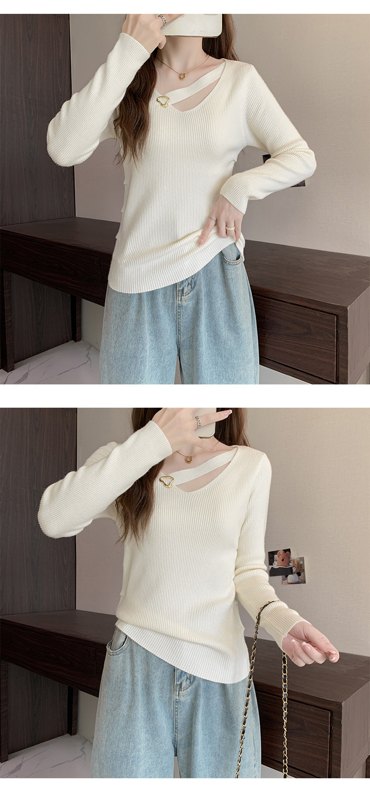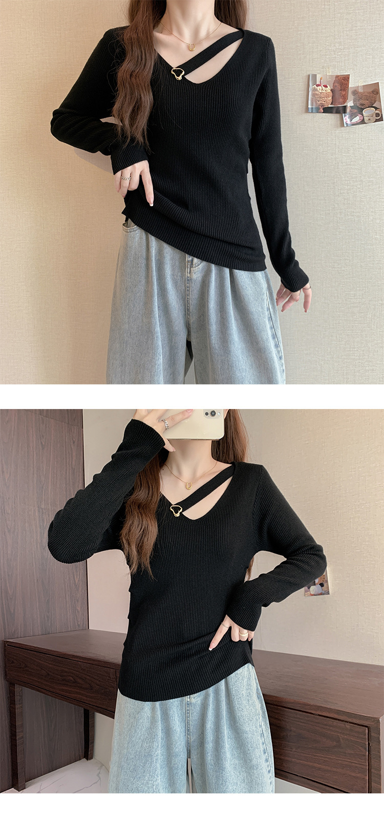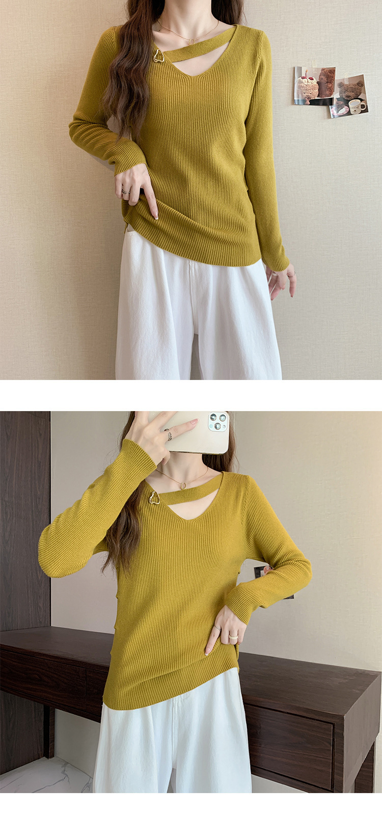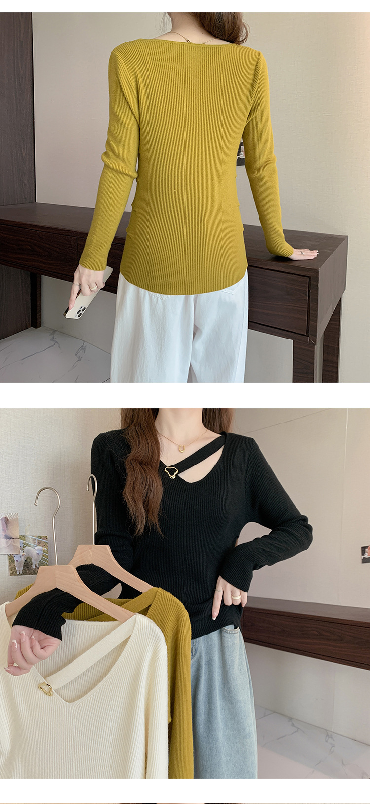 중공 디자인 센스 긴 소매베이스 셔츠 여성용 내복 가을 새 Collarbone 케어 기계 니트 V-Neck 스웨터 외부 착용