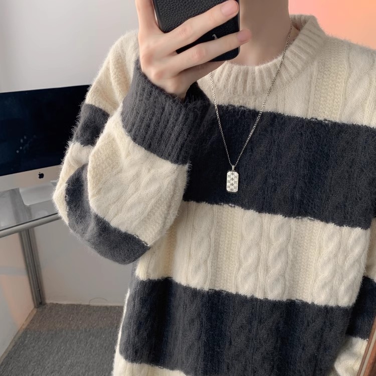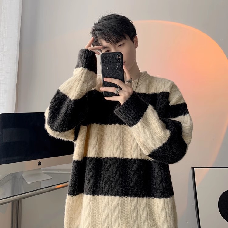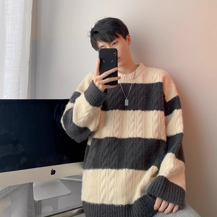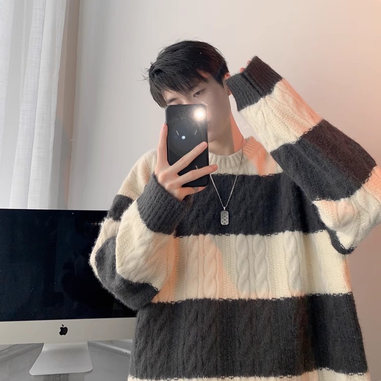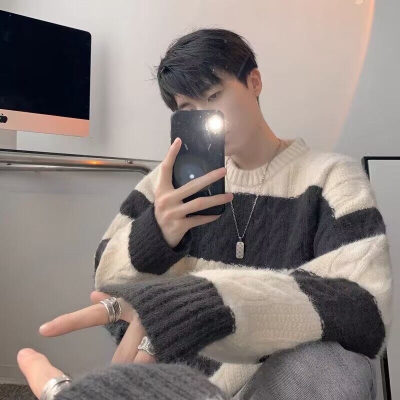 명암 줄무늬 스웨터 남자의 가을과 겨울 일본 스타일 Bottoming 게으른 니트 스웨터 청소년 느슨한 스웨터 코트