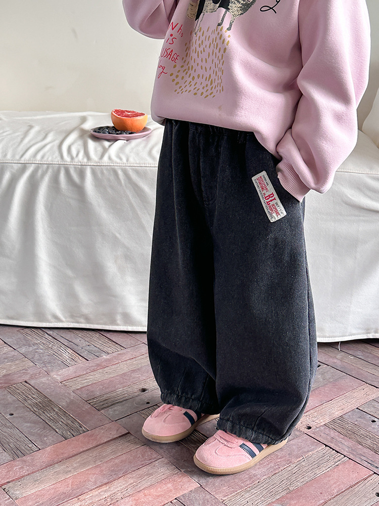 【클리어런스 상품】아동용 한국 스타일 기모 라벨 복합 오리지널 벨벳 일체형 캐주얼 루즈핏 데님 팬츠