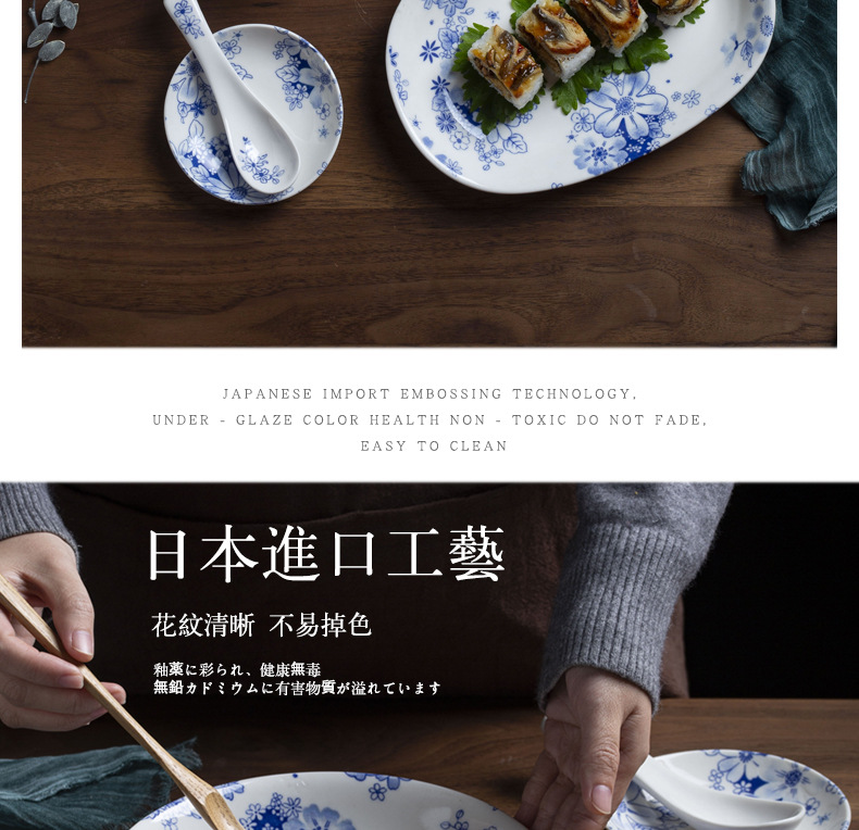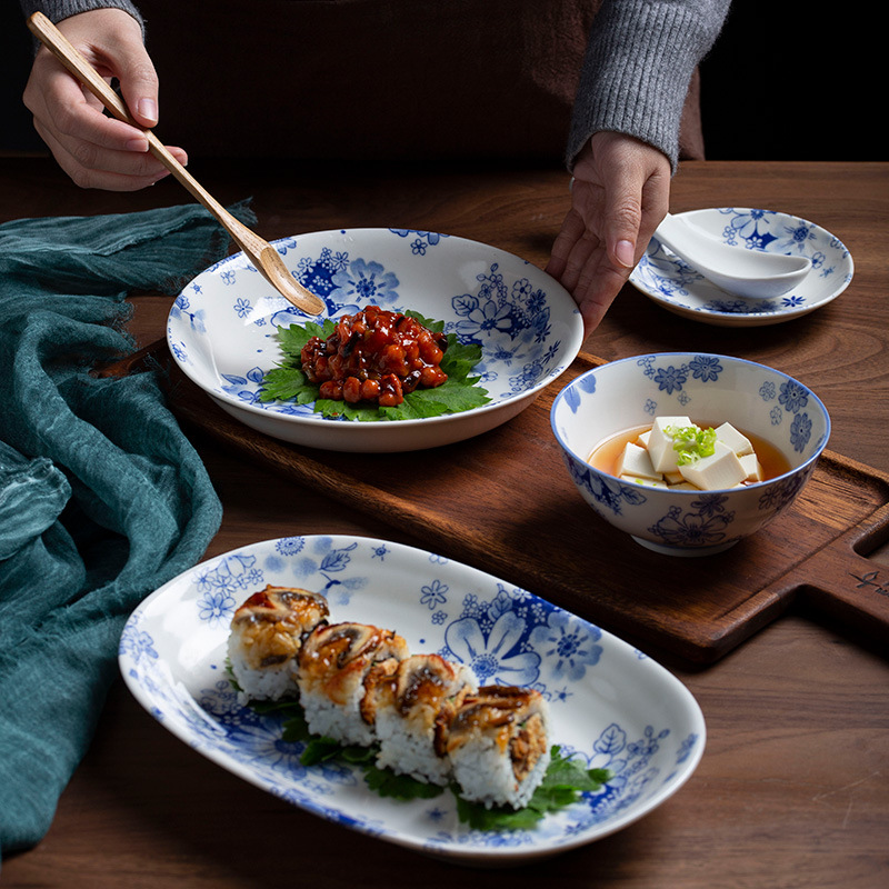 일본식 파란색과 흰색 세라믹 식기 세트 녹은 색 뼈 접시 깊은 밥 그릇 요리 수프 국수 그릇