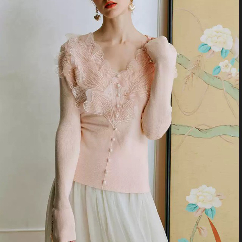 핑크색 깃털 혼방 니트 스웨터 여성용 2025 봄 신상 레이스 스타일 긴팔 상의스토어 가기