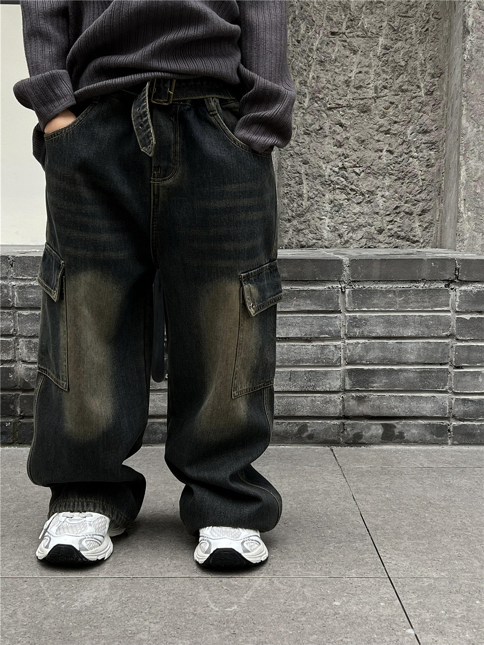 2024 겨울 아동용 두꺼운 데님 팬츠 트렌디 브랜드 빈티지 노란색 진흙 염색 작업복 벨트 남녀 아동용 패셔너블 바지스토어 가기