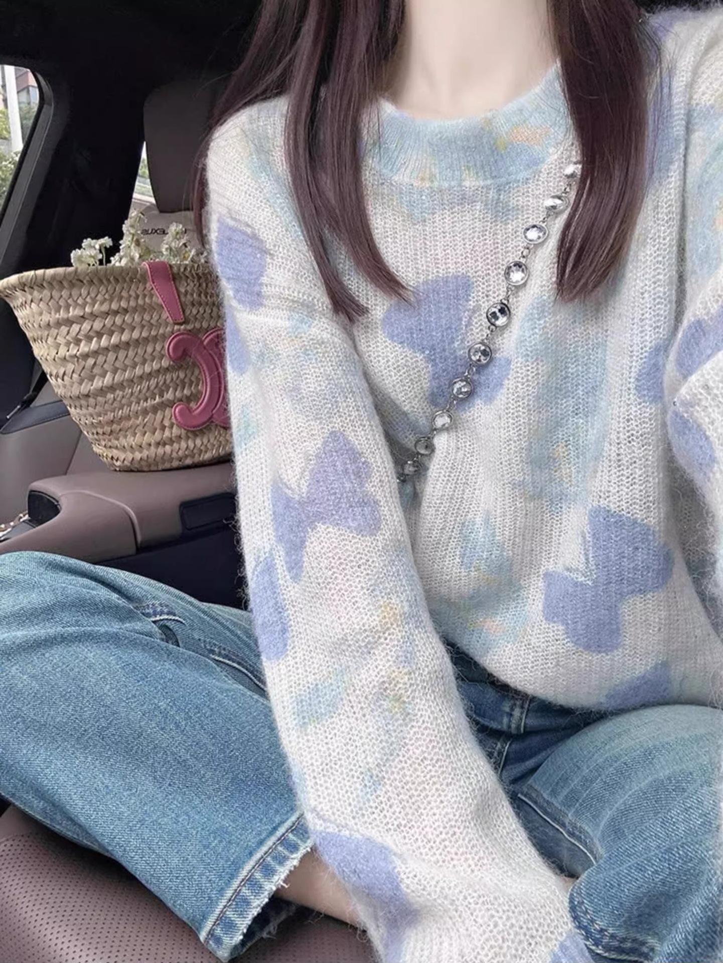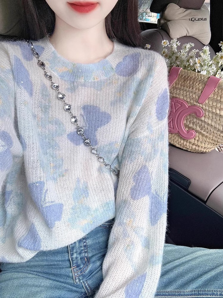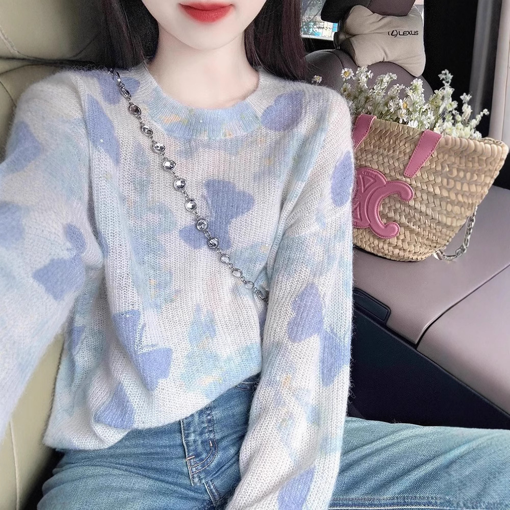 블루 타이-염료 게으른 스타일 풀오버 스웨터 여성의 봄과 가을 착용 한국 스타일 느슨한 짧은 스웨터 탑 작은 여성스토어 가기
