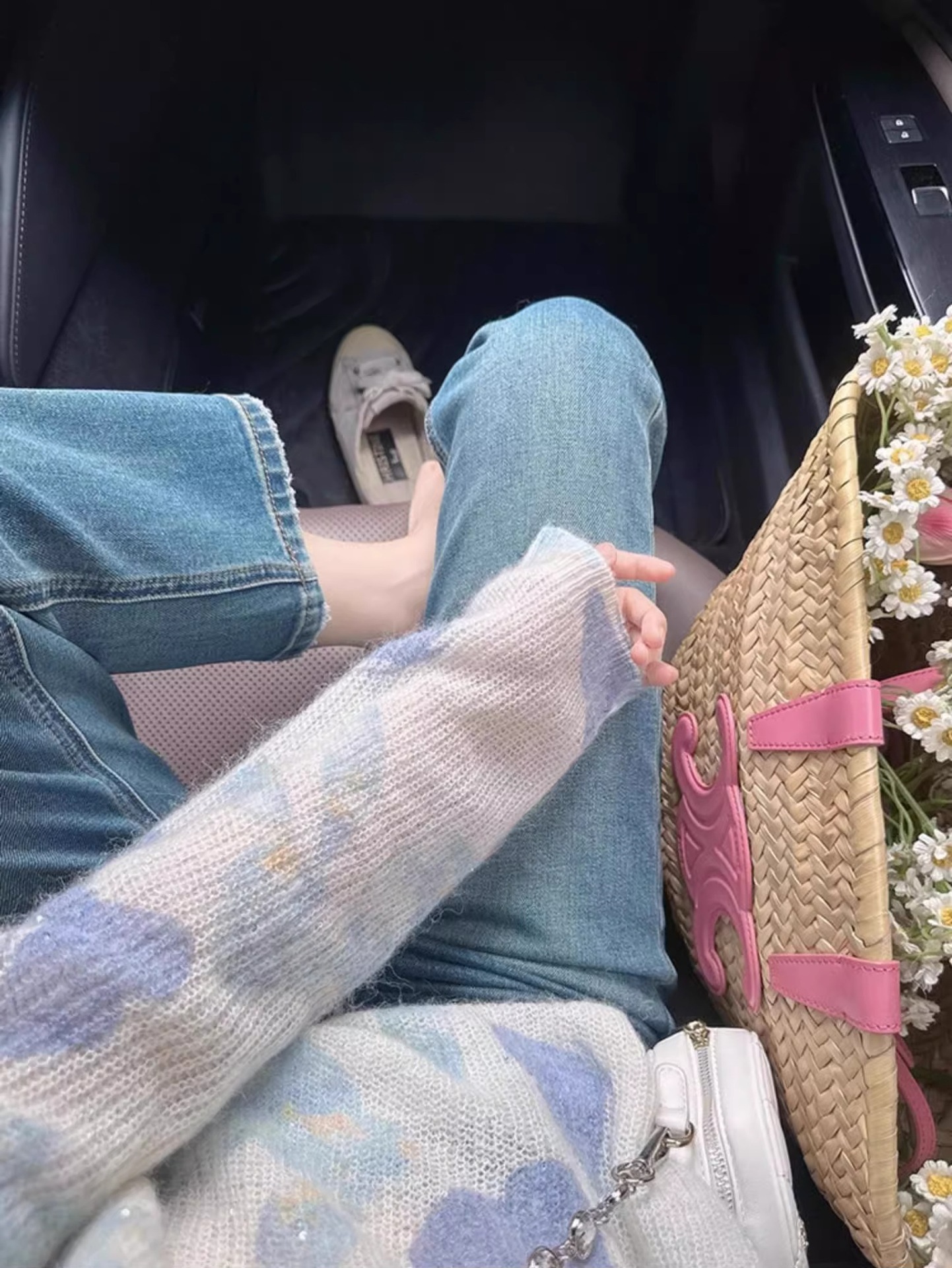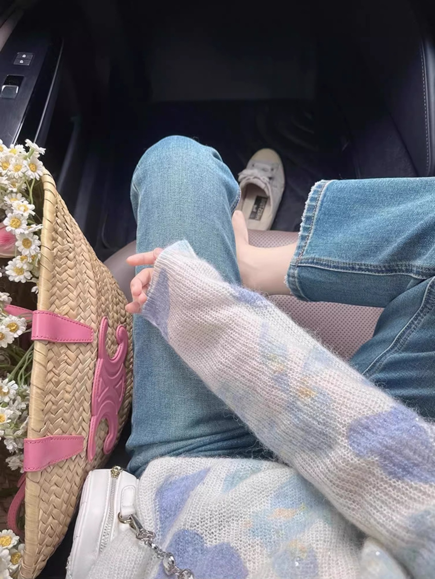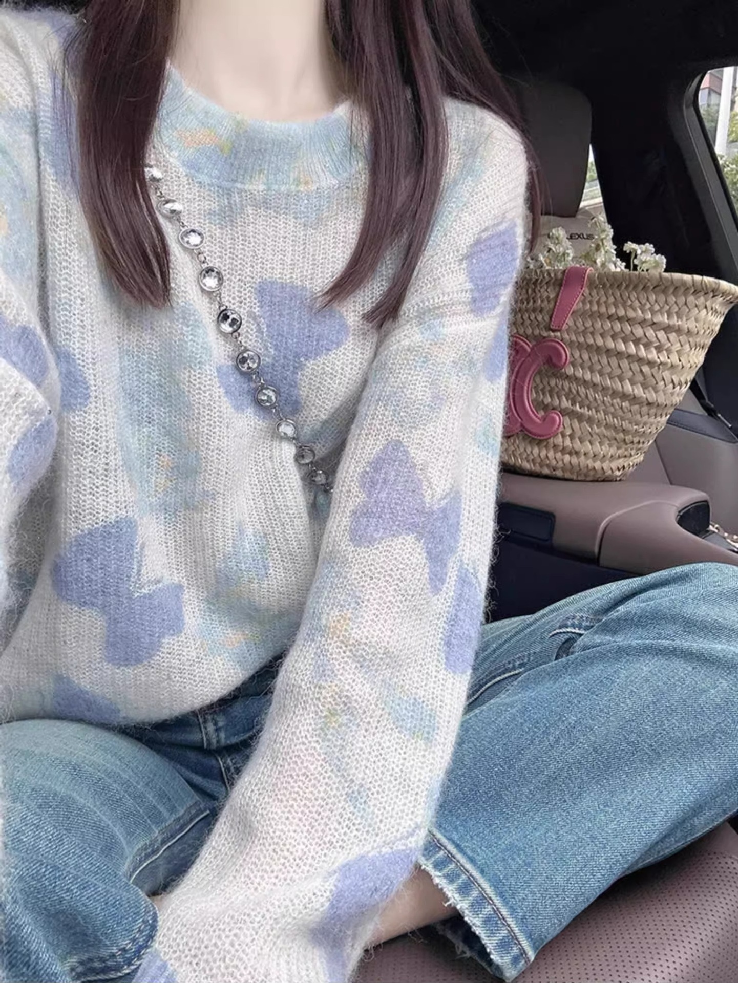블루 타이-염료 게으른 스타일 풀오버 스웨터 여성의 봄과 가을 착용 한국 스타일 느슨한 짧은 스웨터 탑 작은 여성스토어 가기
