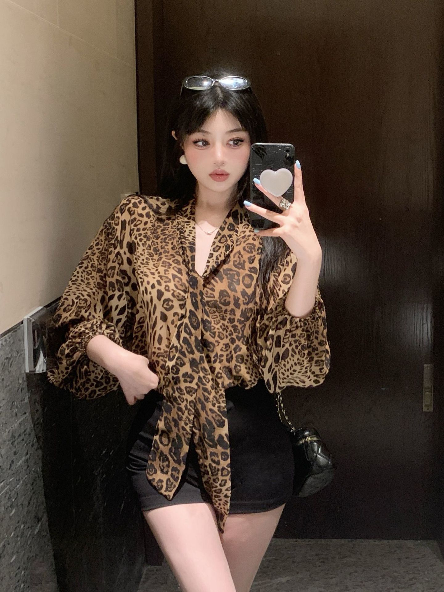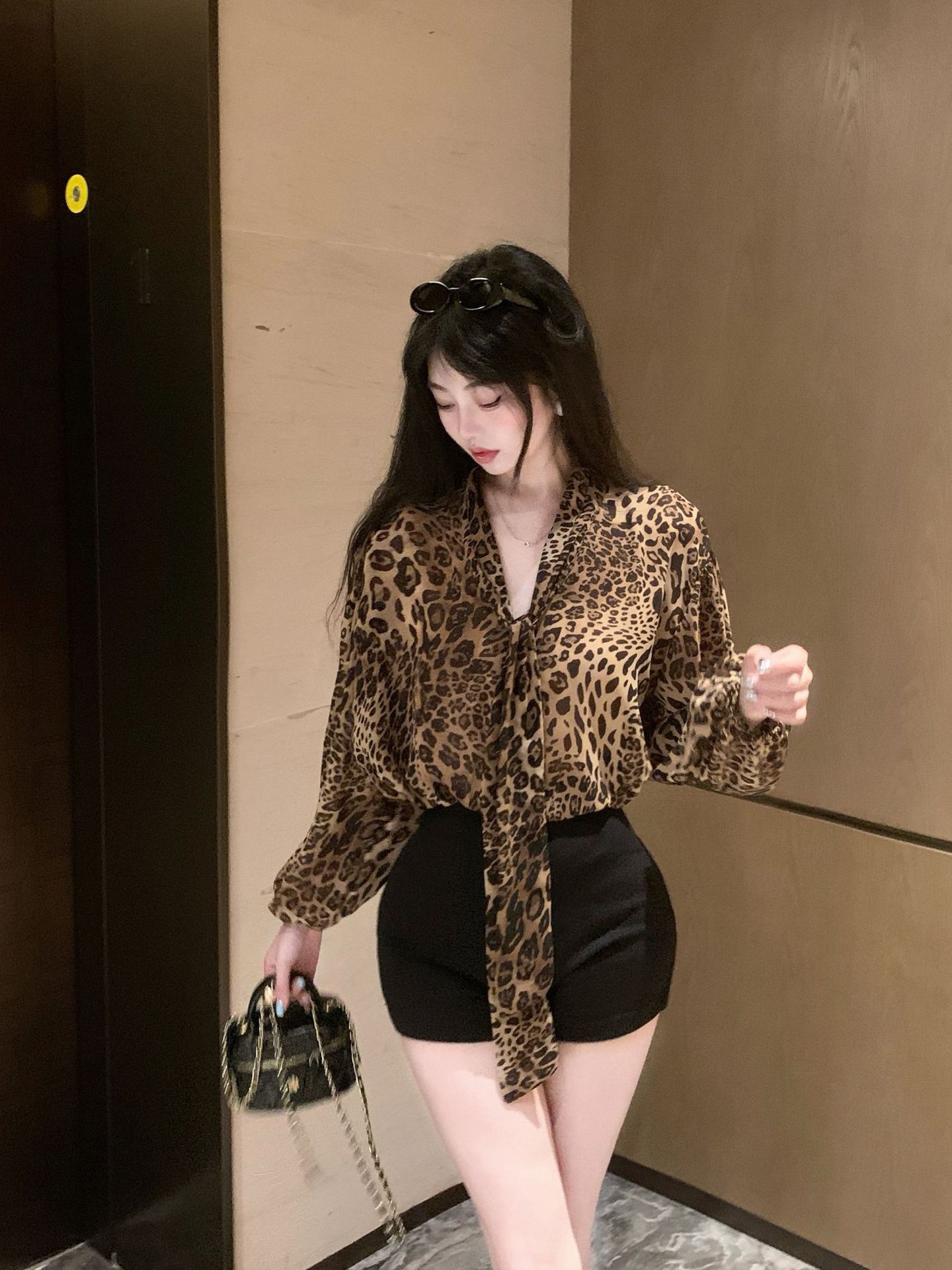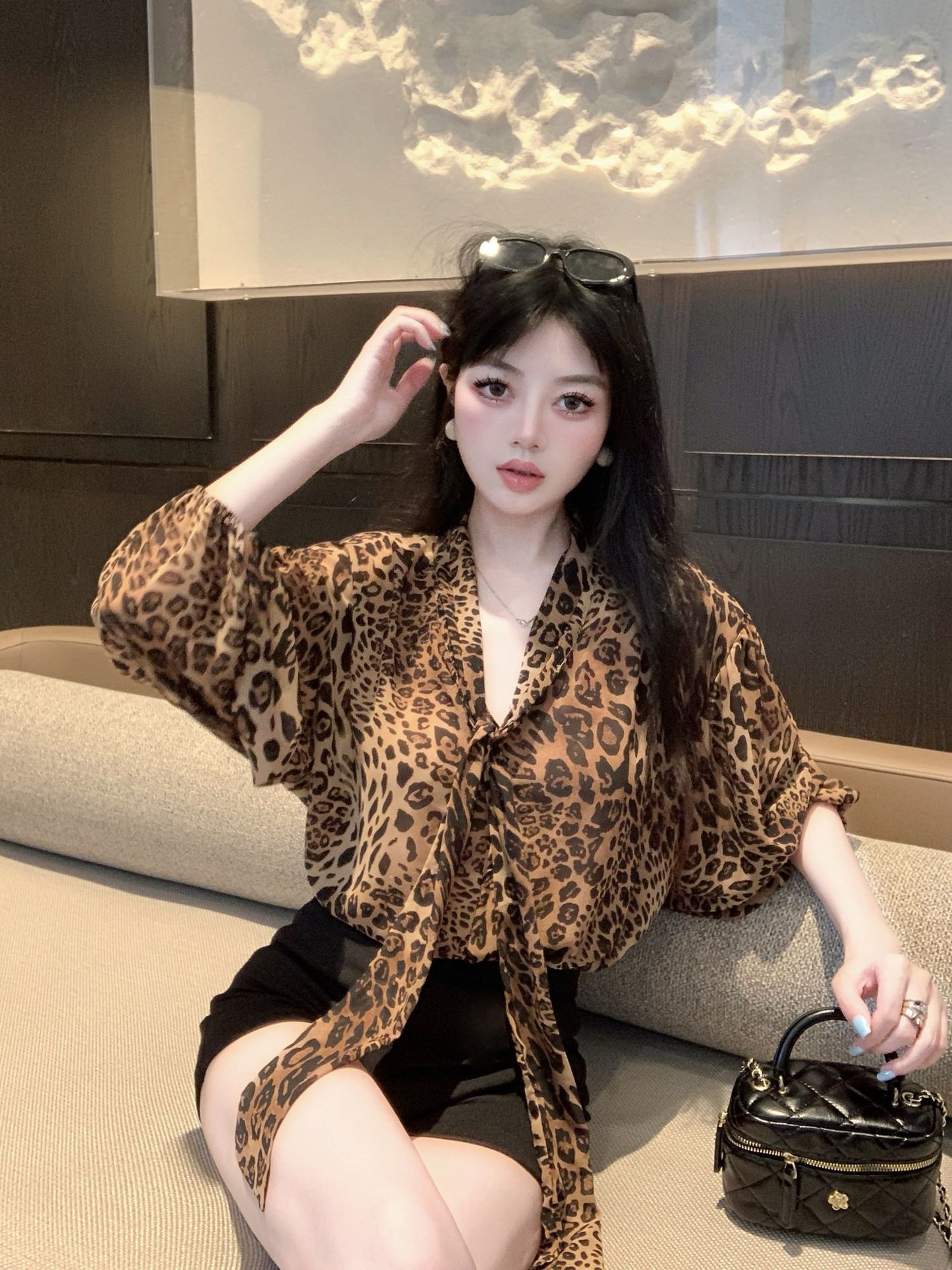 아메리칸 스타일 레이스 업 넥 레오파드 무늬 쉬폰 셔츠 여성 여름 프랑스 스타일 랜턴 슬리브 탑 세련되고 아름다운 선스크린 셔츠스토어 가기