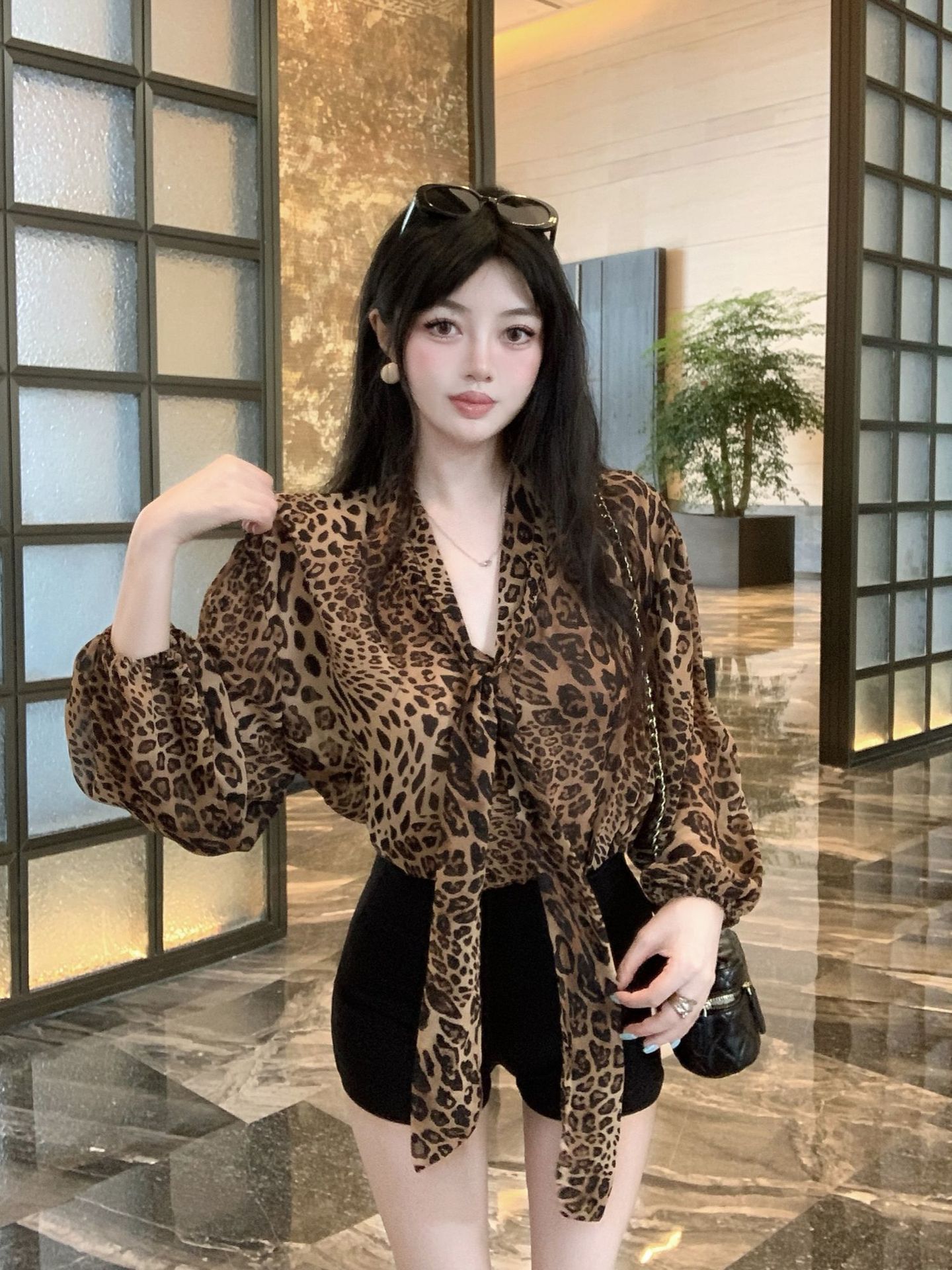 아메리칸 스타일 레이스 업 넥 레오파드 무늬 쉬폰 셔츠 여성 여름 프랑스 스타일 랜턴 슬리브 탑 세련되고 아름다운 선스크린 셔츠