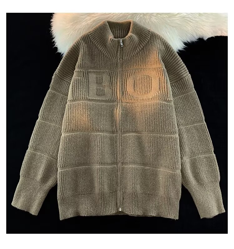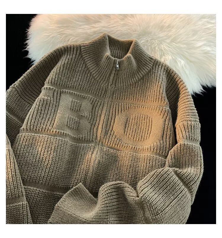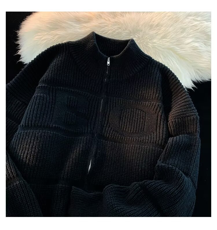 새로운 솔리드 컬러 지퍼 니트 게으른 구덩이 질감 Concave 자수 카디건 수직 칼라 스웨터 남성 및 여성 커플 남성용 니트 스웨터
