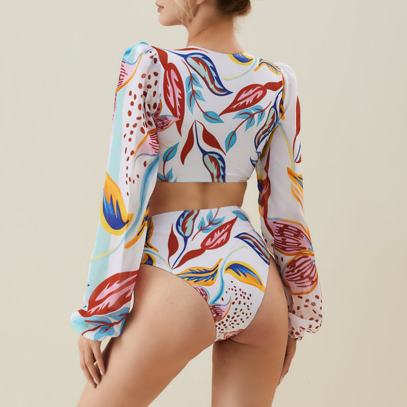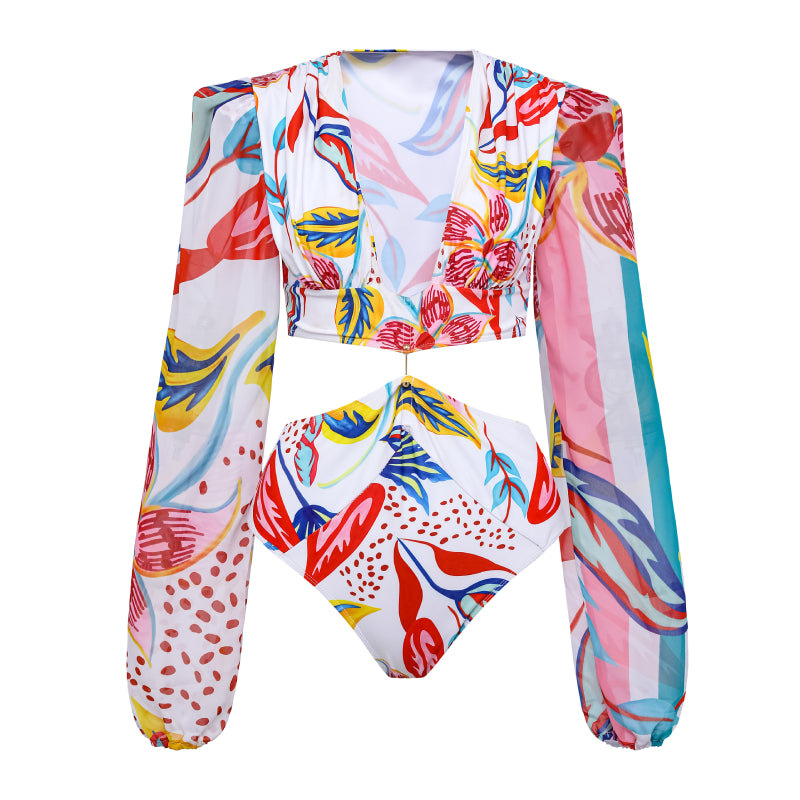 2024 유럽과 미국의 수영복 새로운 V-목 긴 소매 할로우 인쇄 수영복 여성용 국경 핫 2375
