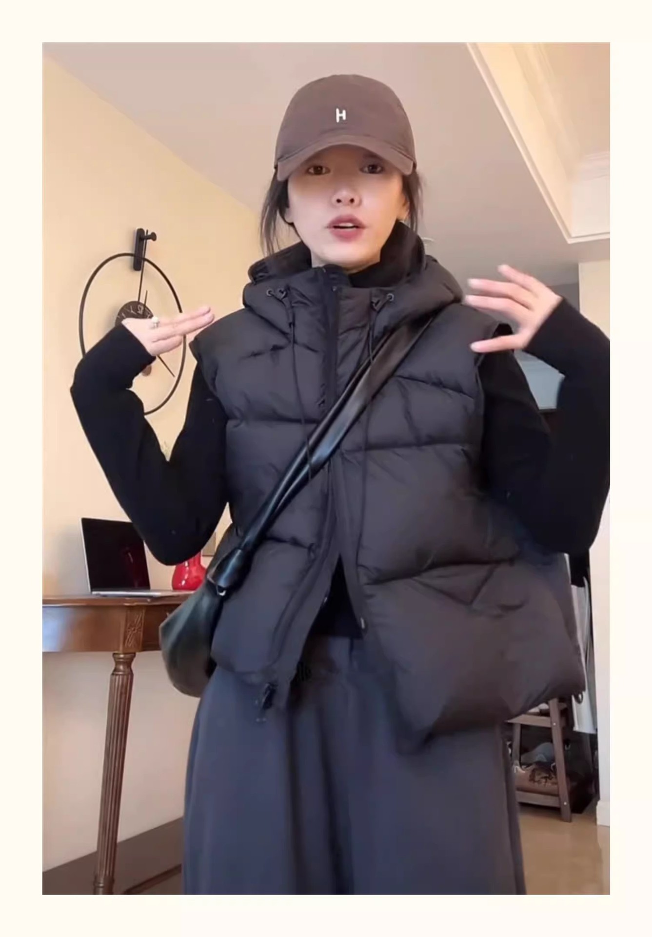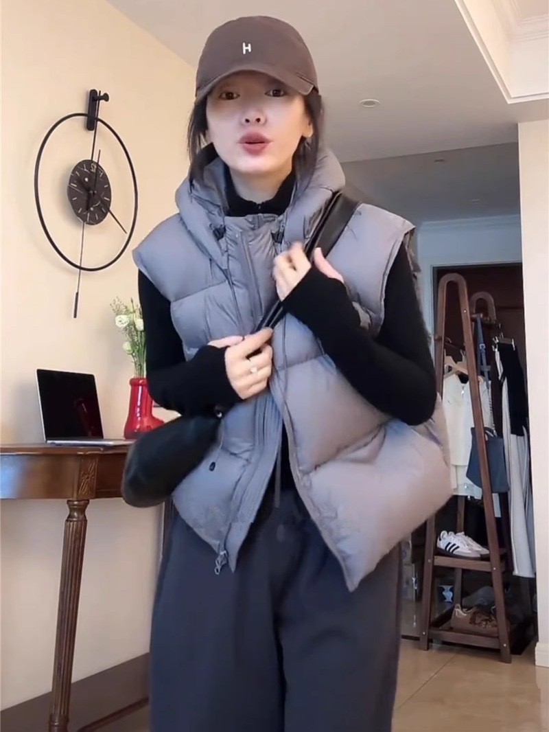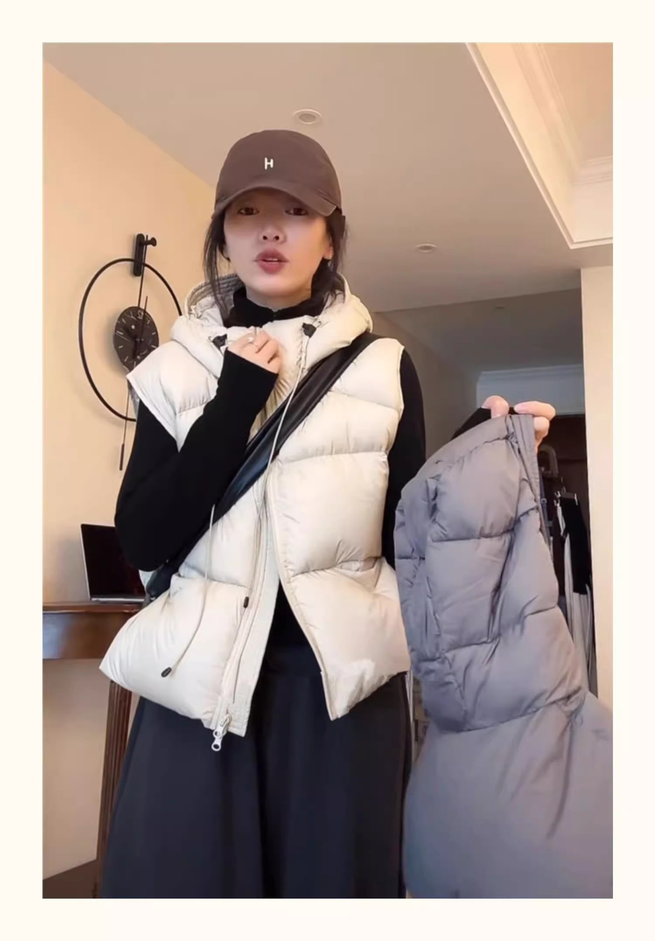 짧은 흰 오리 후드가 달린 조끼 여자의 2024 겨울 새로운 느슨한 슬리밍 하이 엔드 센스 작은 어깨 웨어스토어 가기