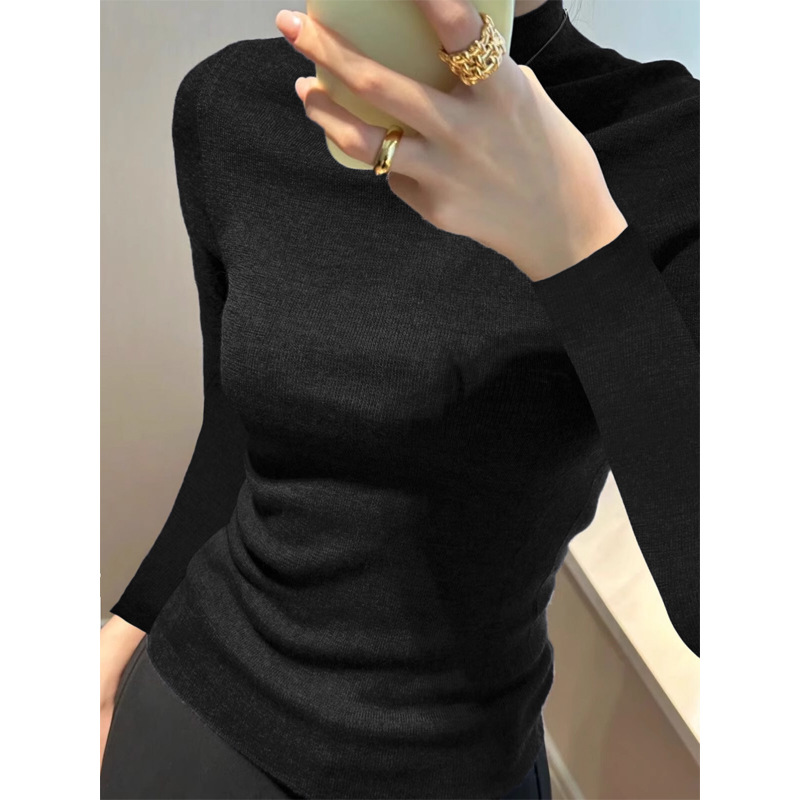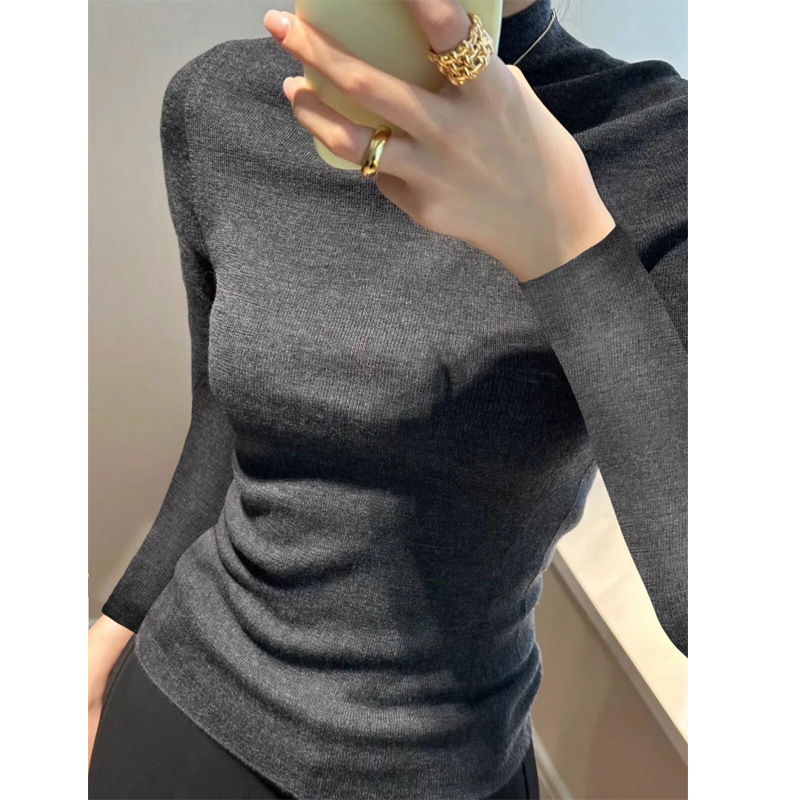 세미 하이 칼라 고급 다크 그레이 바닥 셔츠 여성의 2024 가을과 겨울 새로운 소프트 왁스 니트 스웨터 꽉 끼는 스웨터스토어 가기