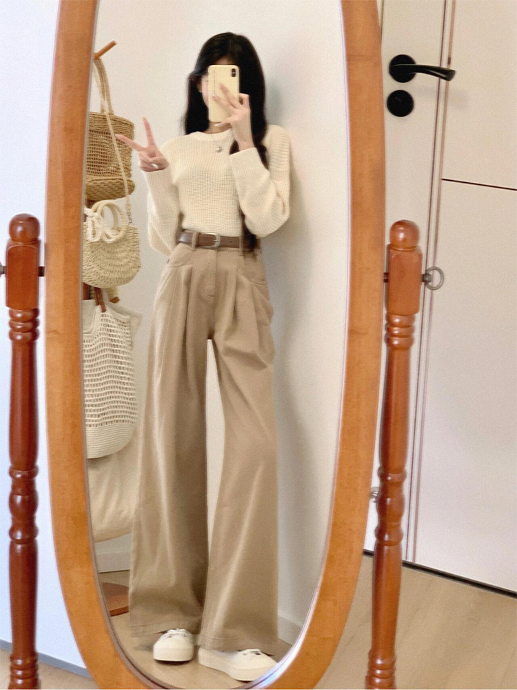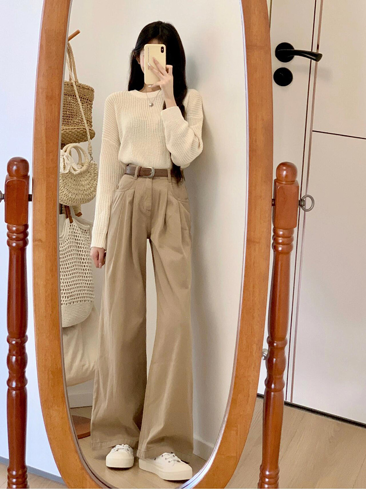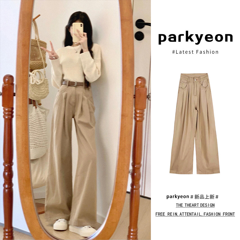 홍콩 스타일 빈티지 카키 넓은 다리 청바지 여성의 가을 다크 브라운 높은 허리 느슨한 슬리밍 스트레이트 다리 넓은 다리 긴 바지