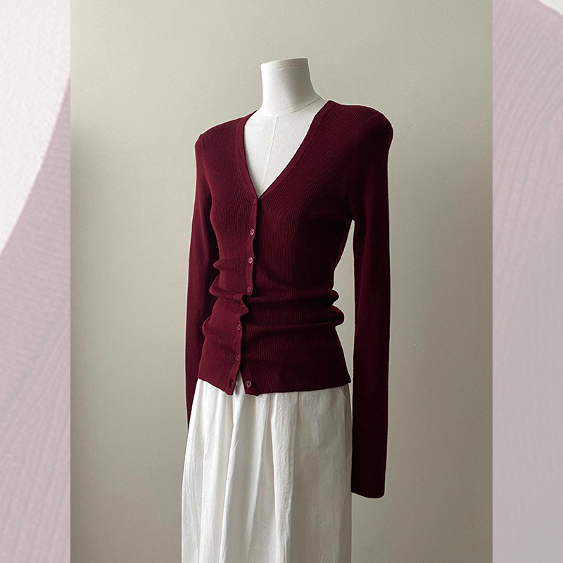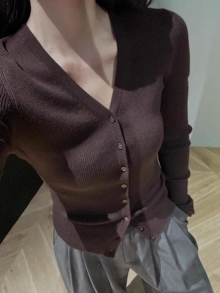 프랑스 스타일 다크 브라운 V-Neck 울 니트 카디건 여성의 봄과 가을 하이 엔드 센스 슬림 핏 짧은 스웨터베이스 레이어 탑스토어 가기
