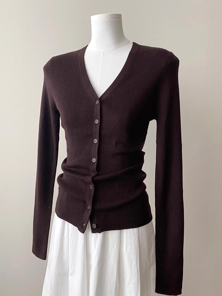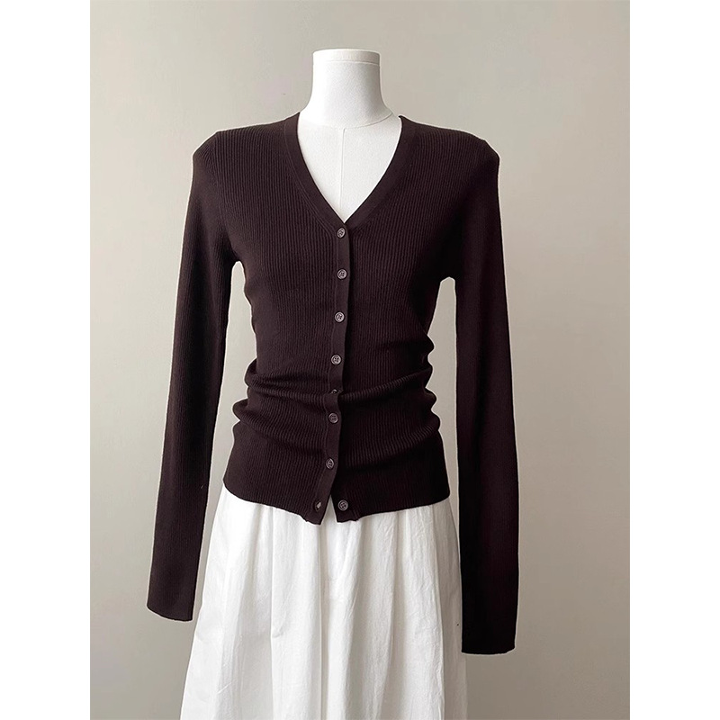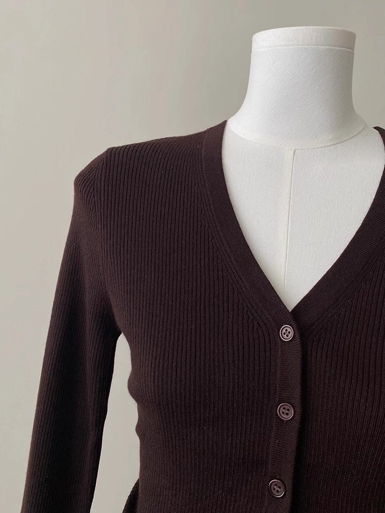 프랑스 스타일 다크 브라운 V-Neck 울 니트 카디건 여성의 봄과 가을 하이 엔드 센스 슬림 핏 짧은 스웨터베이스 레이어 탑