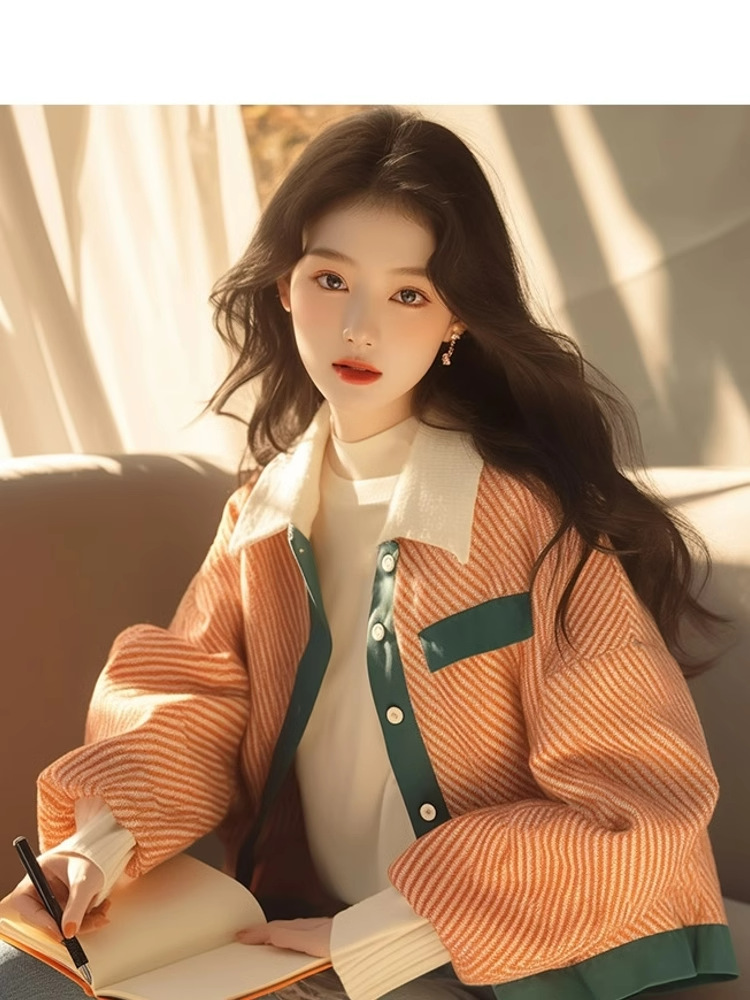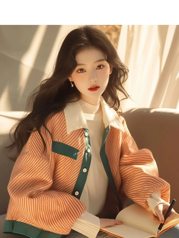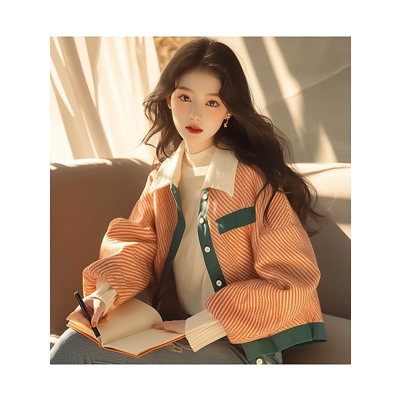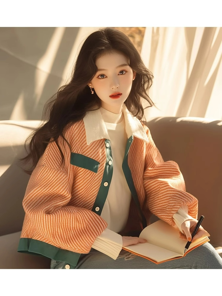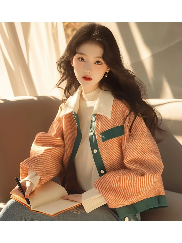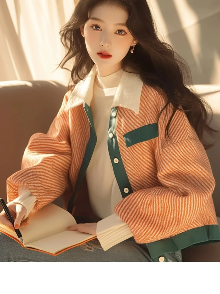 가을 2024 새로운 인기있는 한국 스타일 유행 하이 엔드 오렌지 줄무늬 프린트 옷깃 재킷 작은 남성스토어 가기