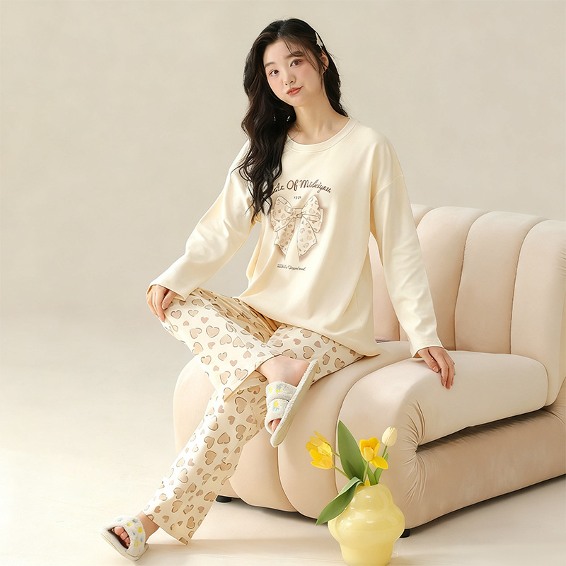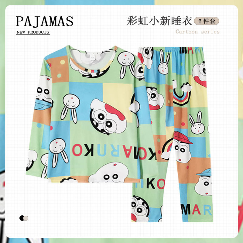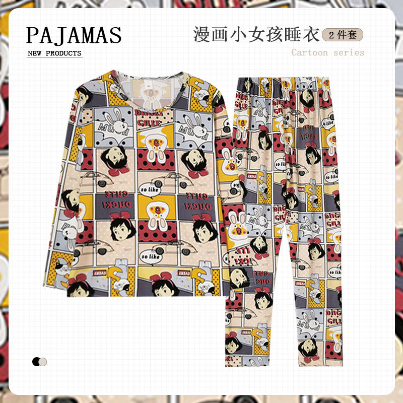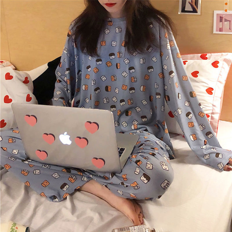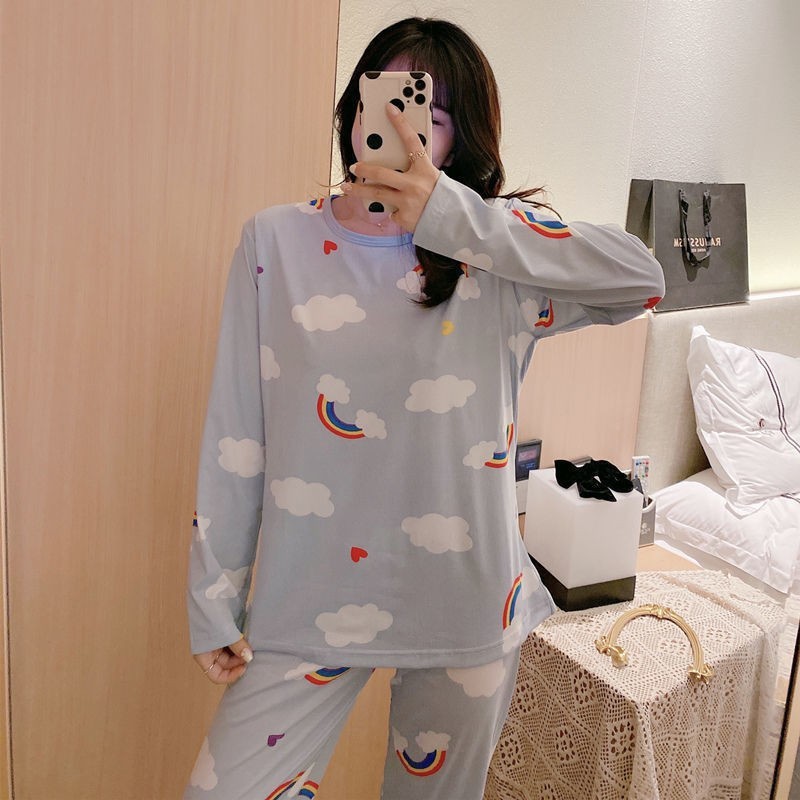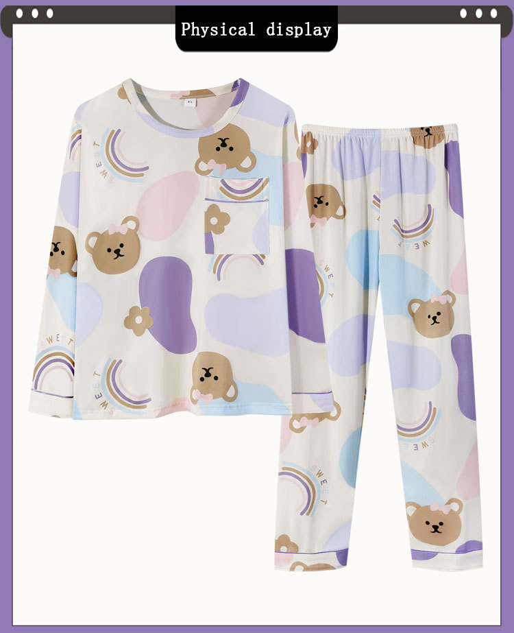 가을 겨울 만화 무지개 곰 신상 잠옷 여성용 긴팔 긴바지 외출 가능 루즈핏 여성 홈웨어 세트 얇은 소재