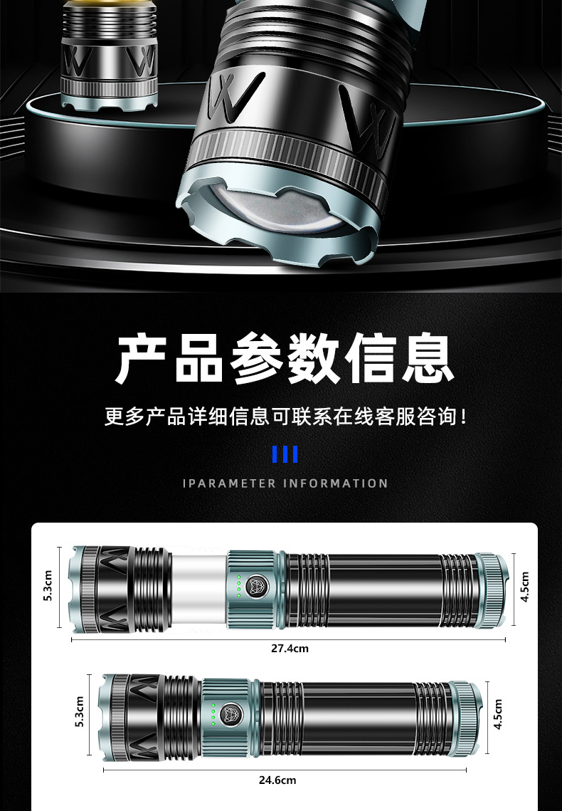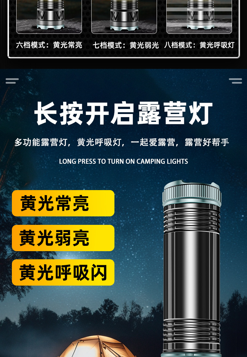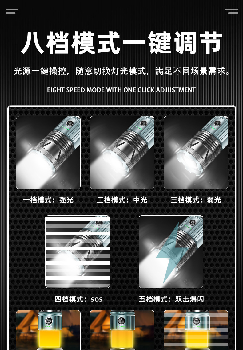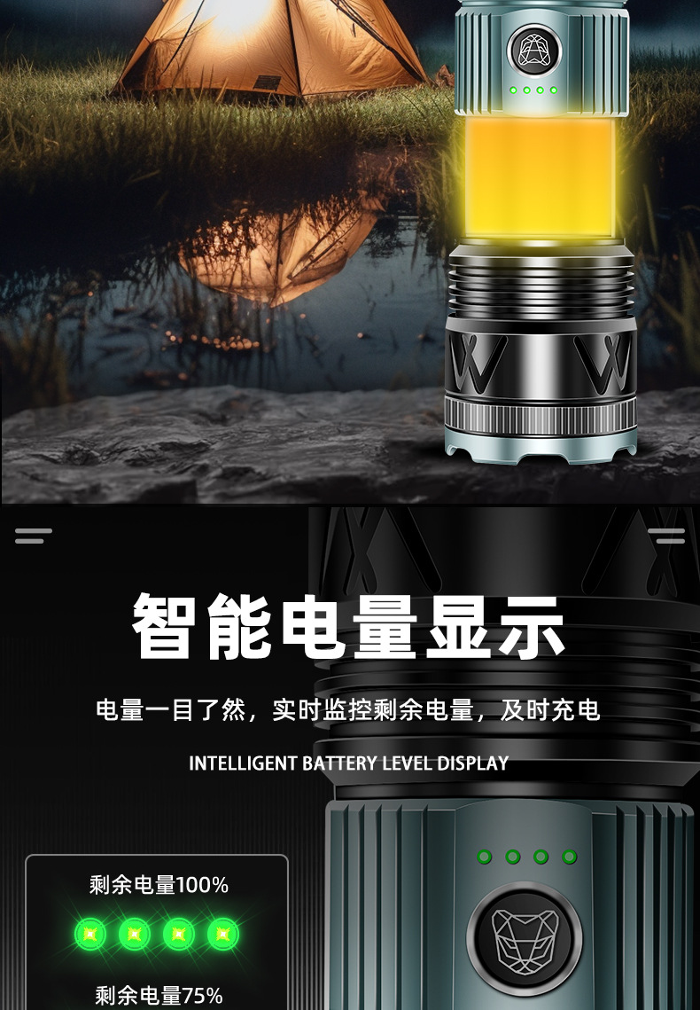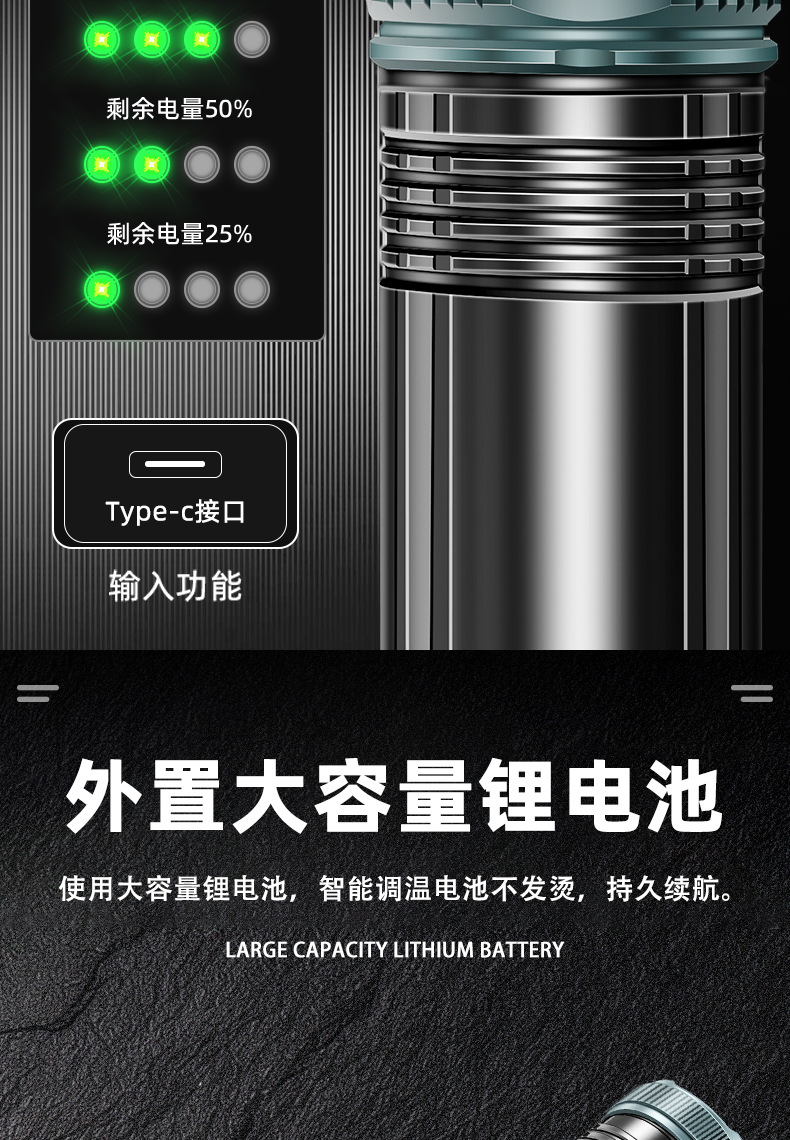 국경 간 새로운 손전등 알루미늄 합금 손전등 충전식 야외 다기능 비상 조명 오래 지속되는 배터리 수명