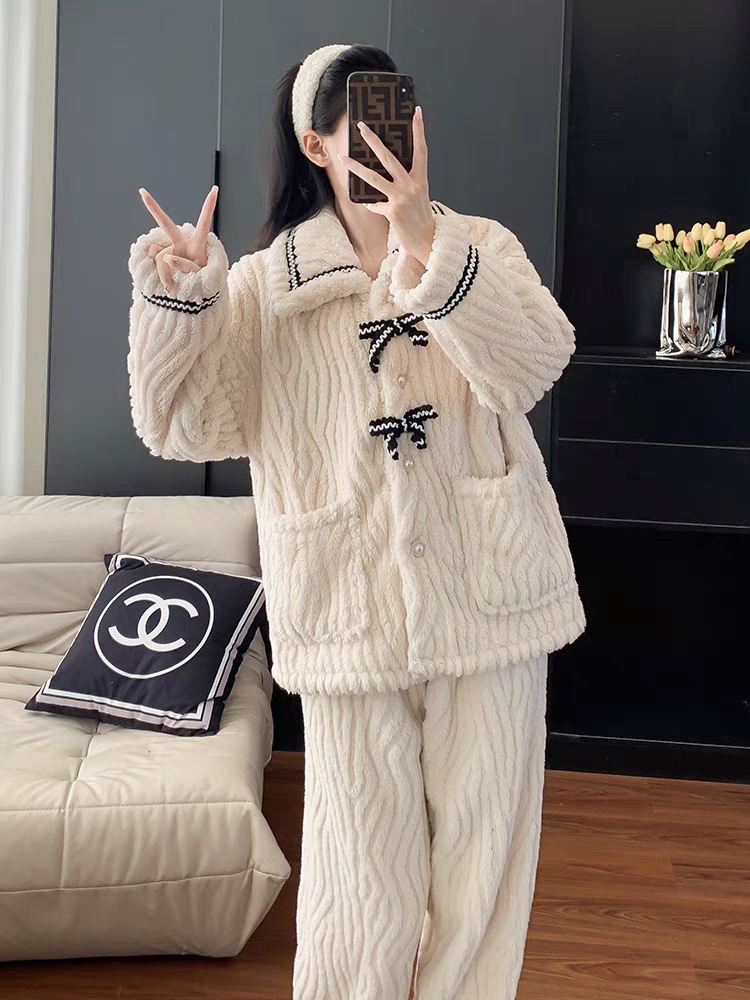 겨울용 달콤한 리본 잠옷 세트 여성용 플러스 벨벳 두꺼운 코랄 벨벳 외출복 홈웨어 따뜻한 인스 스타일