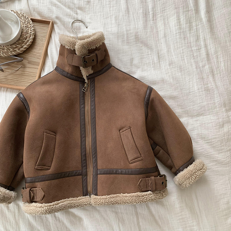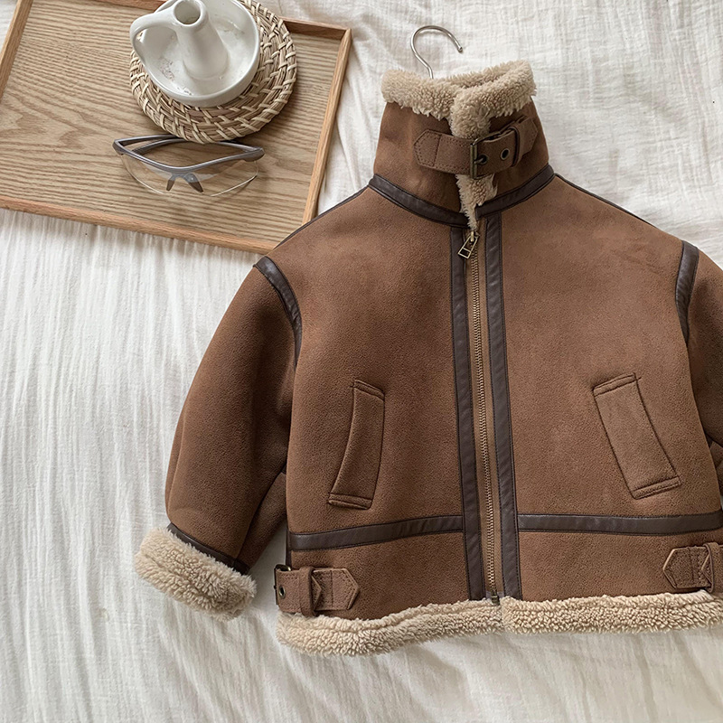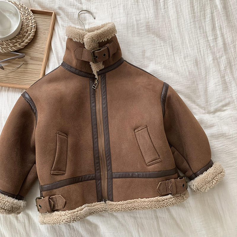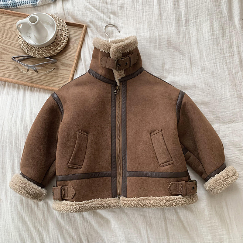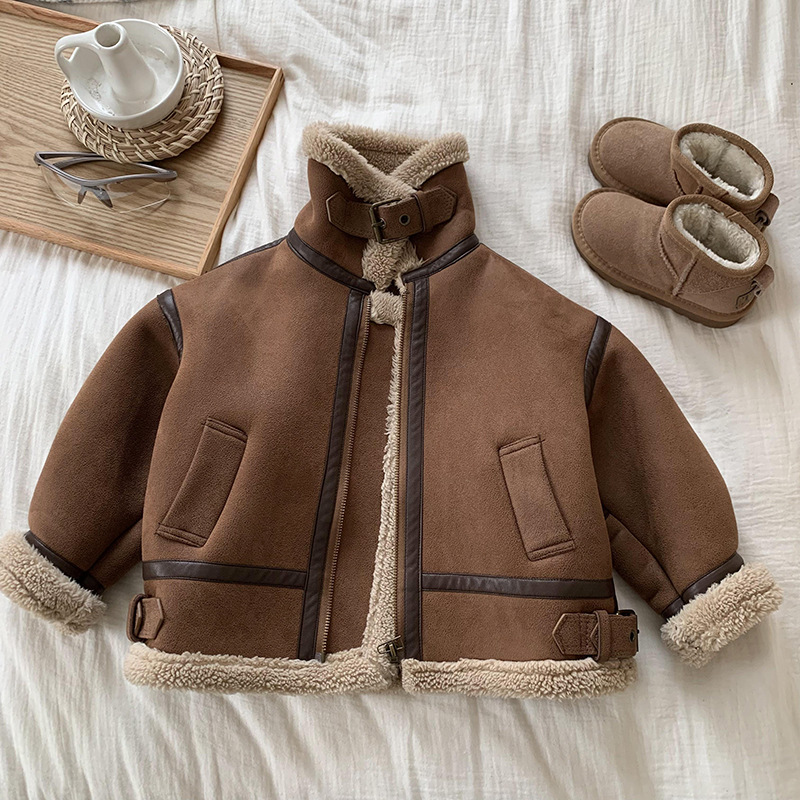 소년 모피 한 양가죽 가죽 코트 겨울 2024 소녀를위한 새로운 어린이 양가죽 기모 재킷스토어 가기