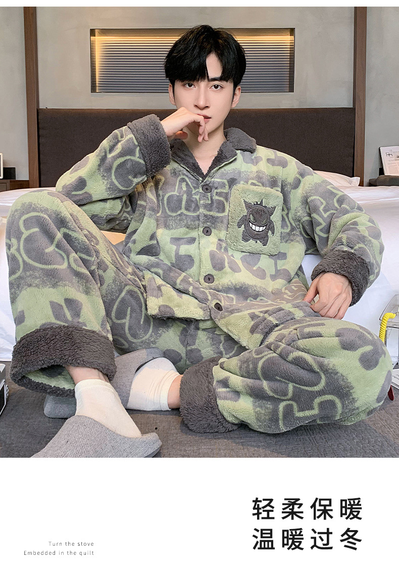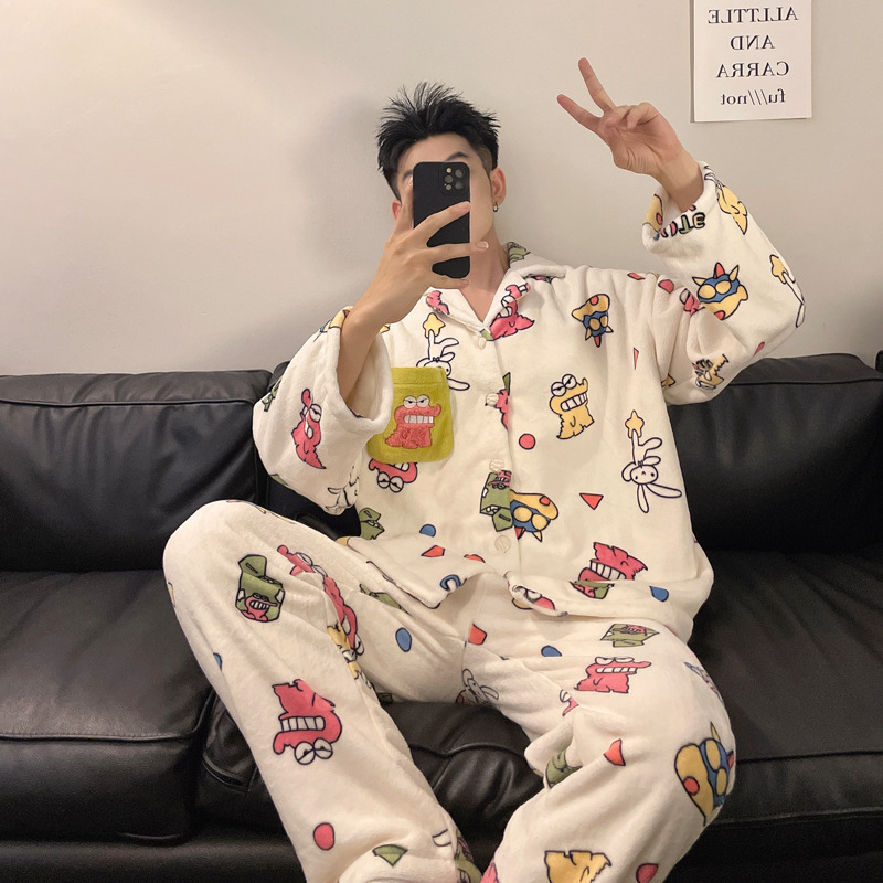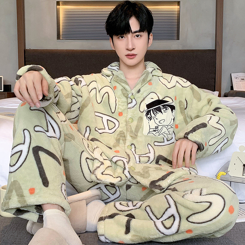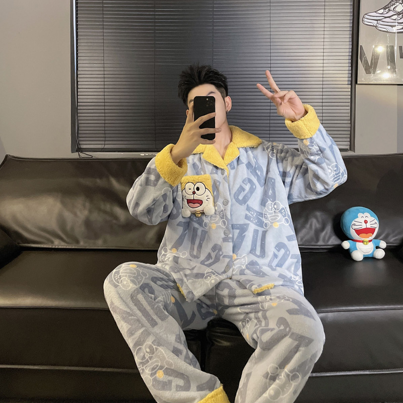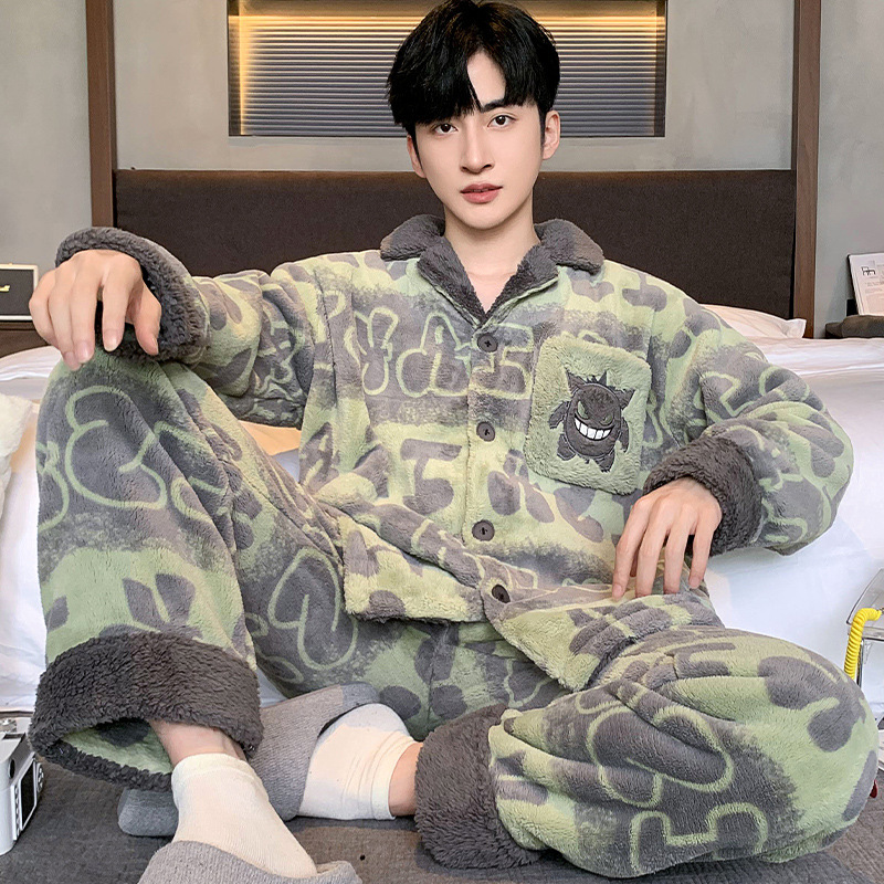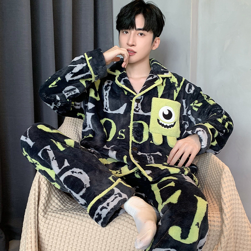 겨울 잠옷 남자 기모 두꺼운 산호 양털 만화 캐주얼 플러스 사이즈 플란넬 남자 홈 옷 투피스 세트스토어 가기