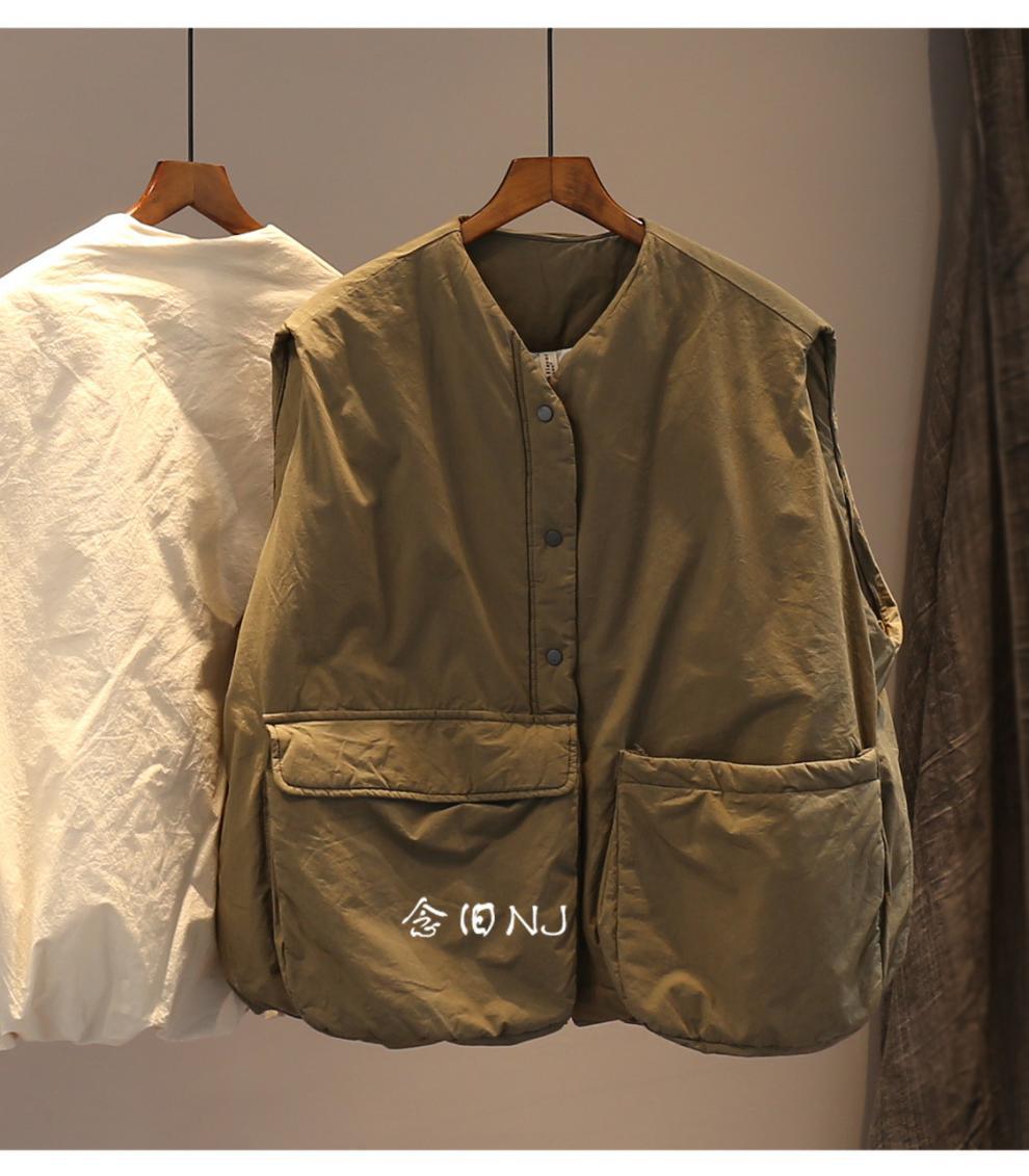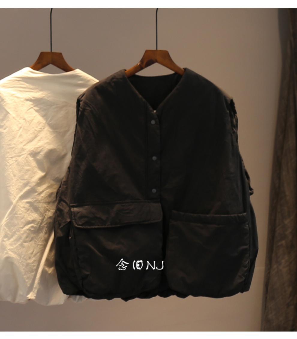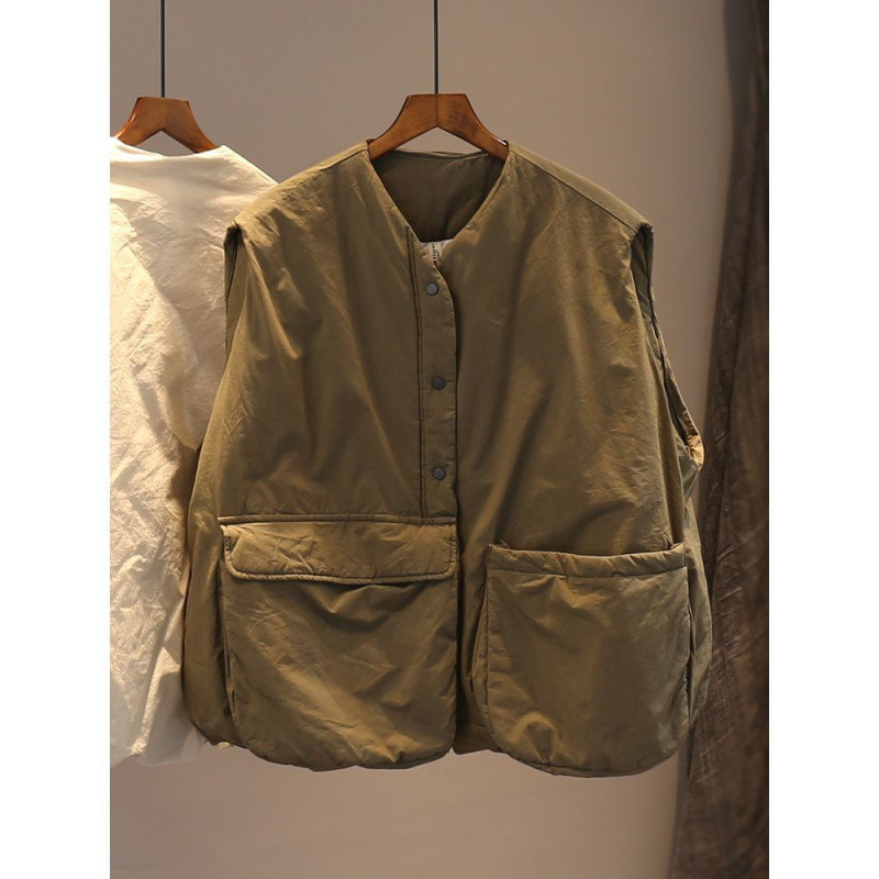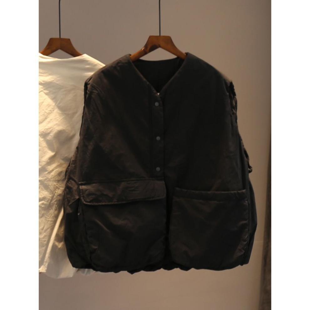 H8A 예술적 플러스 사이즈 단색 대형 포켓 클립 코튼 조끼 여성의 겨울 두꺼운 캐주얼 민소매 조끼