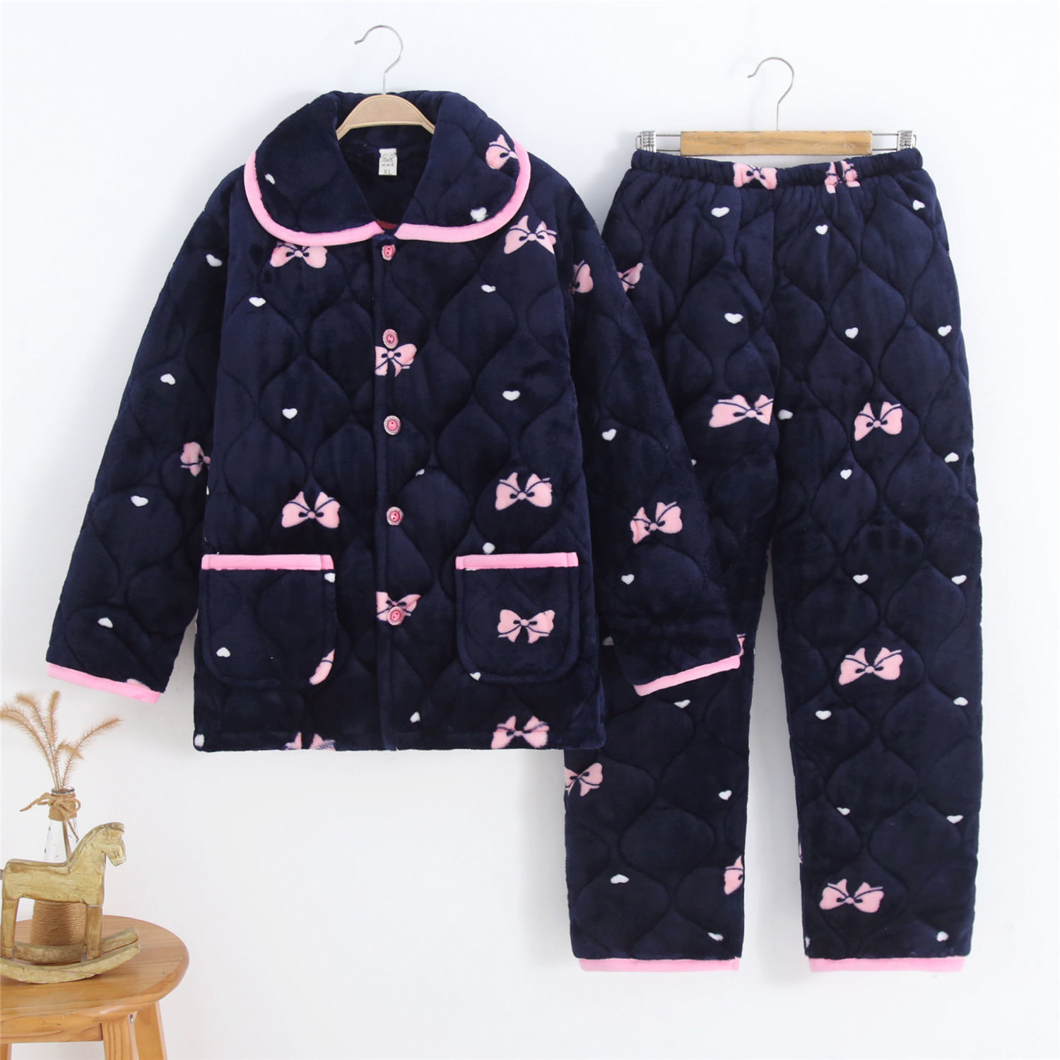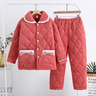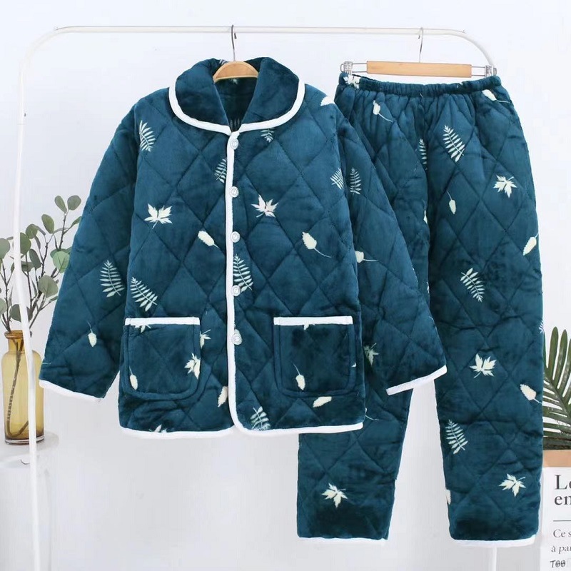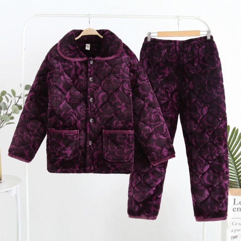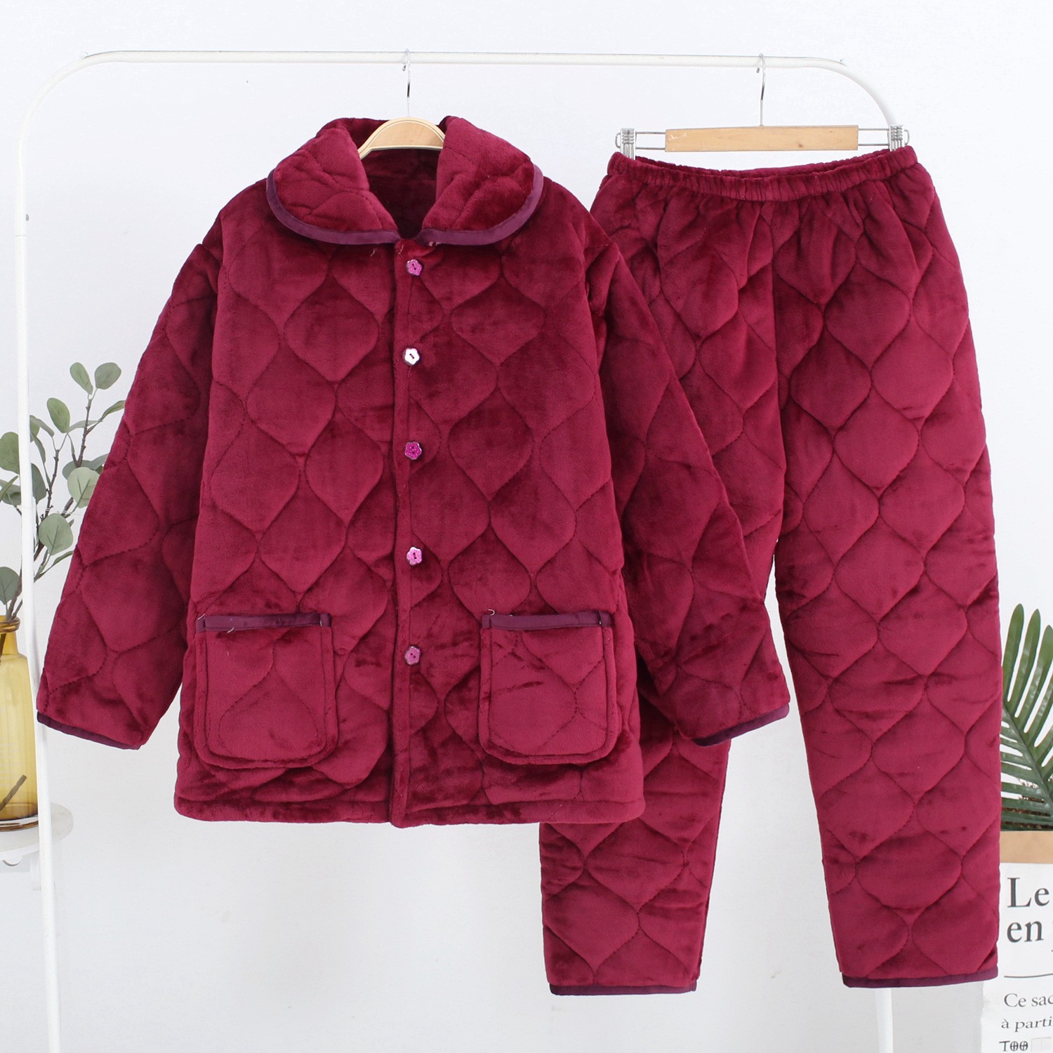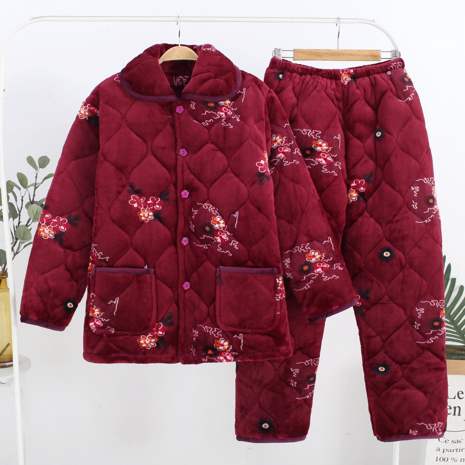 겨울 두꺼운 중년 및 노인 산호 양털 파자마 3 층 퀼트 플러스 사이즈 면 패딩 재킷 플란넬 따뜻한 여성 가정 옷